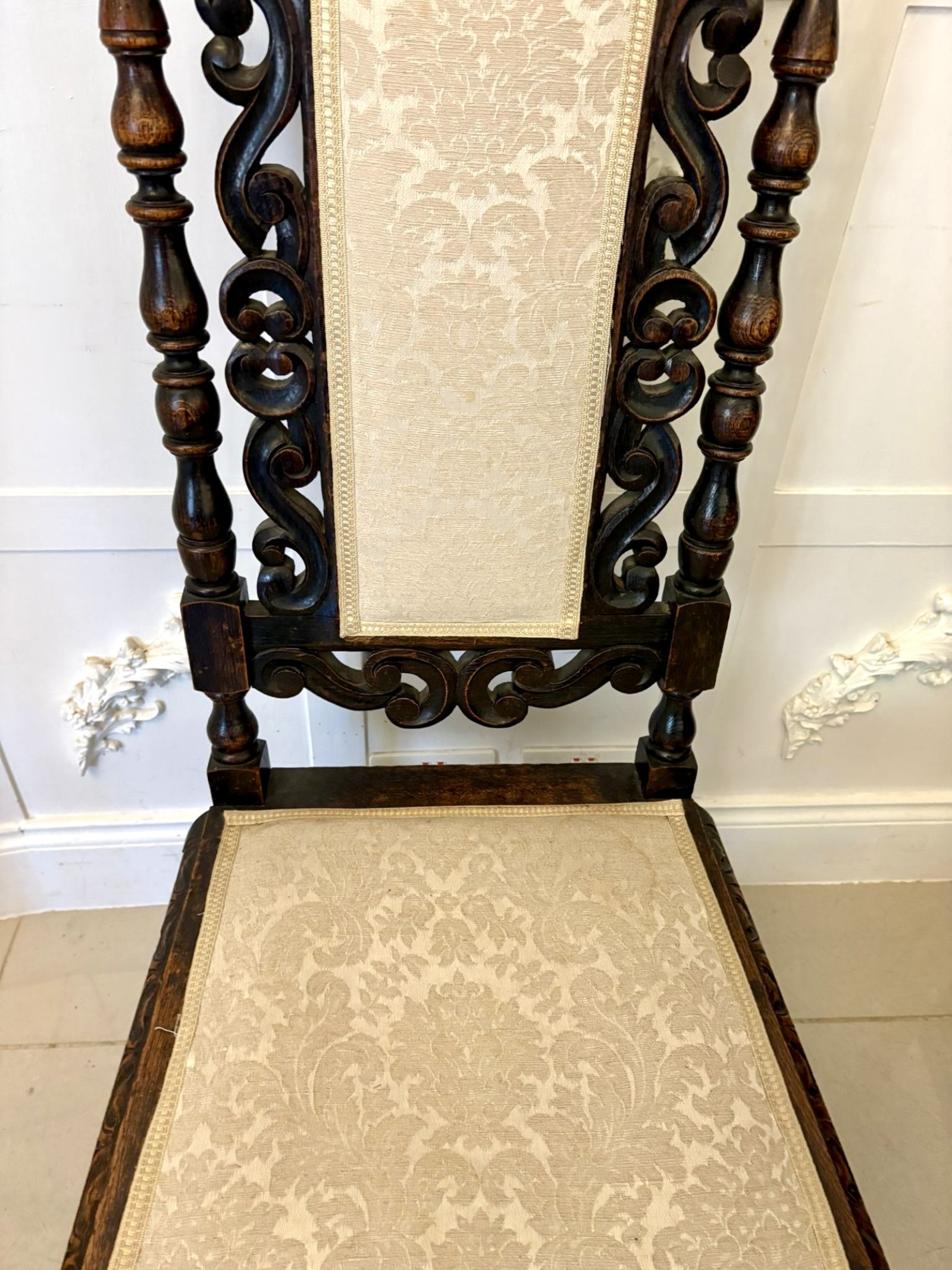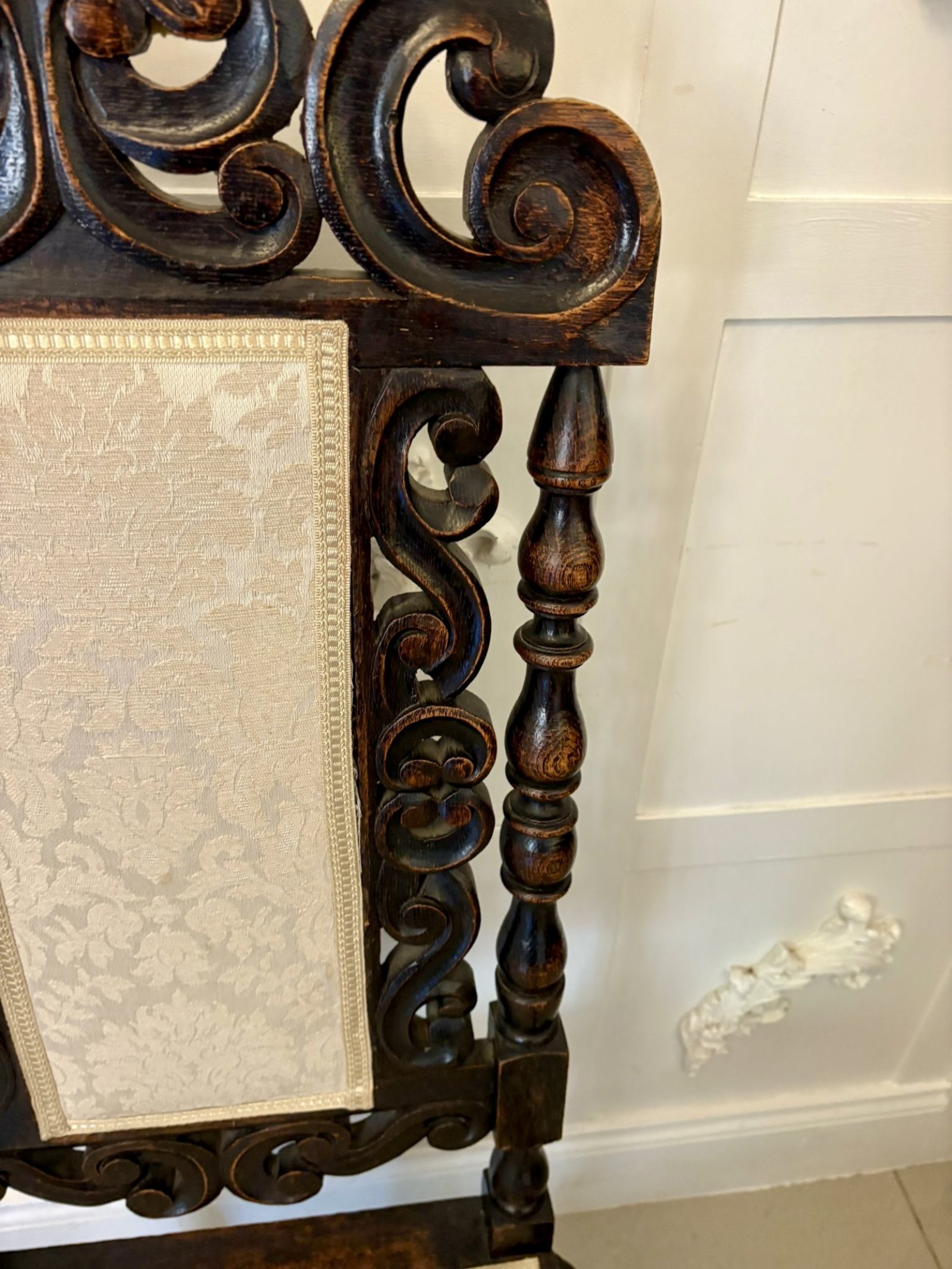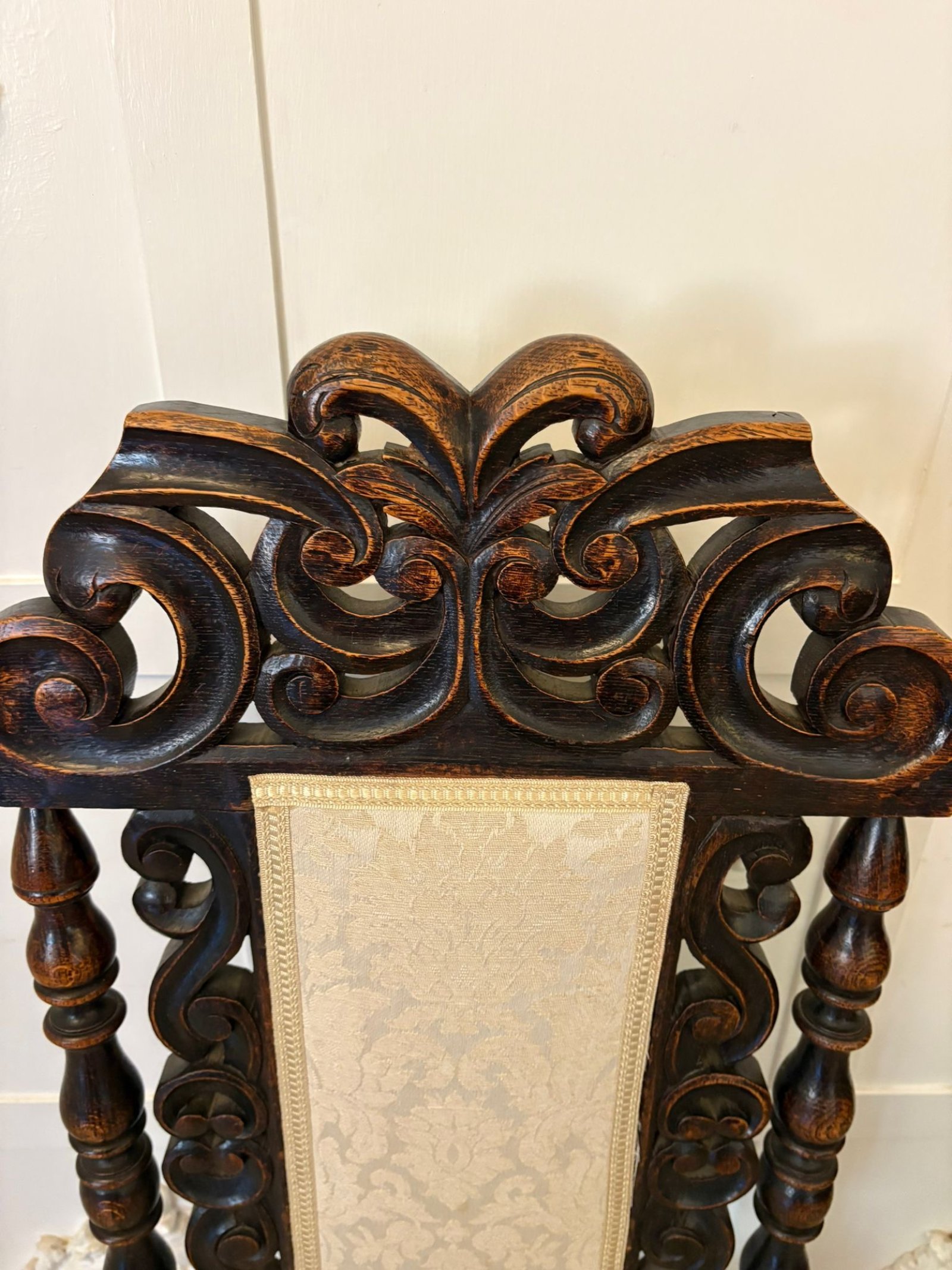 The tall backs are inset with pale damask panels that contrast beautifully with the dark oak frames creating a refined and inviting look. Each chair features a broad, comfortable seat framed with carved edging supported by shaped front legs and united by decorative stretchers. Their proportions and solidity make them ideal for use around a dining table, while still offering versatility elsewhere in the home.