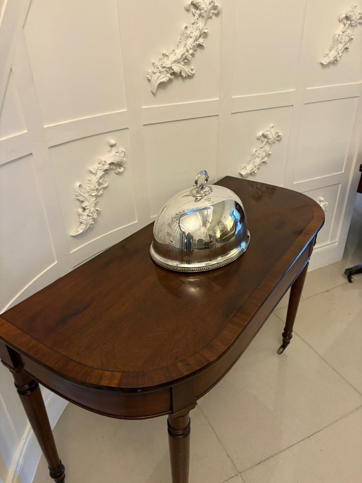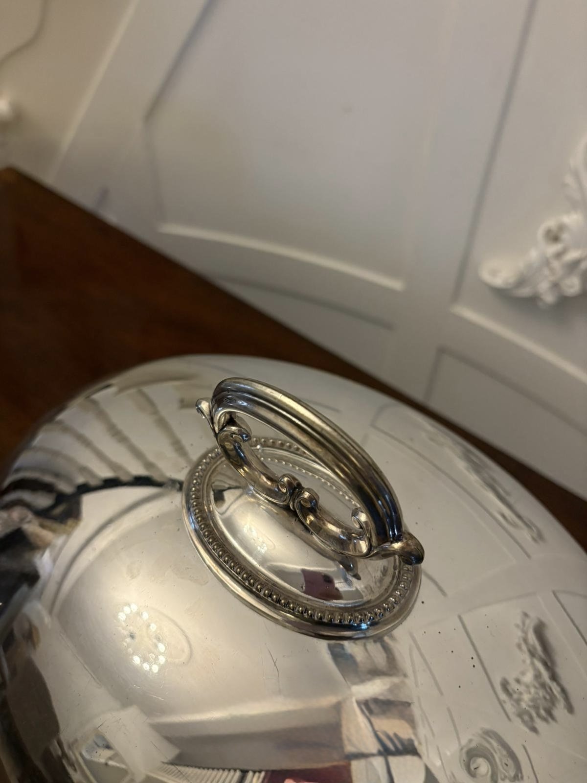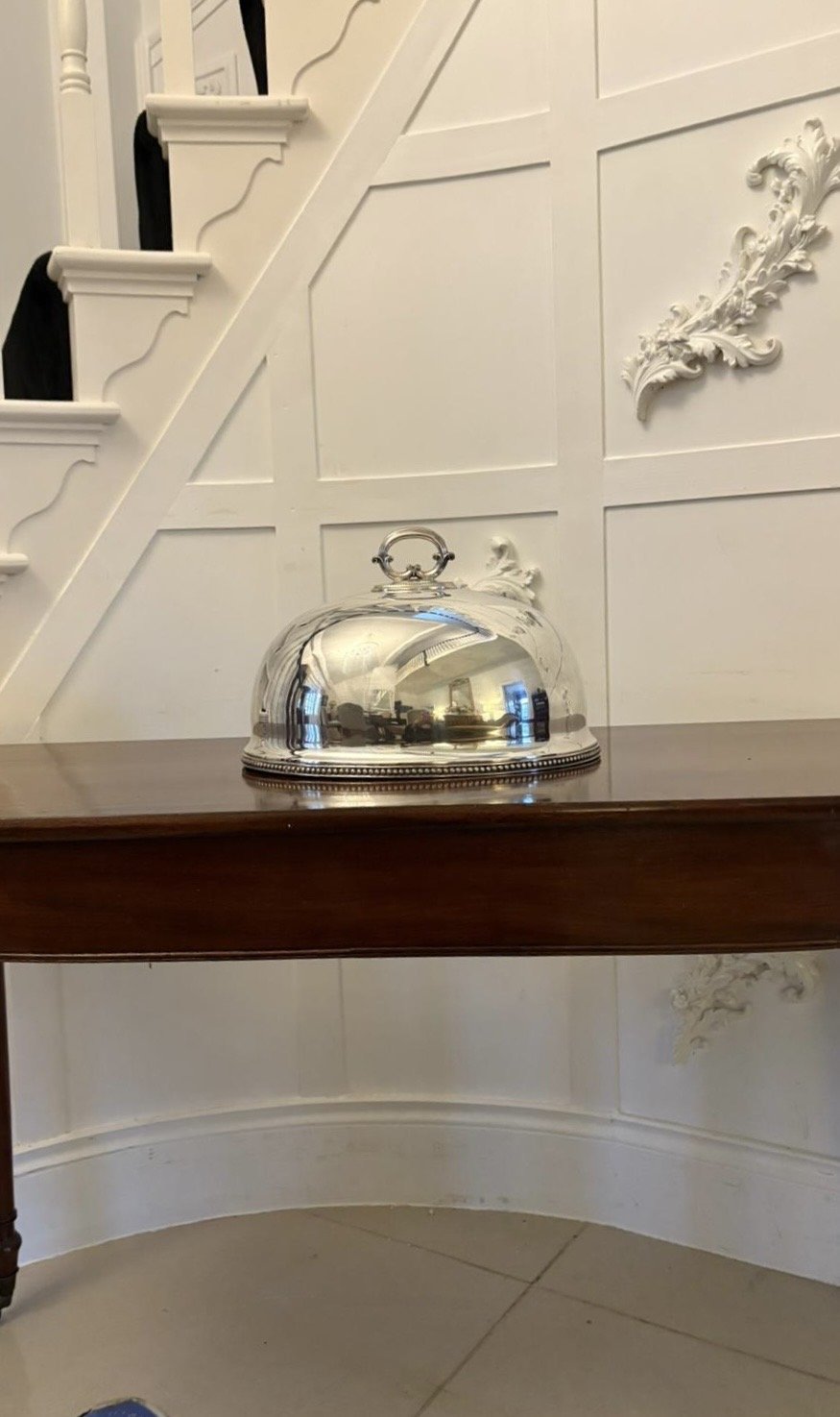 Antique Victorian quality silver plated meat cover having an ornate shaped handle above a silver plated meat dome with a beaded edge