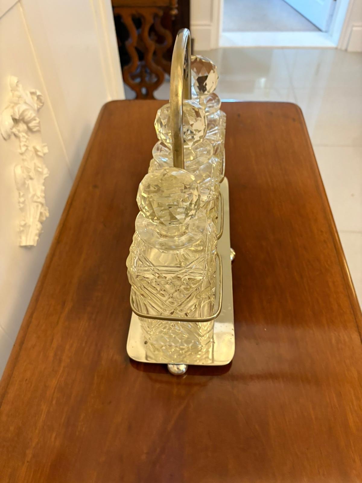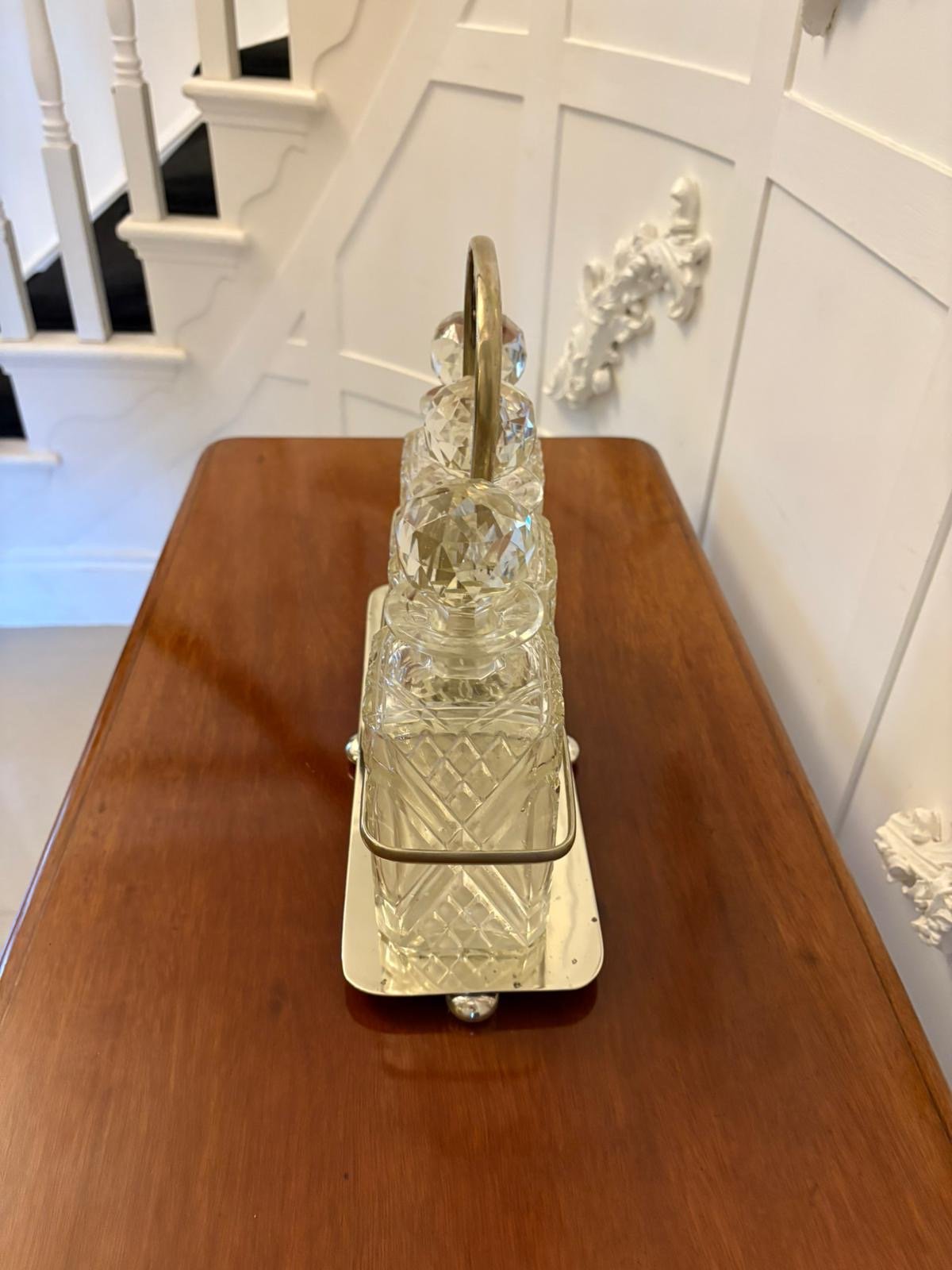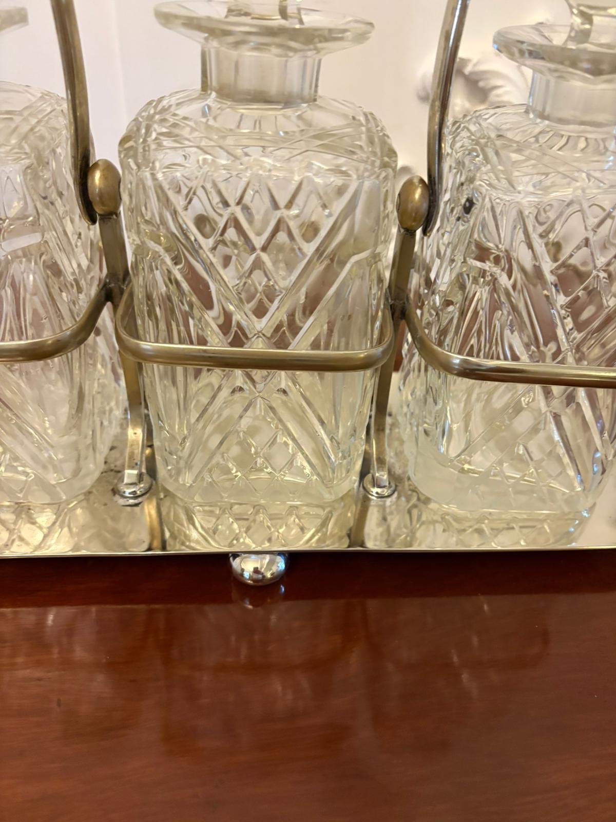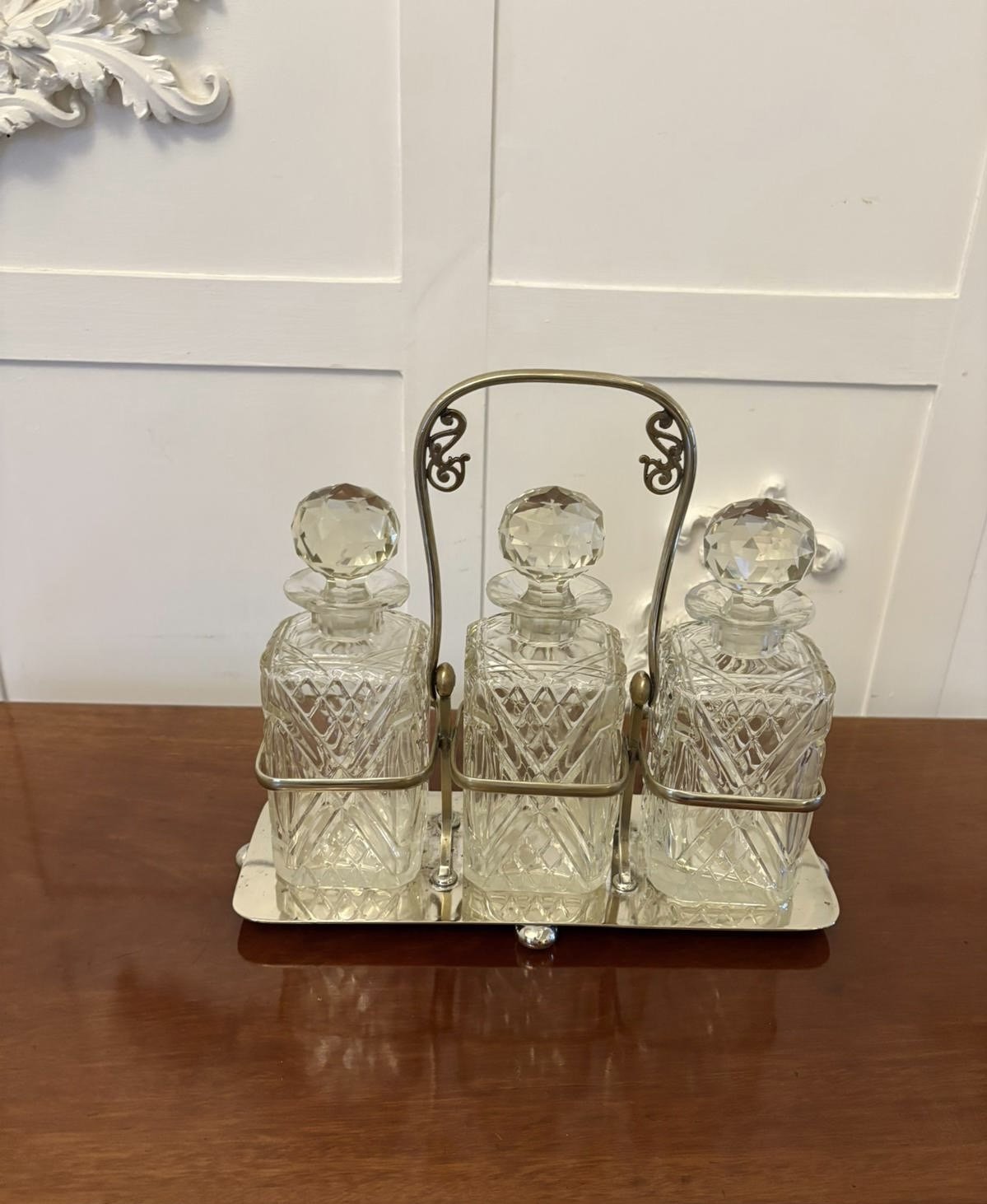 Antique Victorian quality silver plated tantalus having a quality silver plated tantalus with a carrying swing handle and three cut glass square decanters with original stoppers