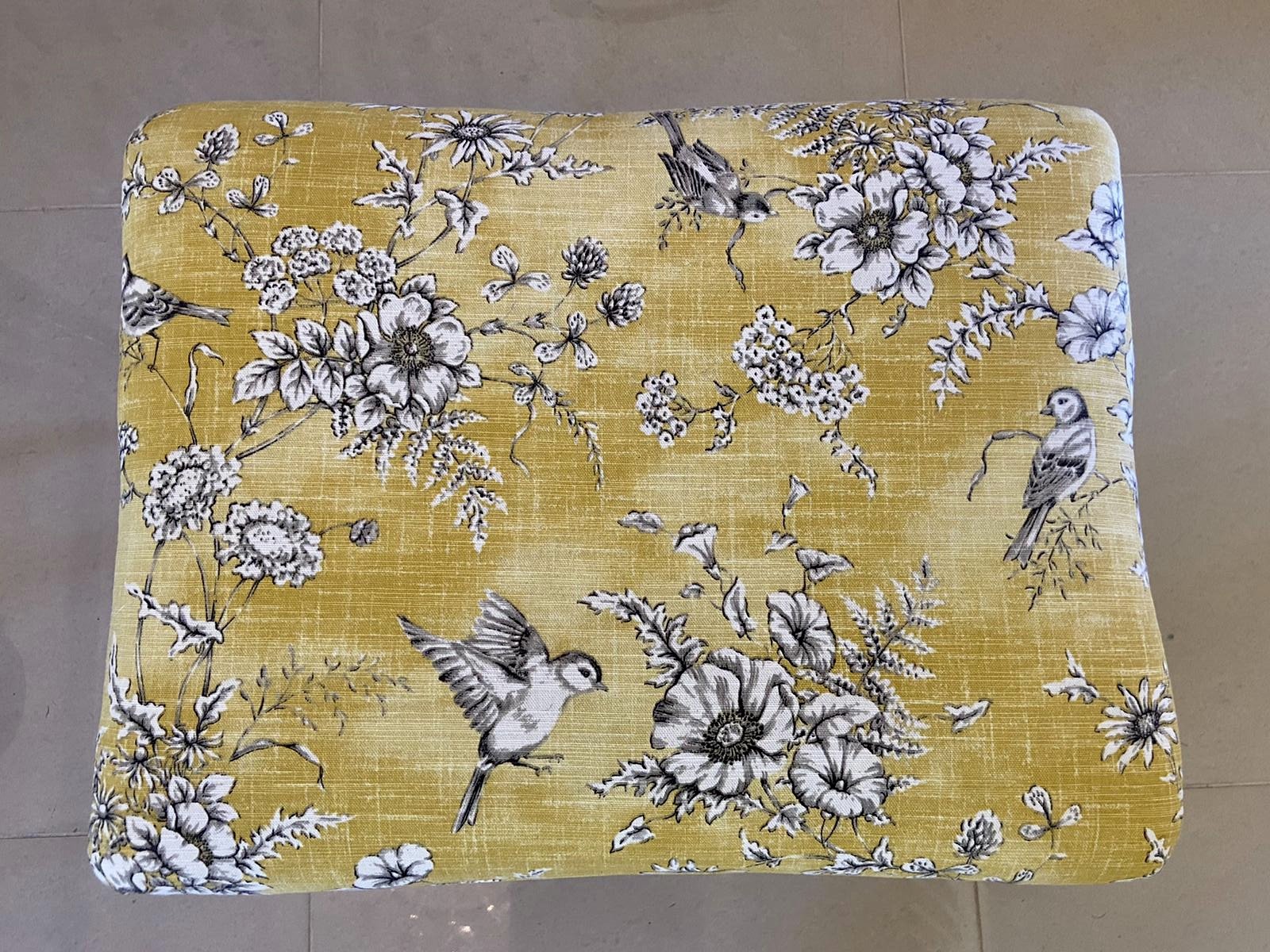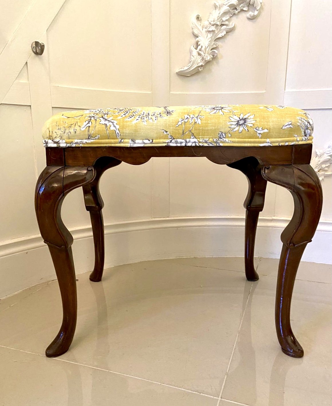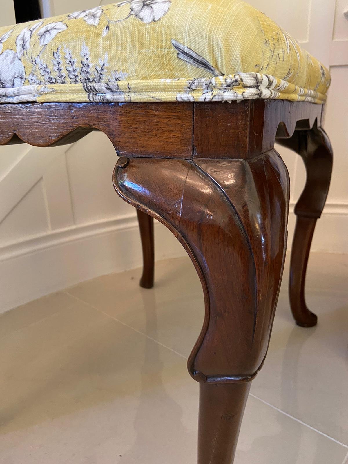 Antique Victorian walnut stool having a pretty newly upholstered seat in a quality fabric depicting finches and wild flowers. It is raised on superb solid walnut cabriole legs with a pad foot.