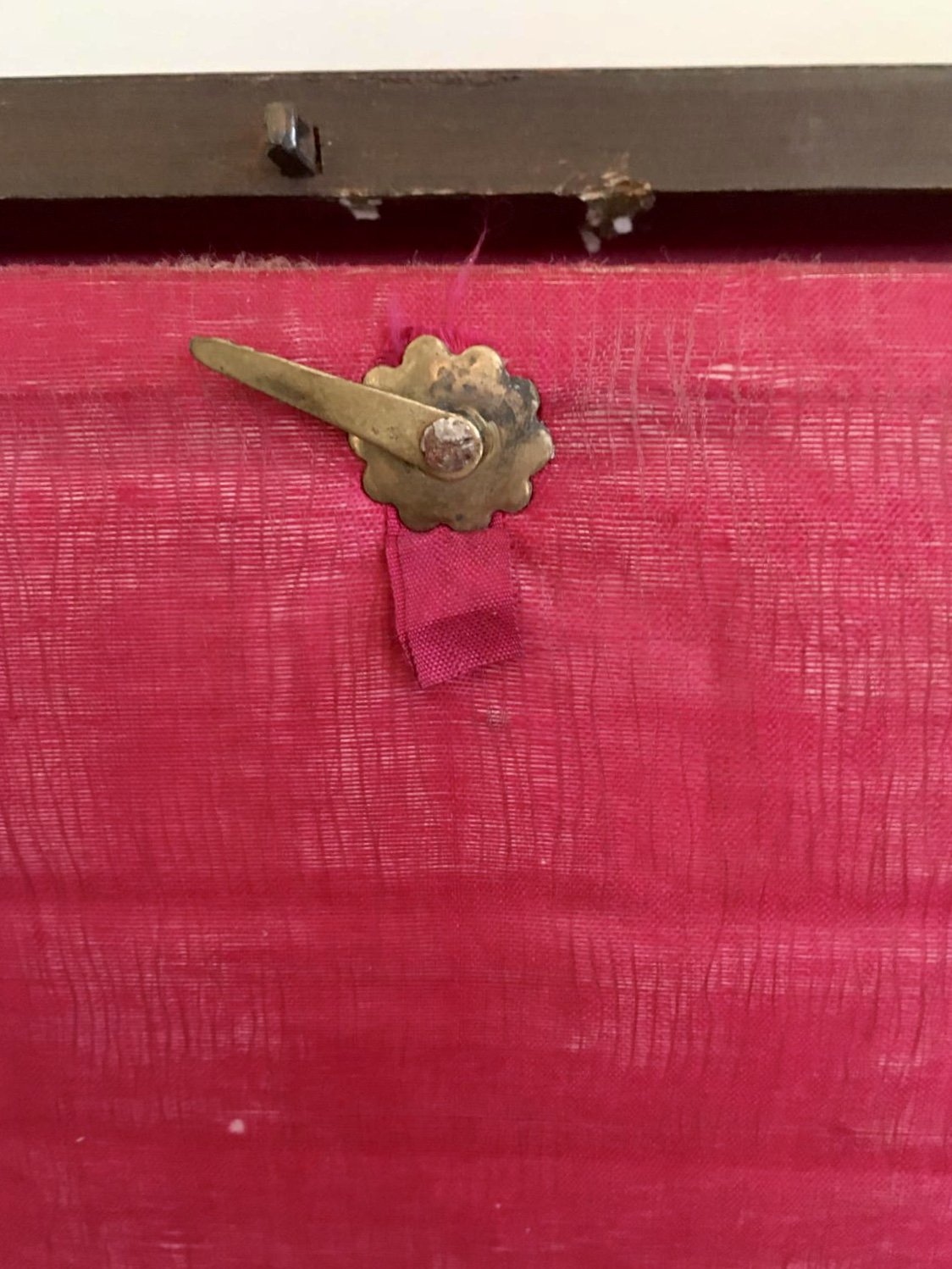 Victorian Rosewood and mother-of-pearl jewellery/sewing box having pretty pewter and mother-of-pearl inlay to the top and side, mother-of-pearl lock escutcheon, original pink interior with concertina pouch and removable tray.
