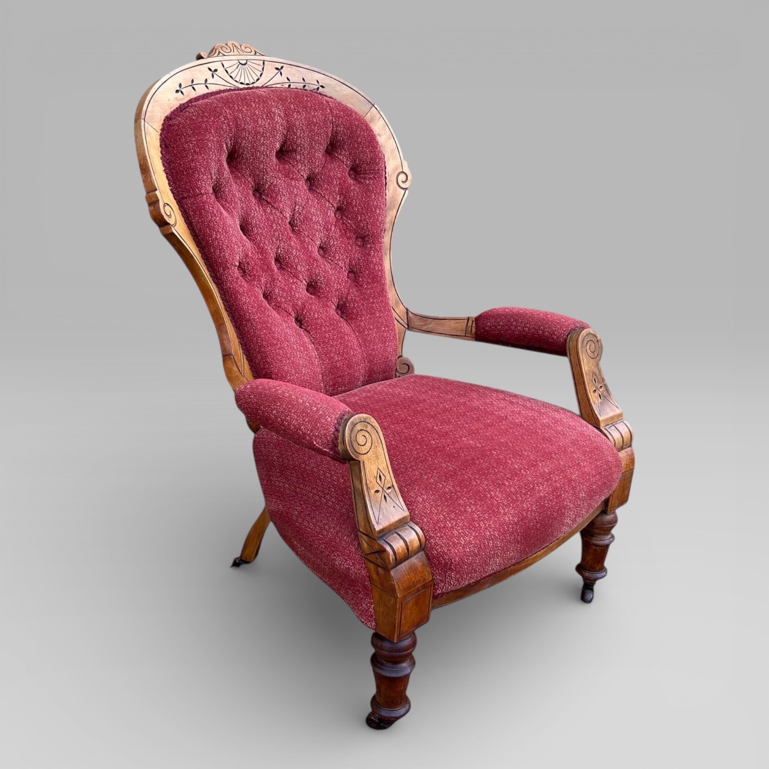 Here we have an antique English Victorian (1837-1901) satin Burch red button back armchair on turned legs with casters. The satin Burch frame has a beautiful engraved floral detailing throughout.