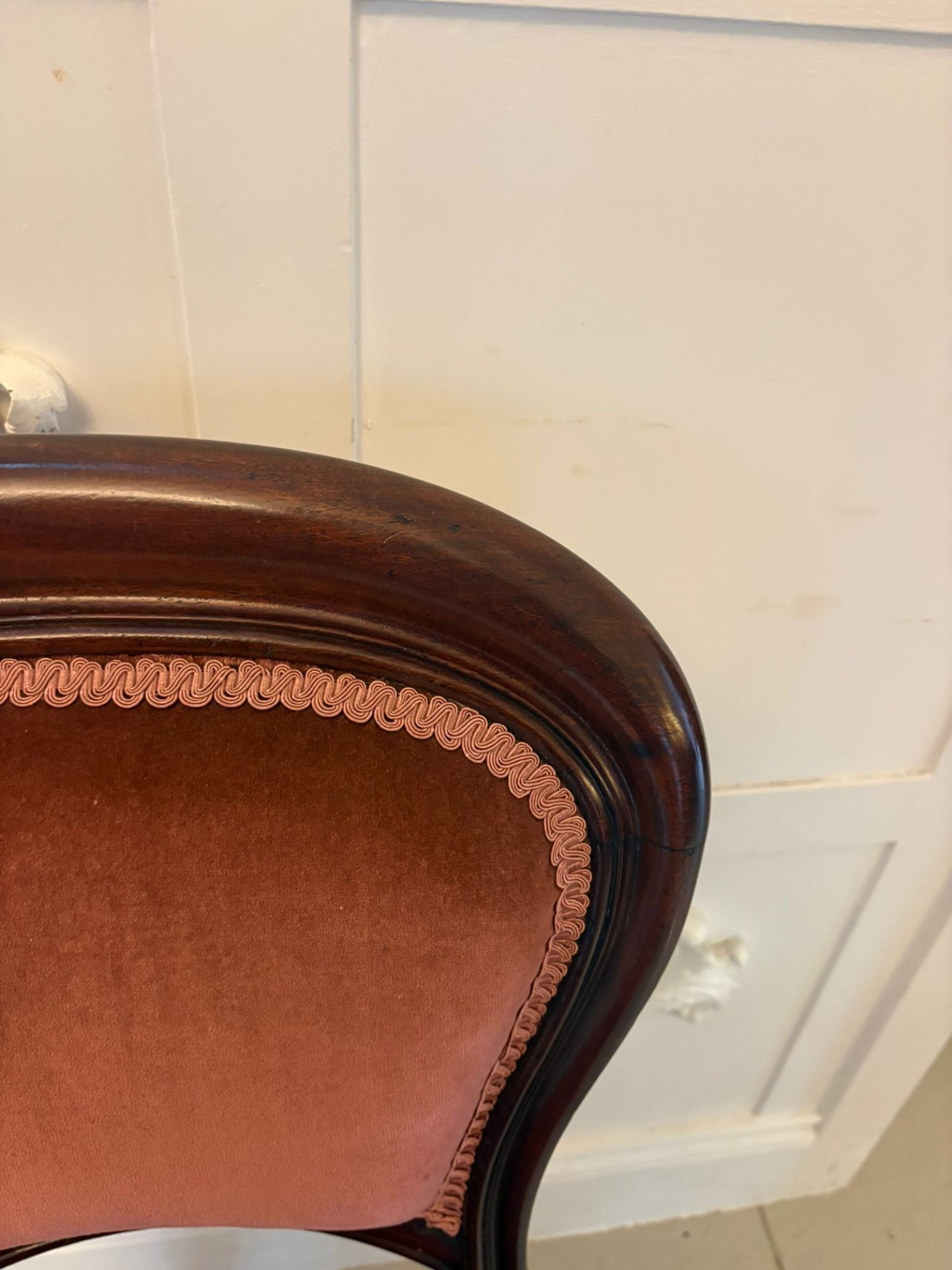 They stand on finely turned tulip legs to the front, with swept rear legs, giving the set a refined and decorative stance. The colour of the mahogany is rich and warm, complementing the upholstery beautifully and highlighting the quality of the timber.