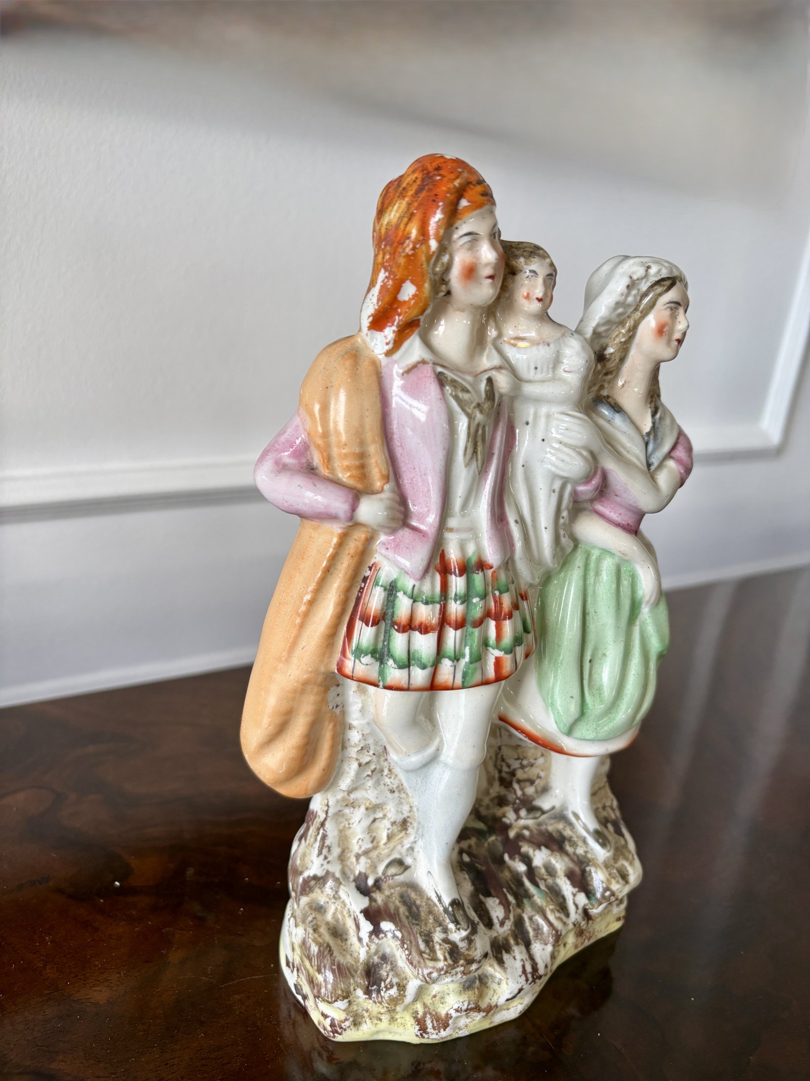 Antique Staffordshire figure of a couple in period dress holding a baby. In original condition, no cracks, chips or repairs