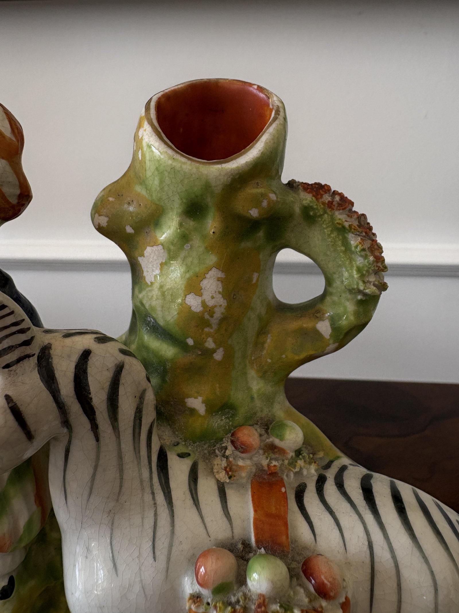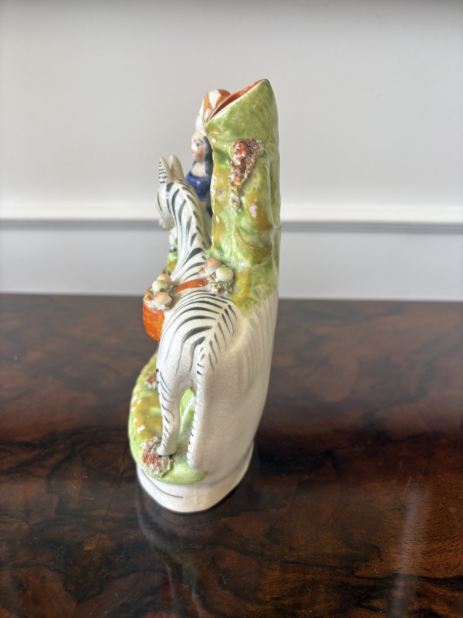Antique Victorian Staffordshire flatback figure of a lady in period dress with a zebra carrying provisions beneath a spill vase