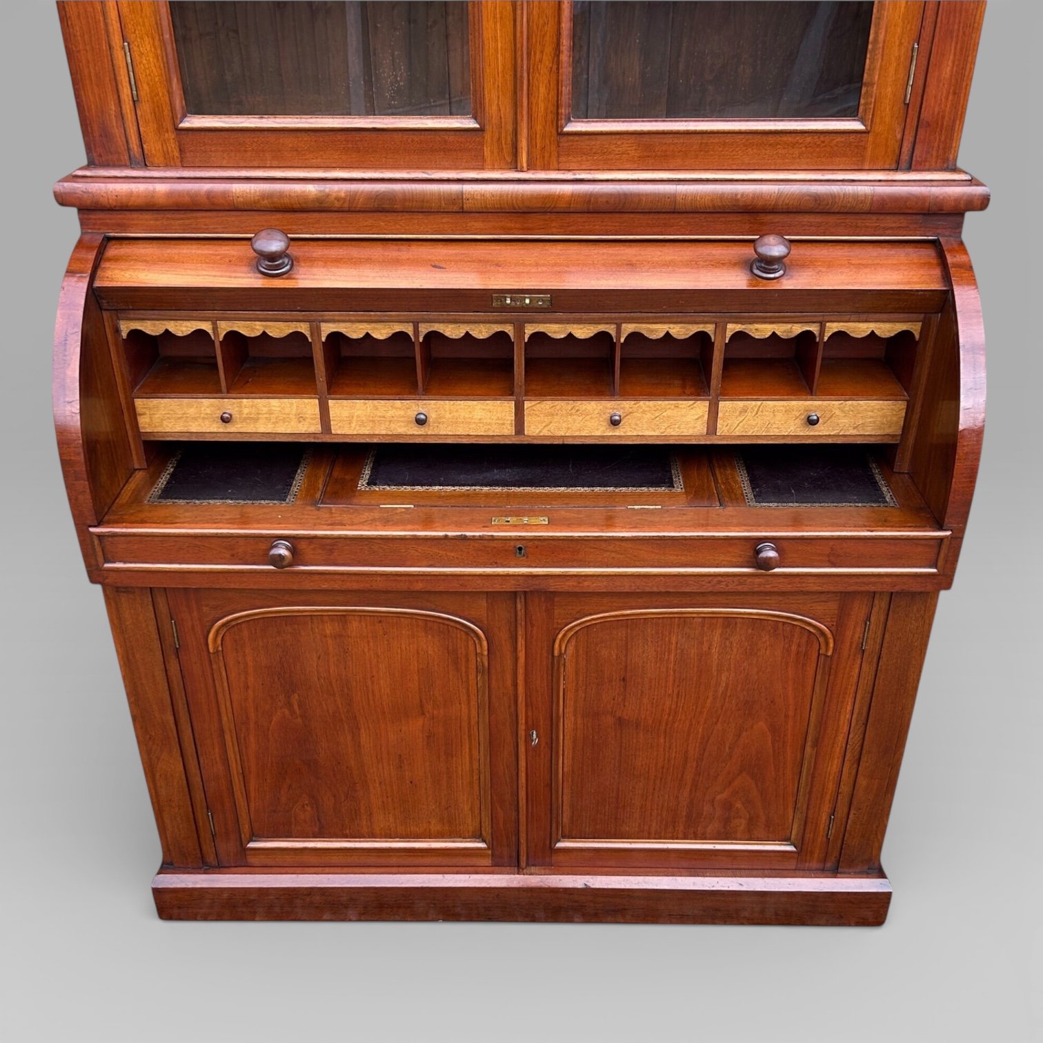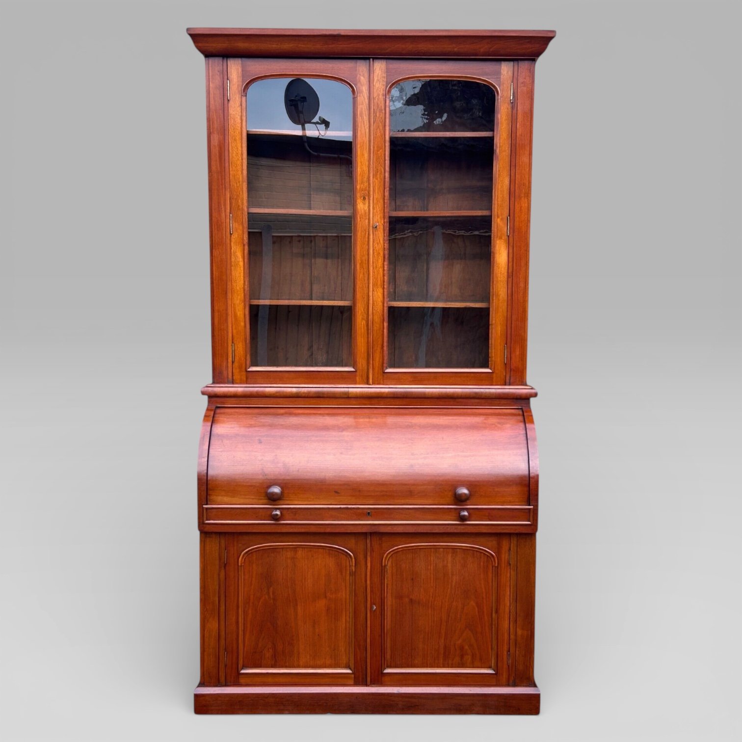 Antique Victorian Walnut Cylinder Bureau Bookcase With Writing Desk & Cupboard