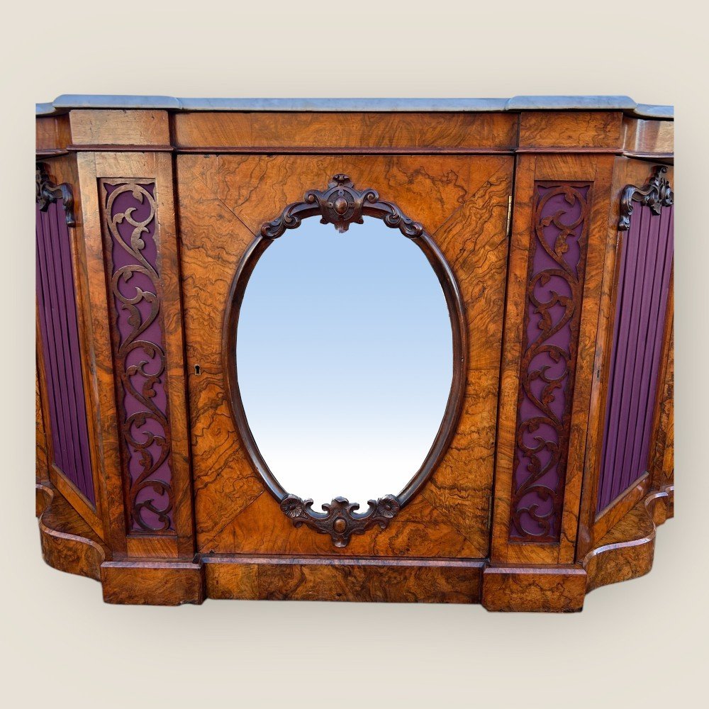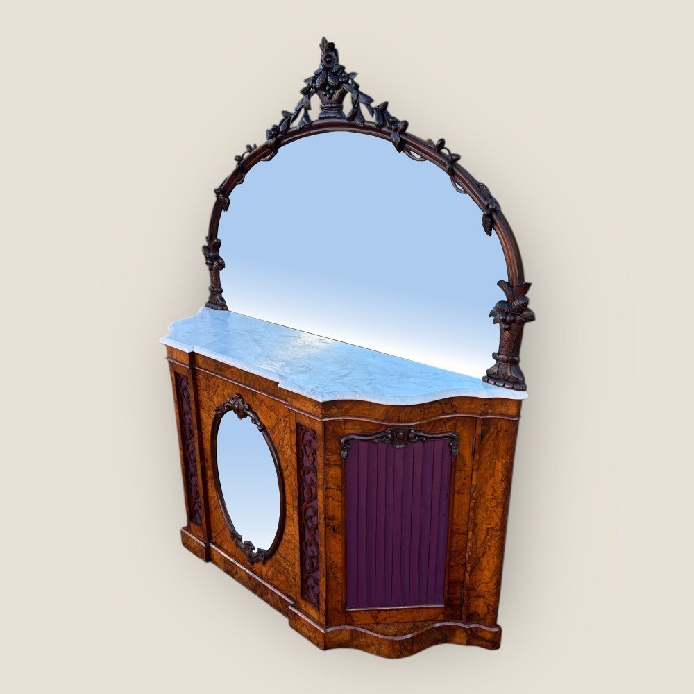 A Victorian Walnut Mirror Backed Sideboard of serpentine shape with beautiful walnut veneers and a bevelled white marble top. To the back is a magnificent carved mirror with floral carvings showing vines intertwined from the bottom to the top carved centrepiece. The sideboard has purple pleated fabric doors with carved surrounds, which open to reveal shelving space, each side door has three shelves behind and the centre mirror fronted door opens to reveal two shelves.