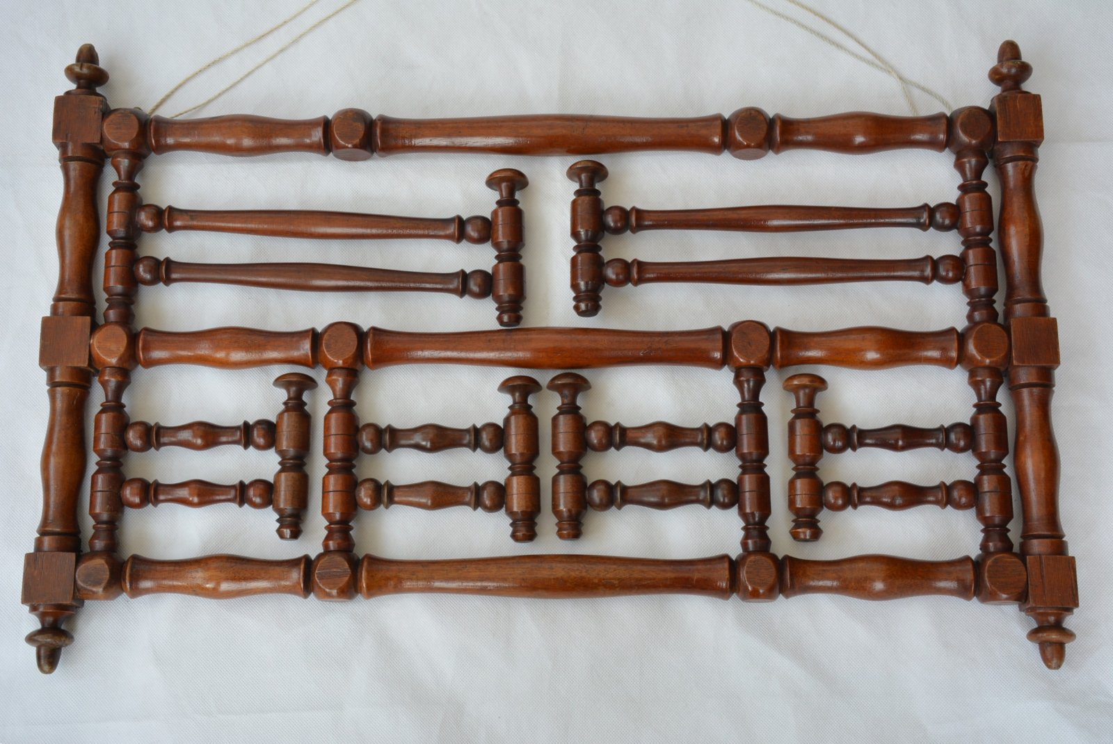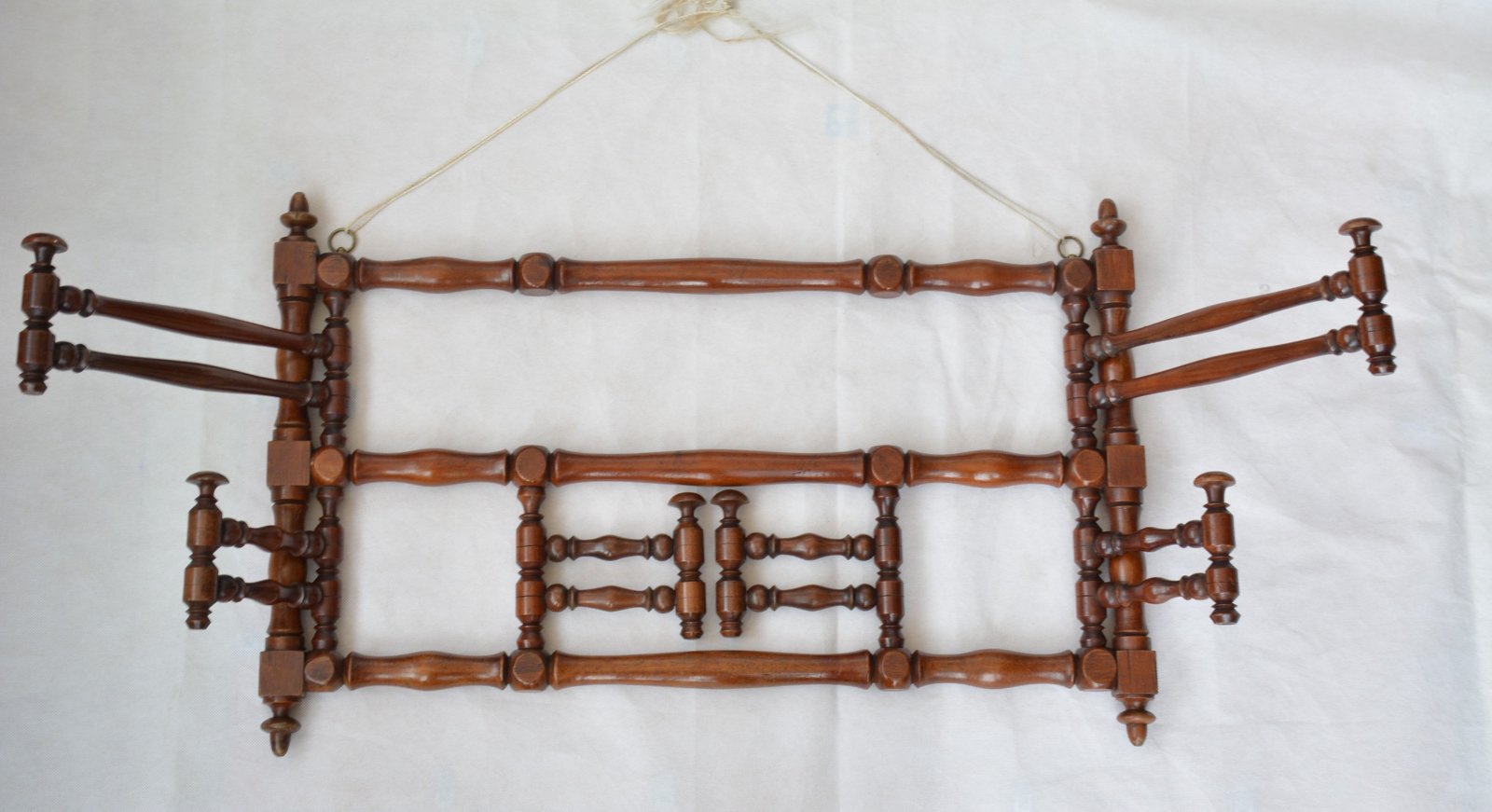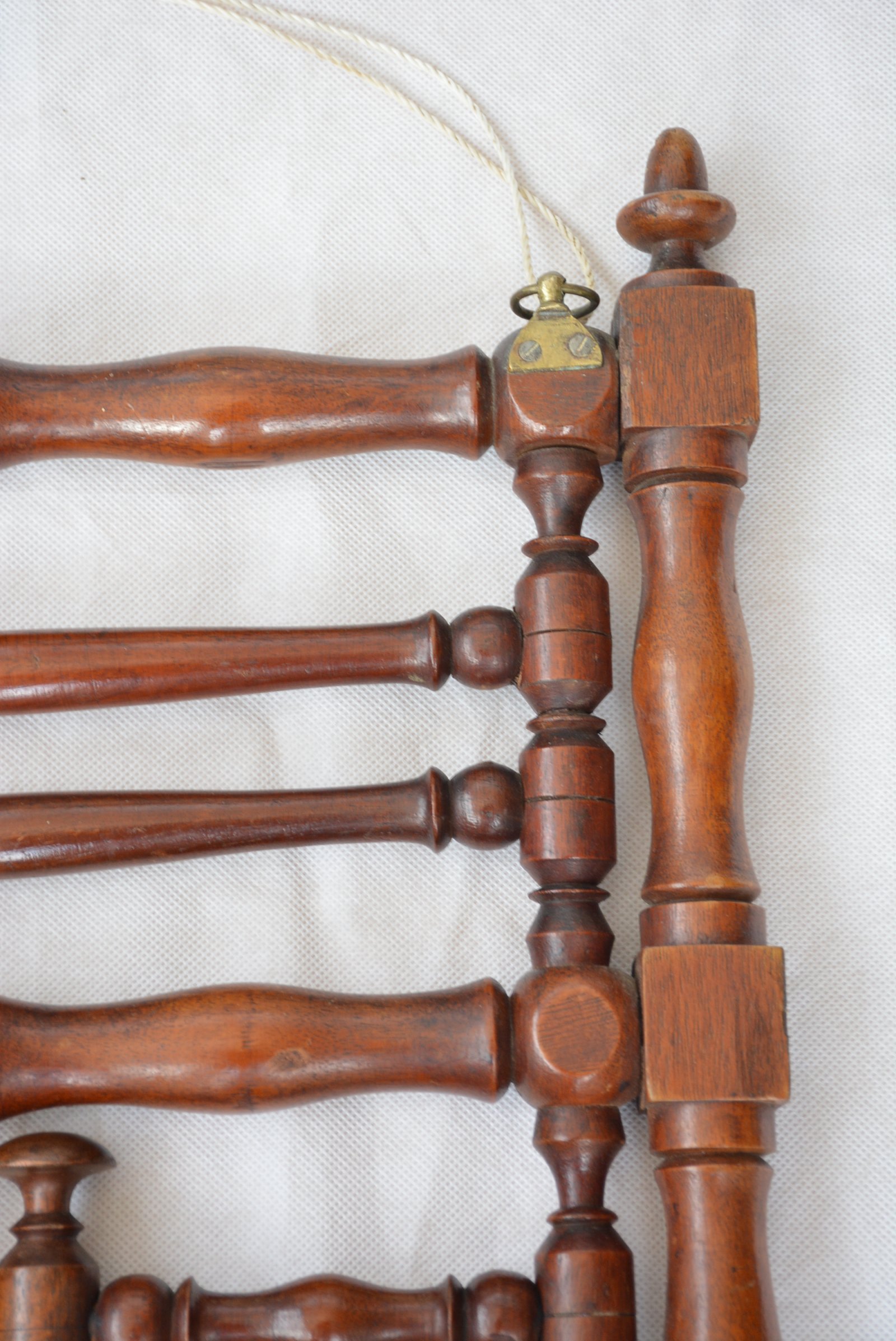 P0320 Stylish and very attractive wall mounted, turned coat and hat rack, originally used as wig rack, having two long and four short turned and swivelling hat and coat hooks. All in home ready condition. No woodworm, solid and sturdy. Original finish has been cleaned and waxed. Soft mellow colour and light patina. c1900