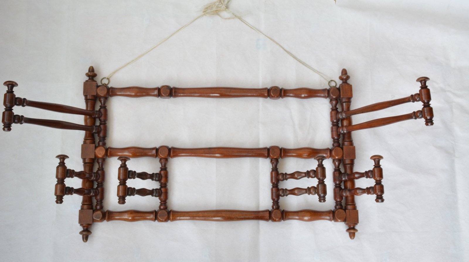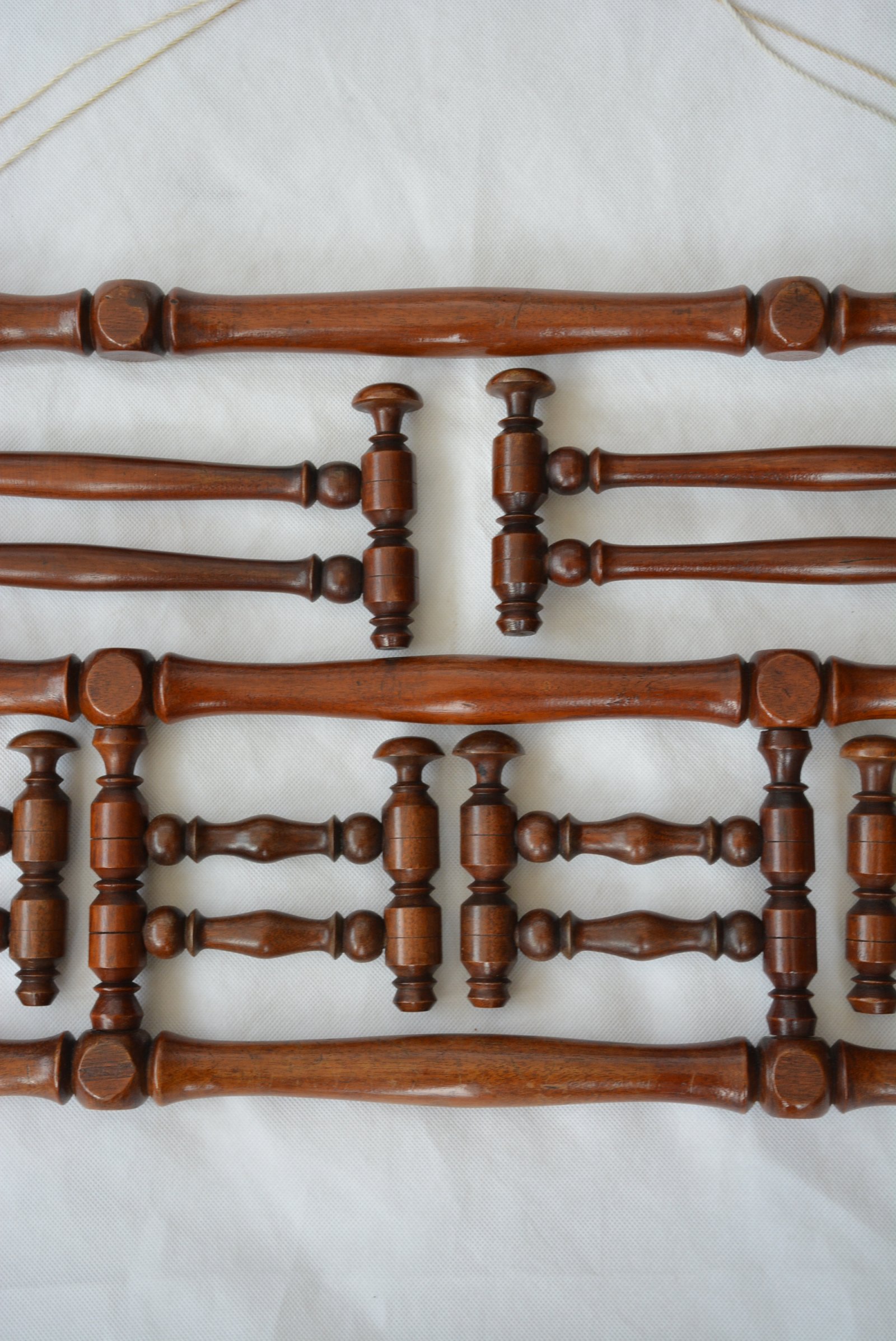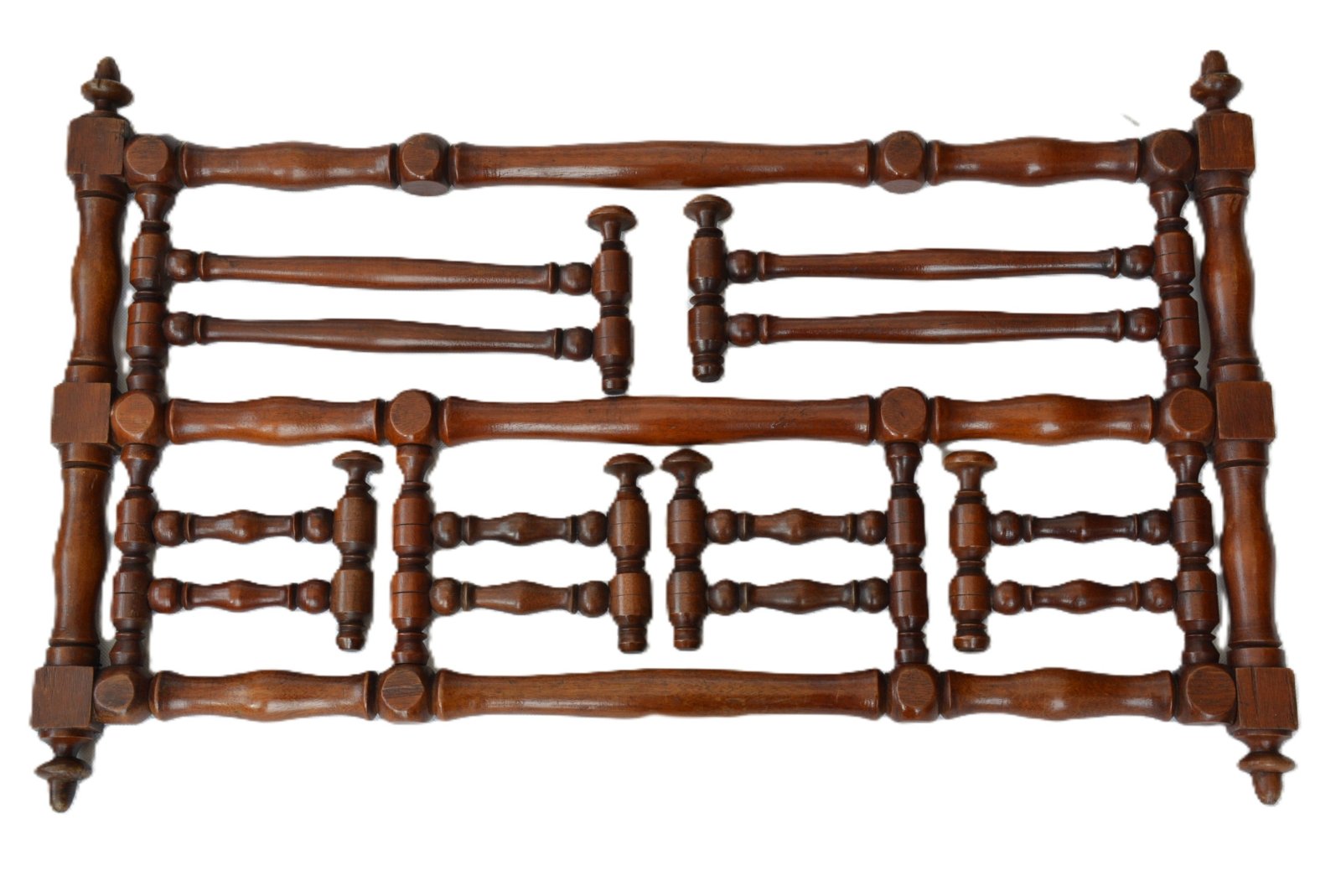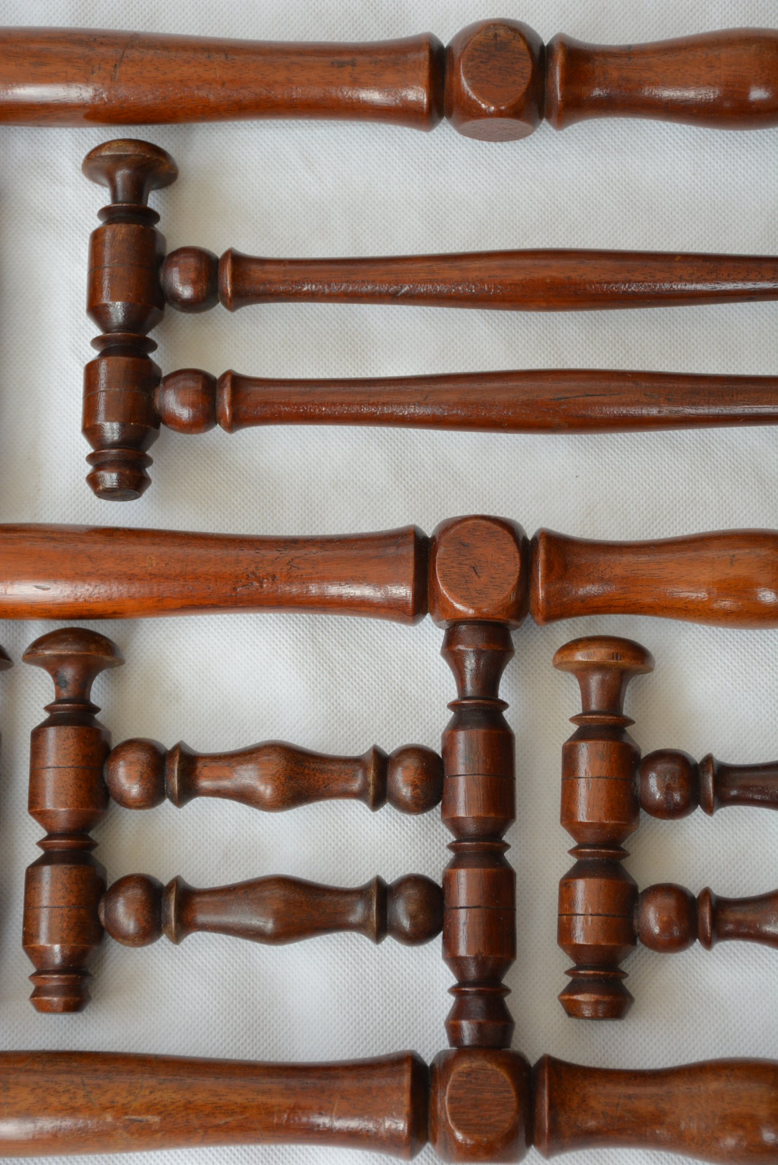P0320 Stylish and very attractive wall mounted, turned coat and hat rack, originally used as wig rack, having two long and four short turned and swivelling hat and coat hooks. All in home ready condition. No woodworm, solid and sturdy. Original finish has been cleaned and waxed. Soft mellow colour and light patina. c1900