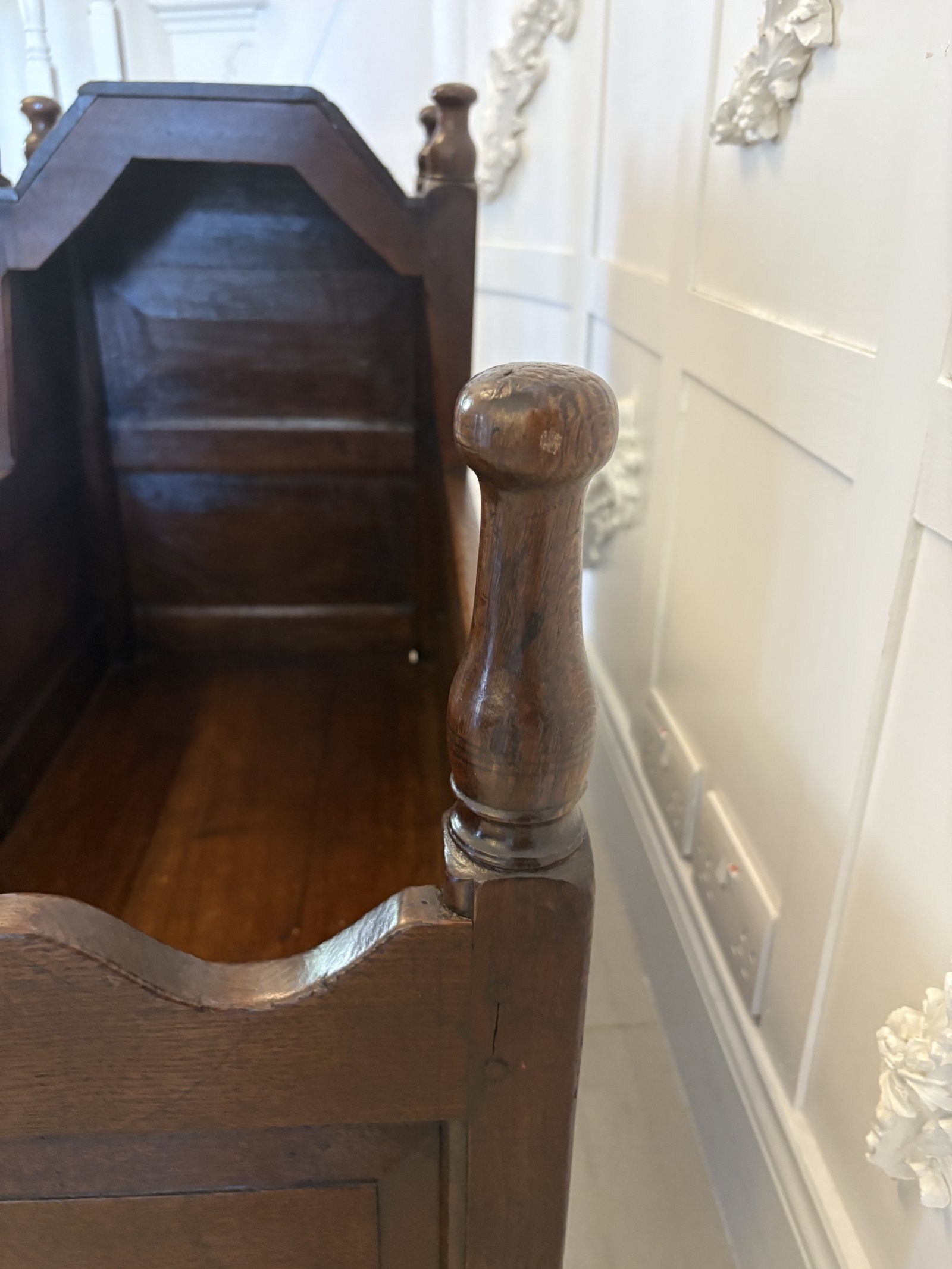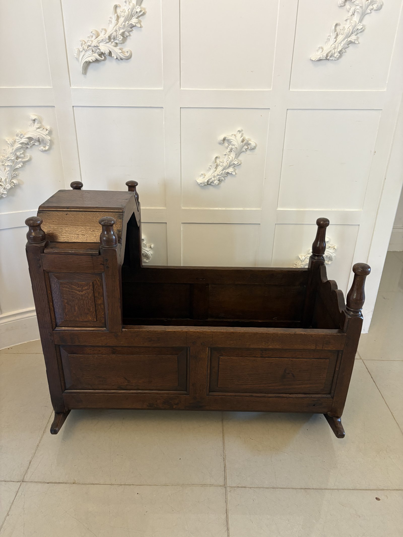Antique William and Mary quality oak panelled rocking crib having a quality oak shaped hood, six turned finales, lovely oak panels standing on shaped oak rockers