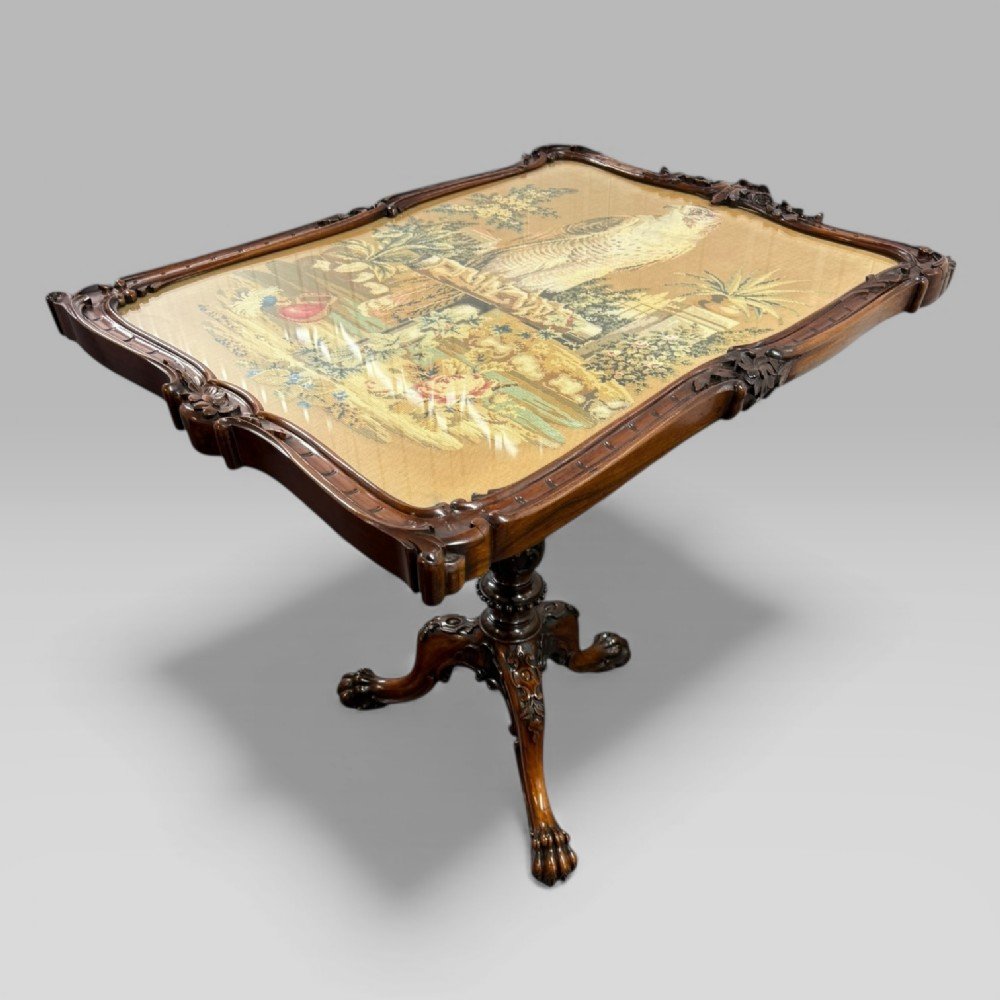 Condition: A superb condition 190 year old table. On the needlework there is a very slight tear to the reverse (shown in pictures), which does not affect the front scene.