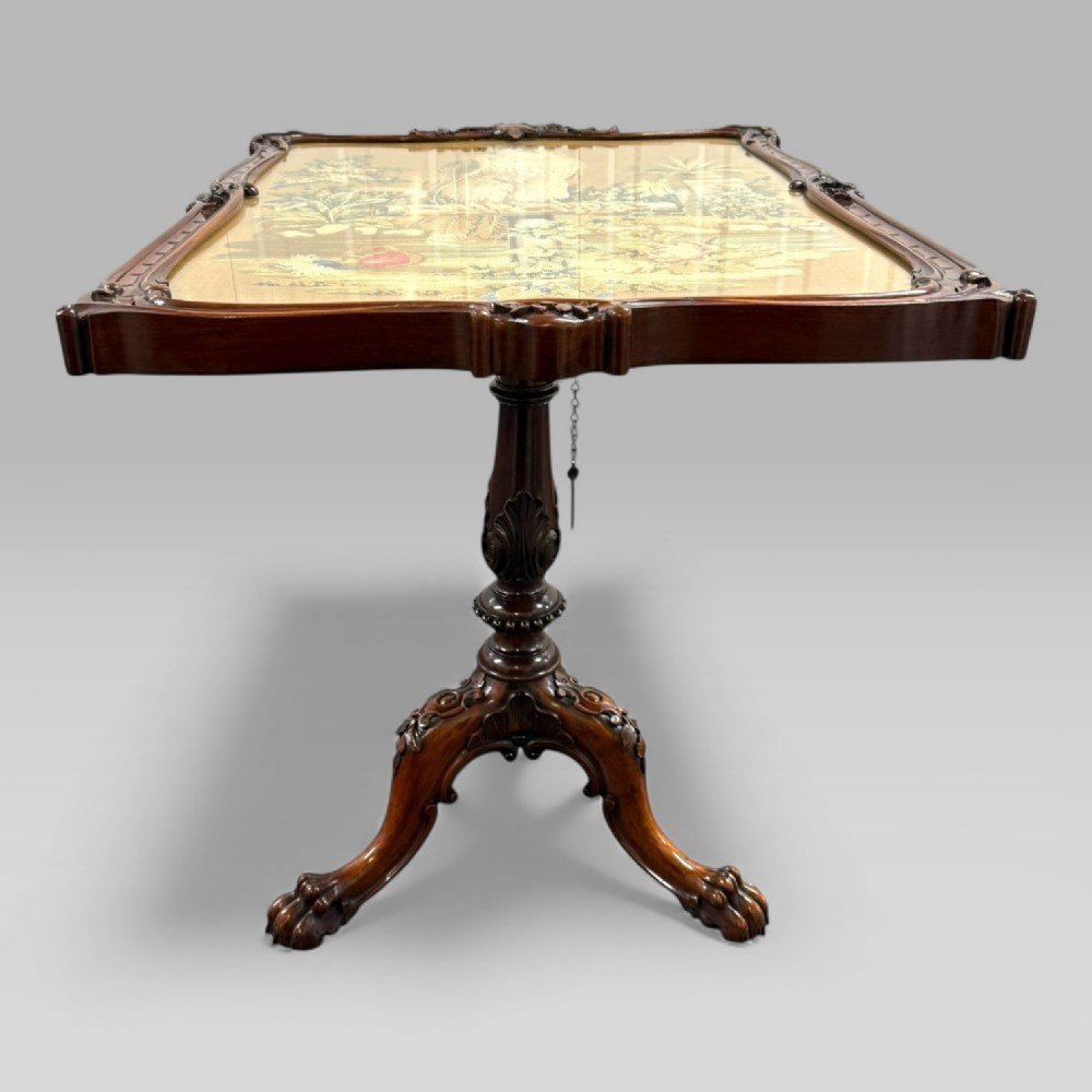 The piece is conceived primarily as a side table of superb quality, distinguished by a rectangular top framed with finely carved floral detail. At the centre lies a glass-protected panel enclosing a needlework scene of considerable charm. Ingeniously designed, the top can be tilted upright, allowing the table to serve as a fire screen when required. This dual function demonstrates the practical ingenuity and refined aesthetic characteristic of Gillows’ work.