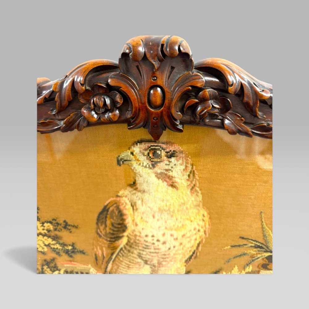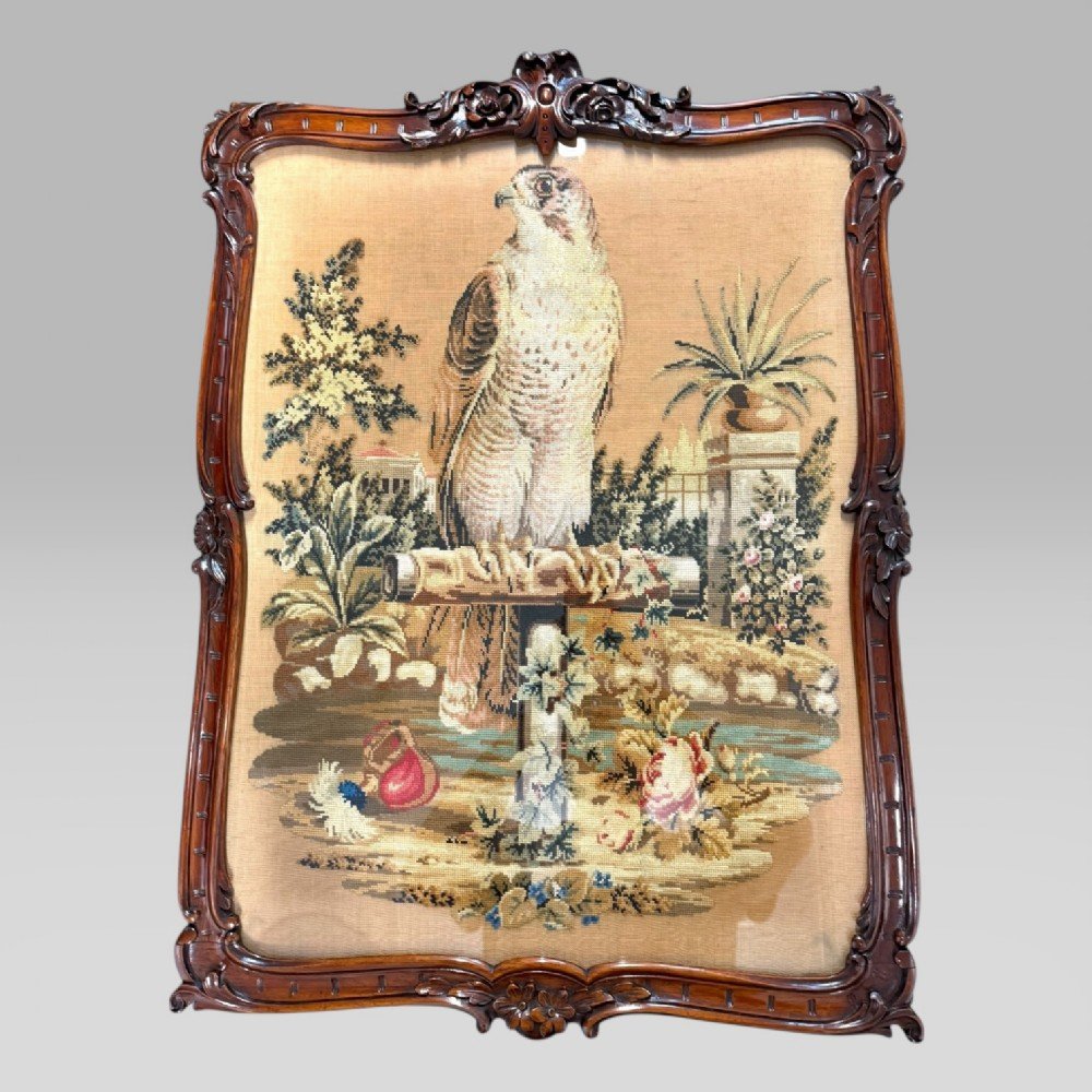 The needlework itself depicts a Persian-inspired hunting subject: a falcon standing proudly upon a perch, with Middle Eastern trees, a pond, and an architectural backdrop. In the foreground rests the falcon’s hood, a carefully observed detail that lends authenticity to the scene.