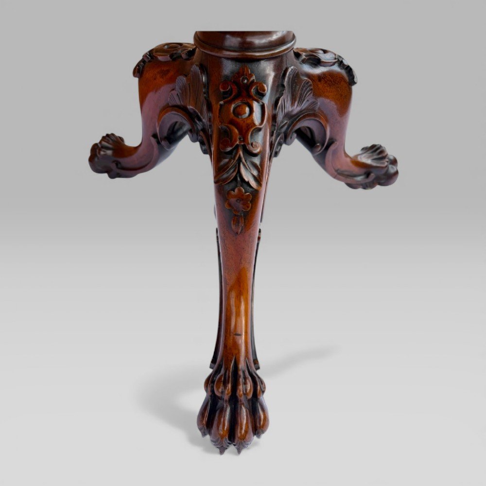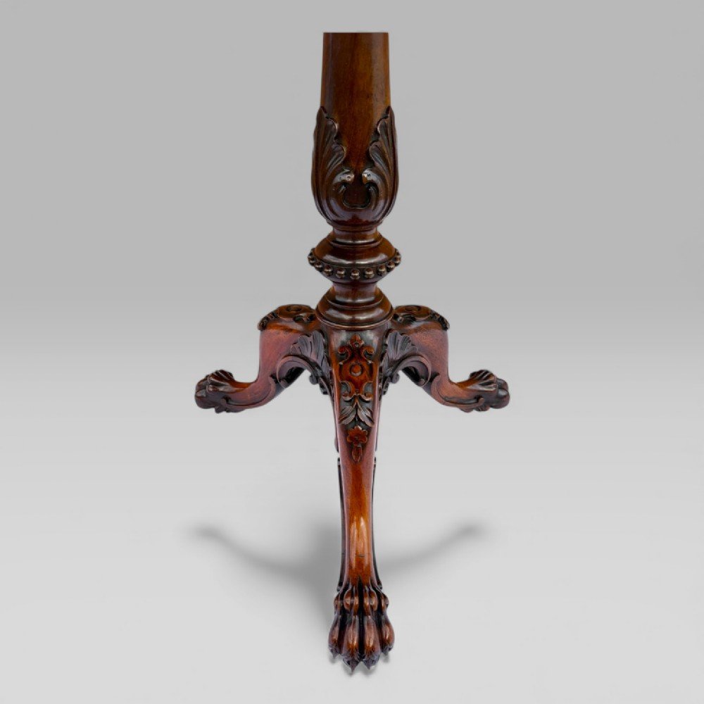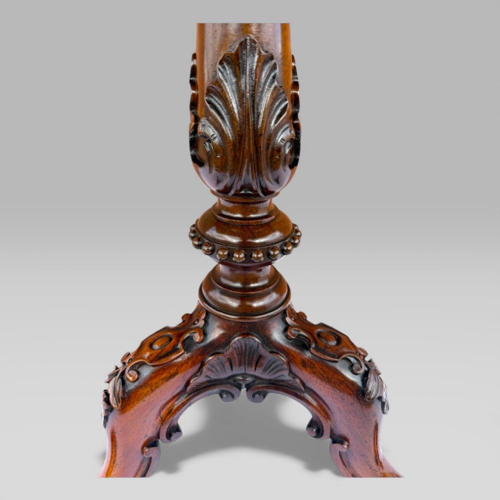 The tripod base is a particular highlight, exceptionally carved and terminating in well-defined paw feet, each set on the original “Cope’s Patent” brass casters—an innovation valued in the early 19th century for both durability and ease of movement. The overall execution of the carving, with its precision and depth, reflects the highest standards of Gillows’ workshop.
