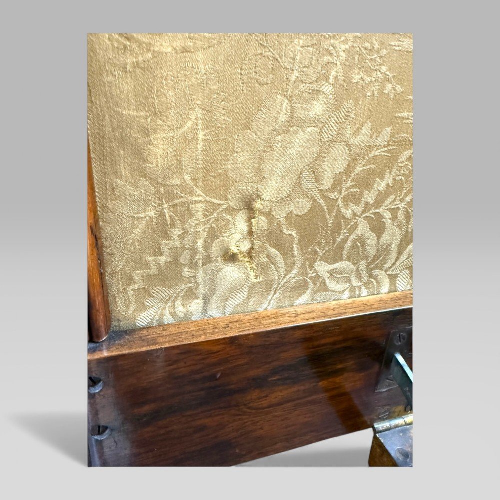A card accompanies the piece, noting that the needlework was executed by a schoolgirl in 1843. Embroidery of this kind was frequently undertaken in schoolrooms at the time and was occasionally used by cabinet makers to adorn furniture. While the base dates to the William IV period, the needlework was likely inset within a decade of its creation. Together they form a compelling narrative, uniting masterful cabinet-making with the artistry of domestic needlework.