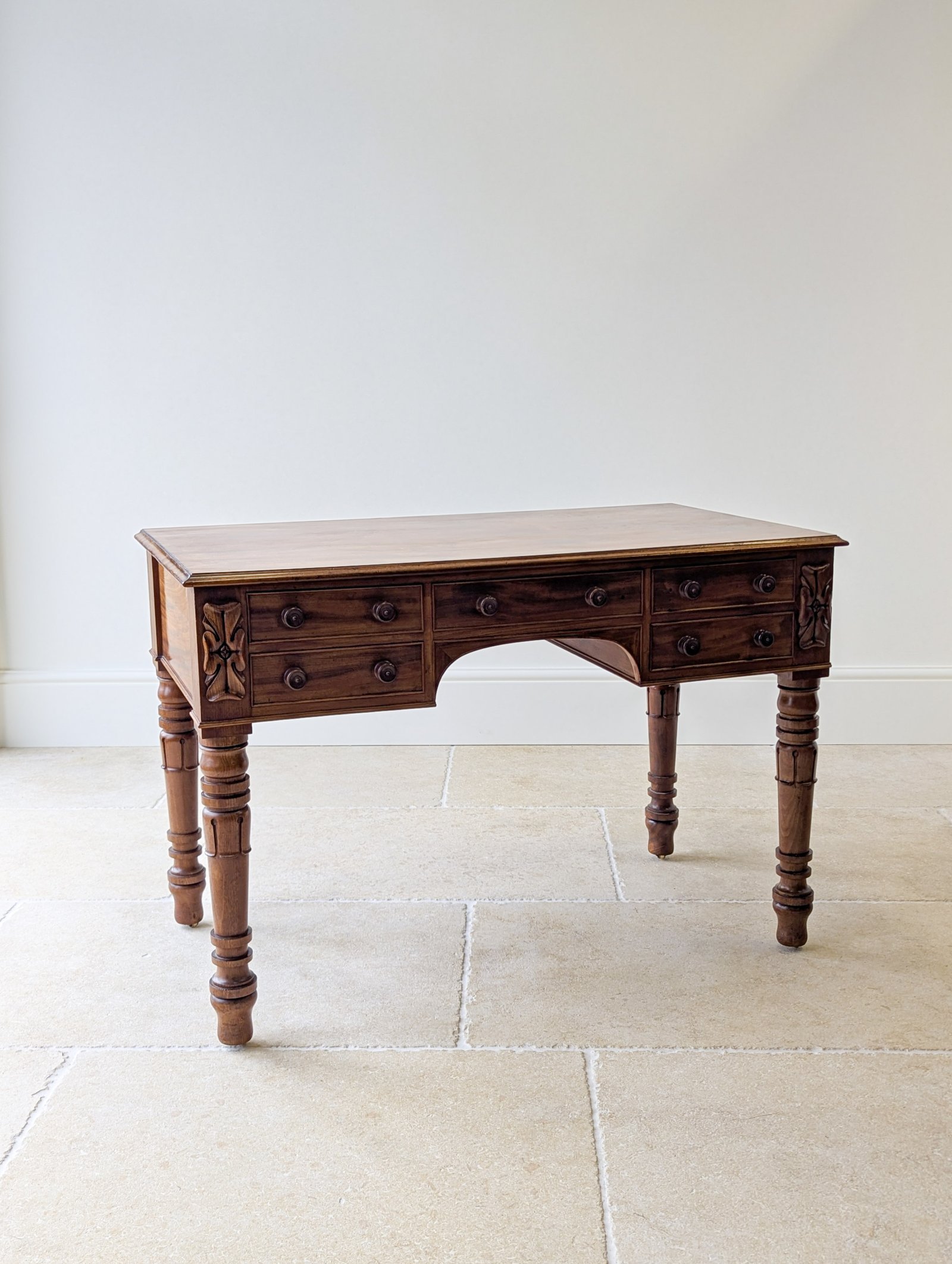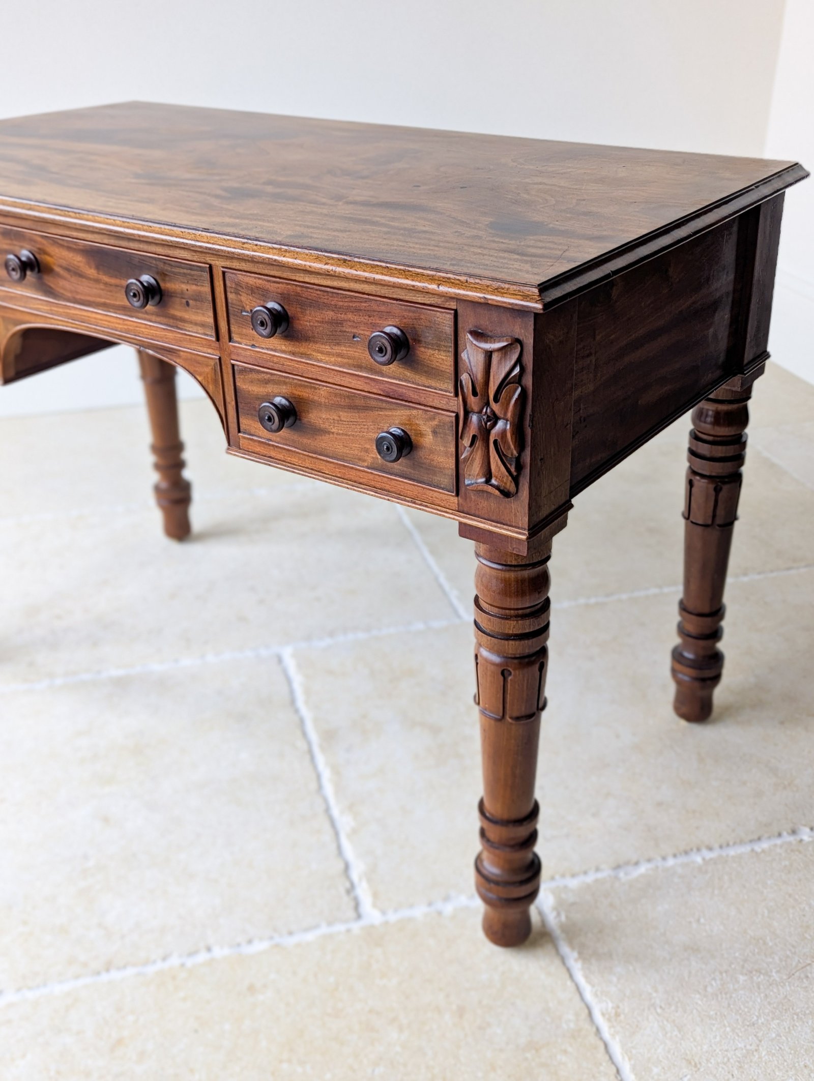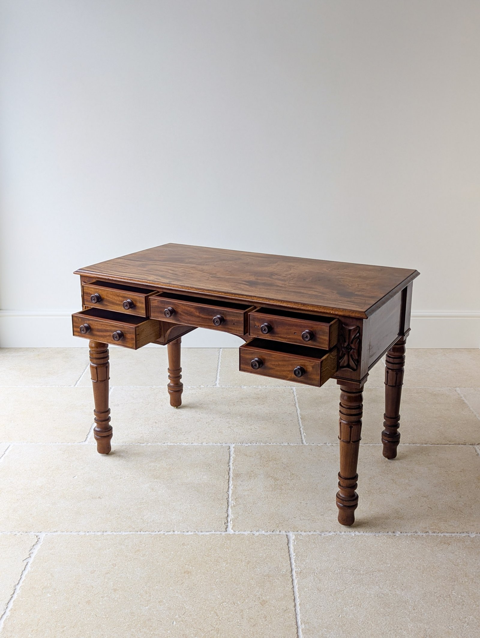 A fine William IV mahogany writing table with a richly figured top, over a frieze of five drawers arranged around a central kneehole, each retaining its original turned knobs.