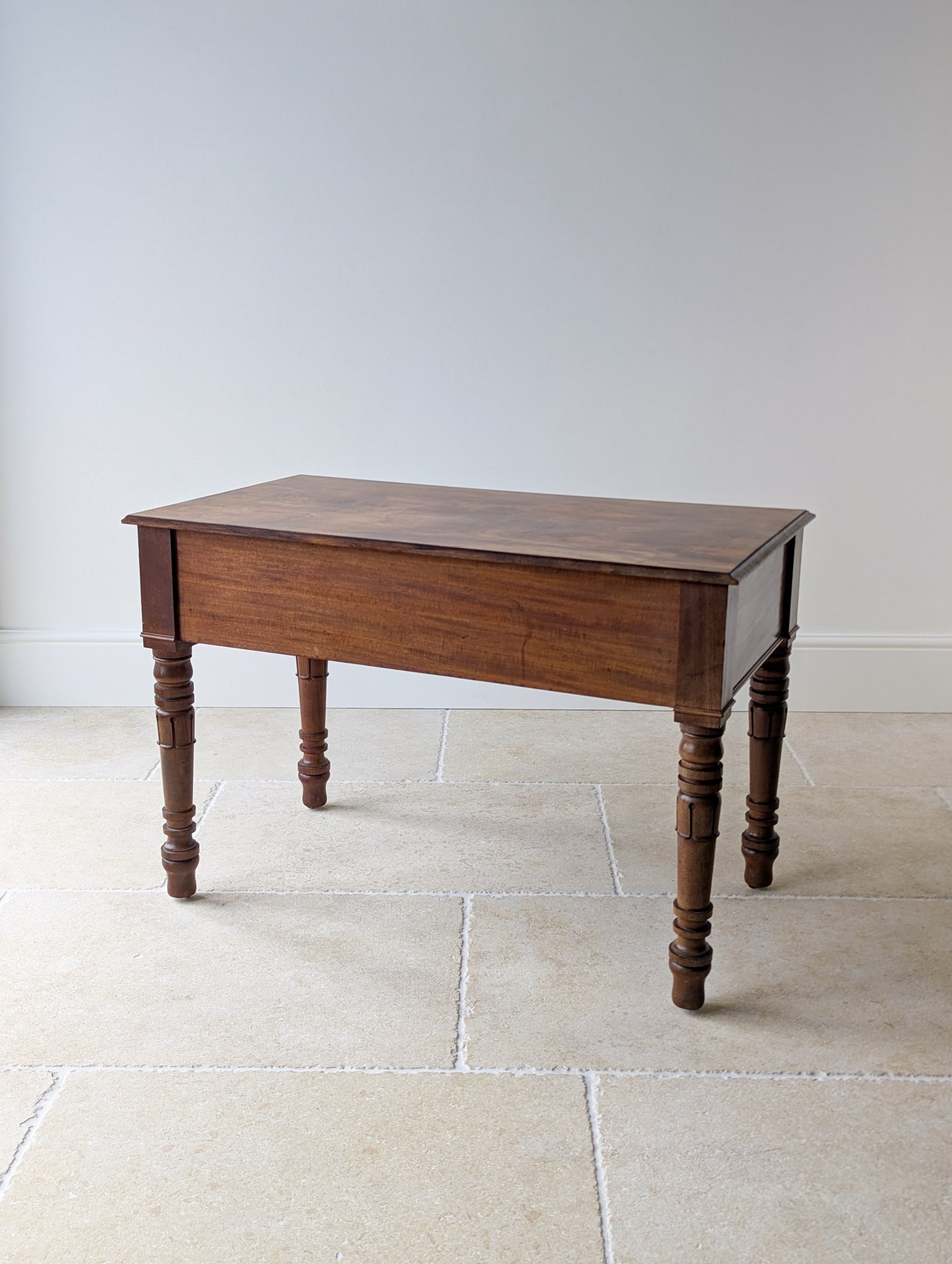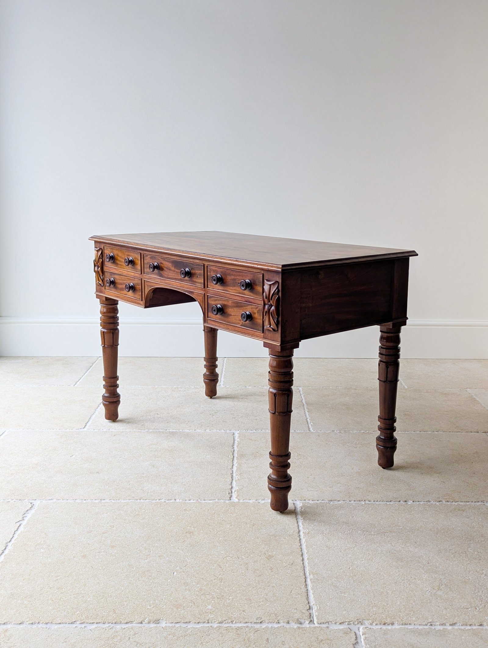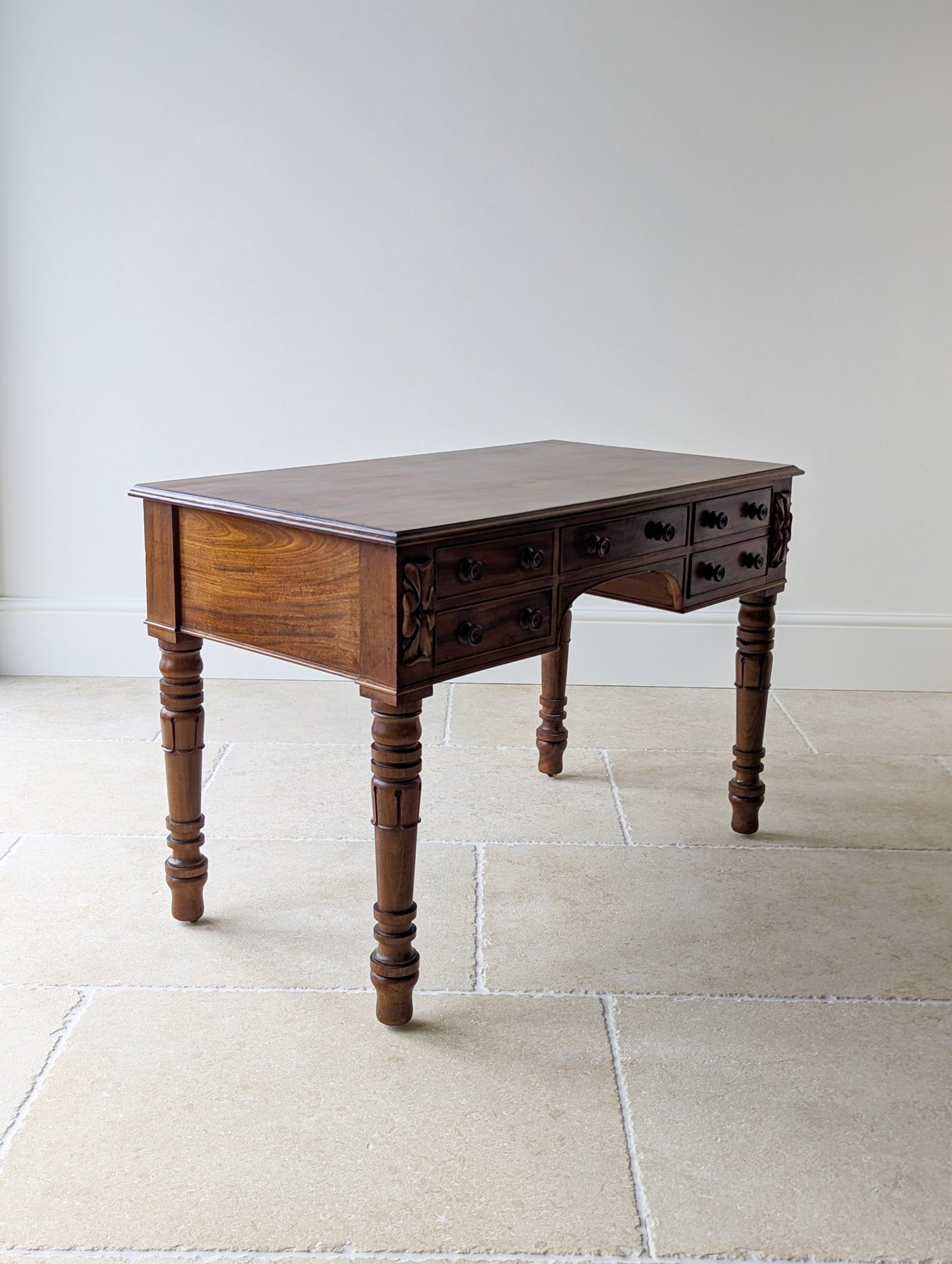 A fine William IV mahogany writing table with a richly figured top, over a frieze of five drawers arranged around a central kneehole, each retaining its original turned knobs.