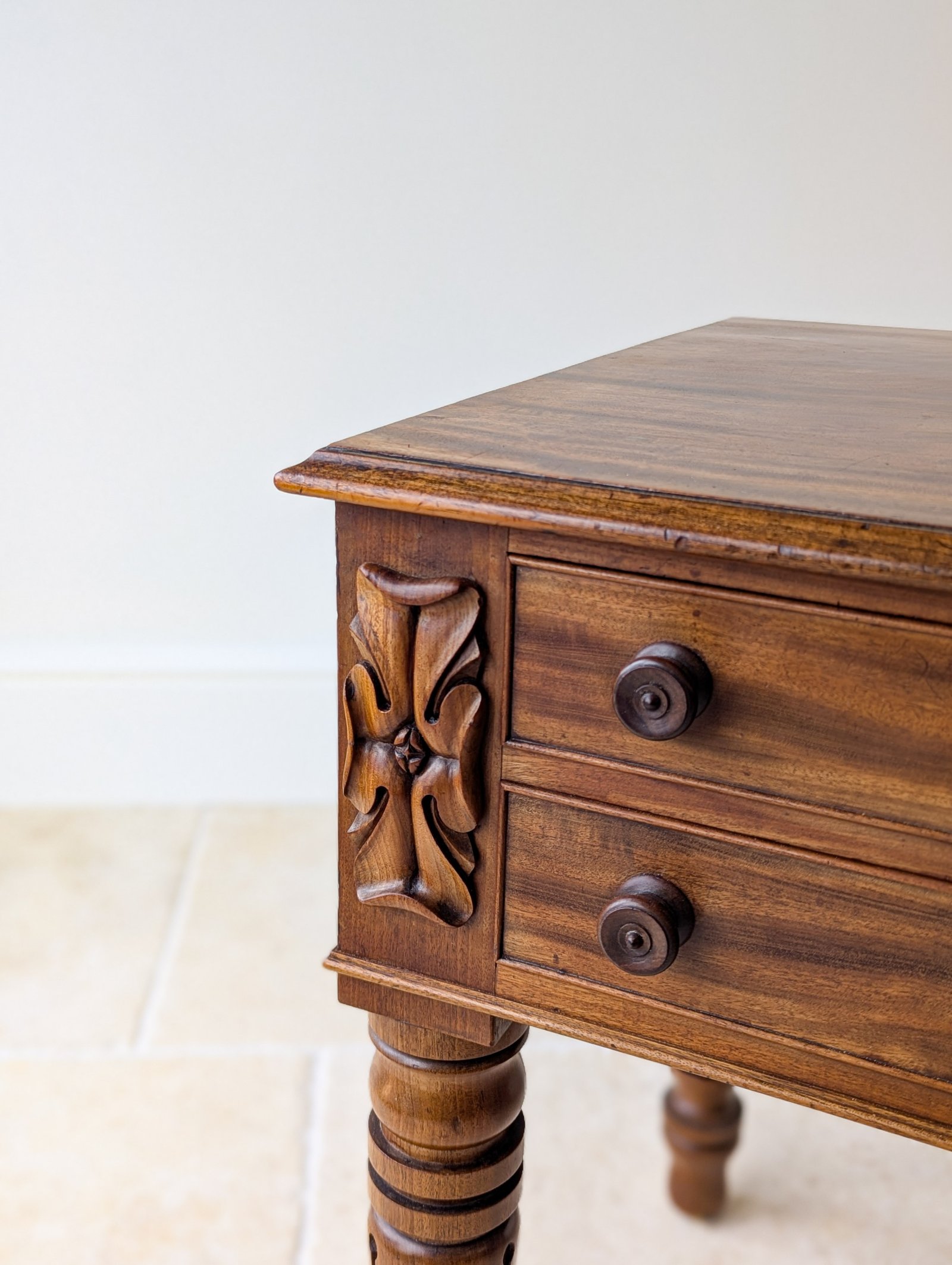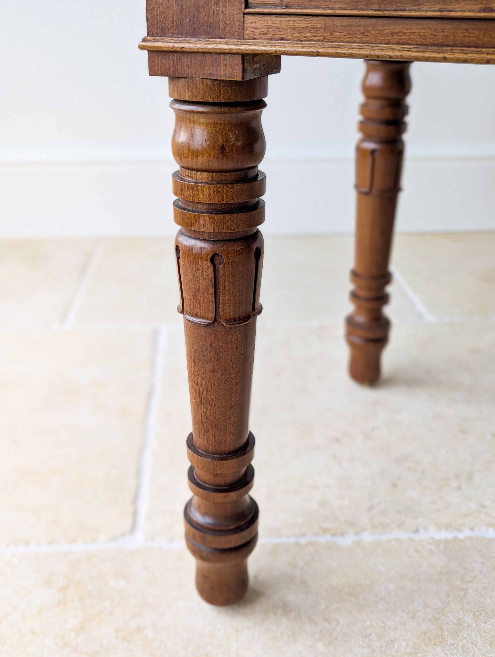 The corner blocks are embellished with stylised carved motifs, and the piece is raised on boldly turned and carved legs, all combining the refinement of late Regency design with the emerging boldness of early Victorian taste. The base of the legs are hollowed out to house hidden original, smooth running brass castors.