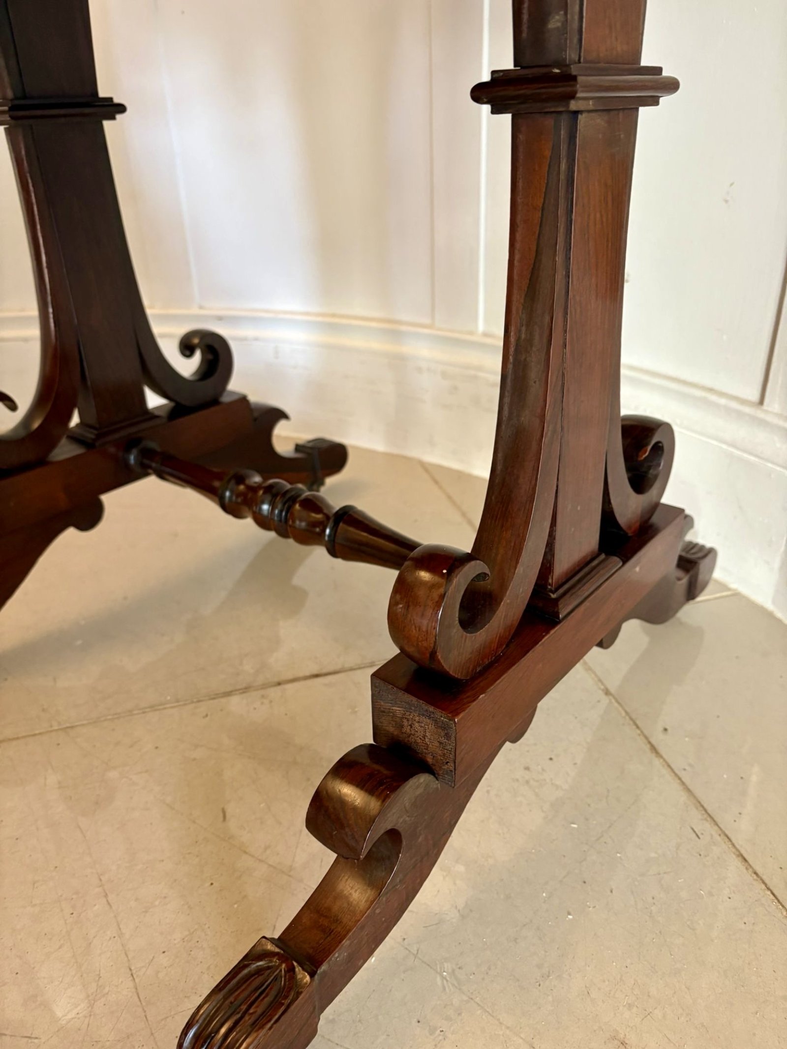 The table stands on striking twin lyre-form supports with refined scrollwork united by a turned stretcher for added stability. It is raised on carved paw feet with castors allowing ease of movement. The piece is both decorative and practical, perfect as a lamp table, side table or sewing/work table in any sophisticated interior.