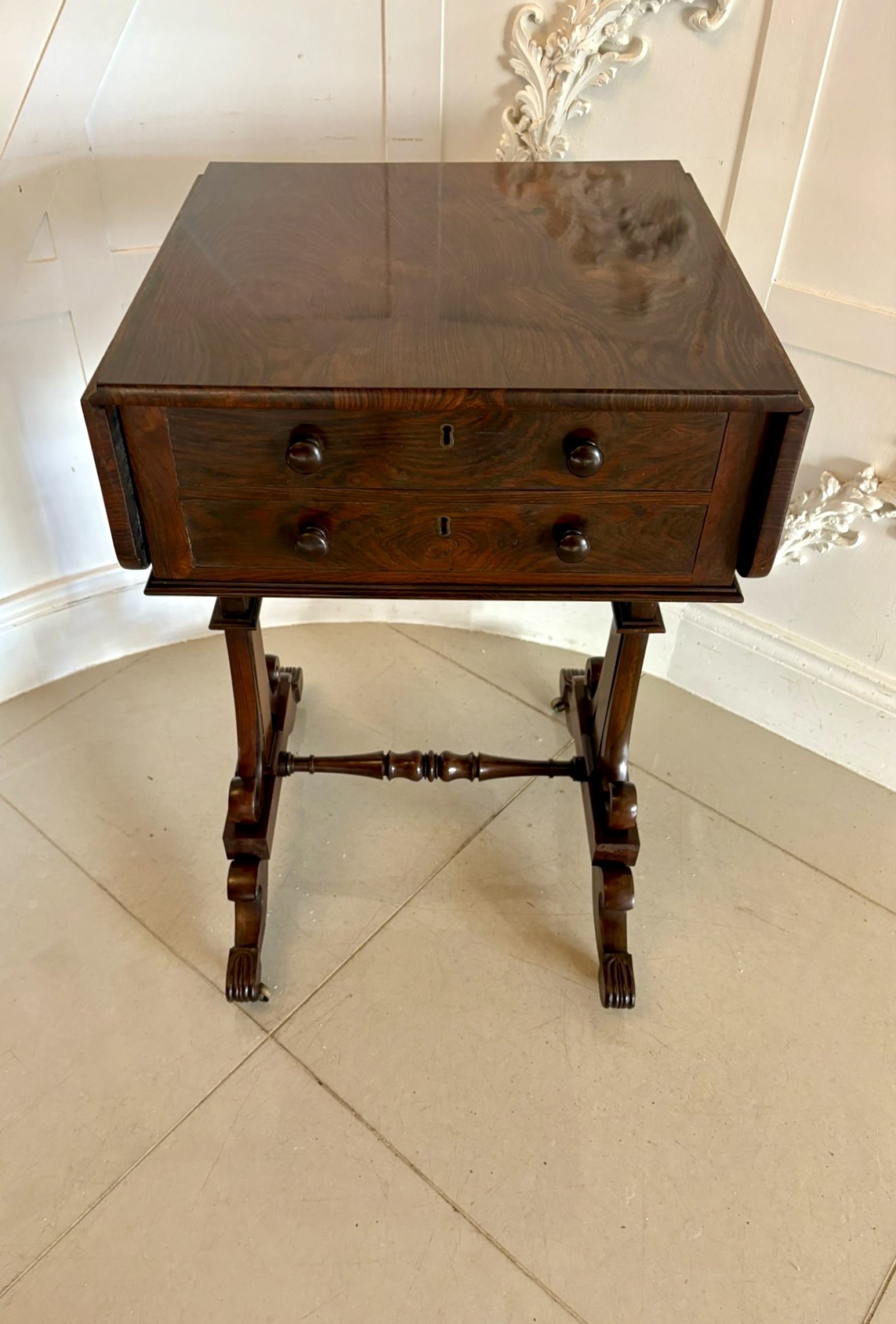 A fine William IV rosewood work table of elegant proportions beautifully crafted and richly figured throughout. The rectangular top features drop-leaf sides that extend the surface area when required, supported on original hinged brackets. Beneath are two smooth-running drawers fitted with turned rosewood knobs and original brass locks.