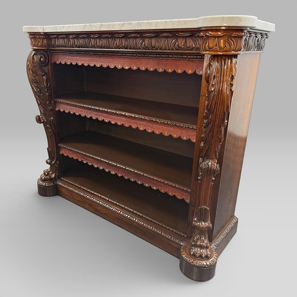 An antique William IV (1830–1837) rosewood carved open bookcase, with a Carrara marble top, attributed to Gillows.