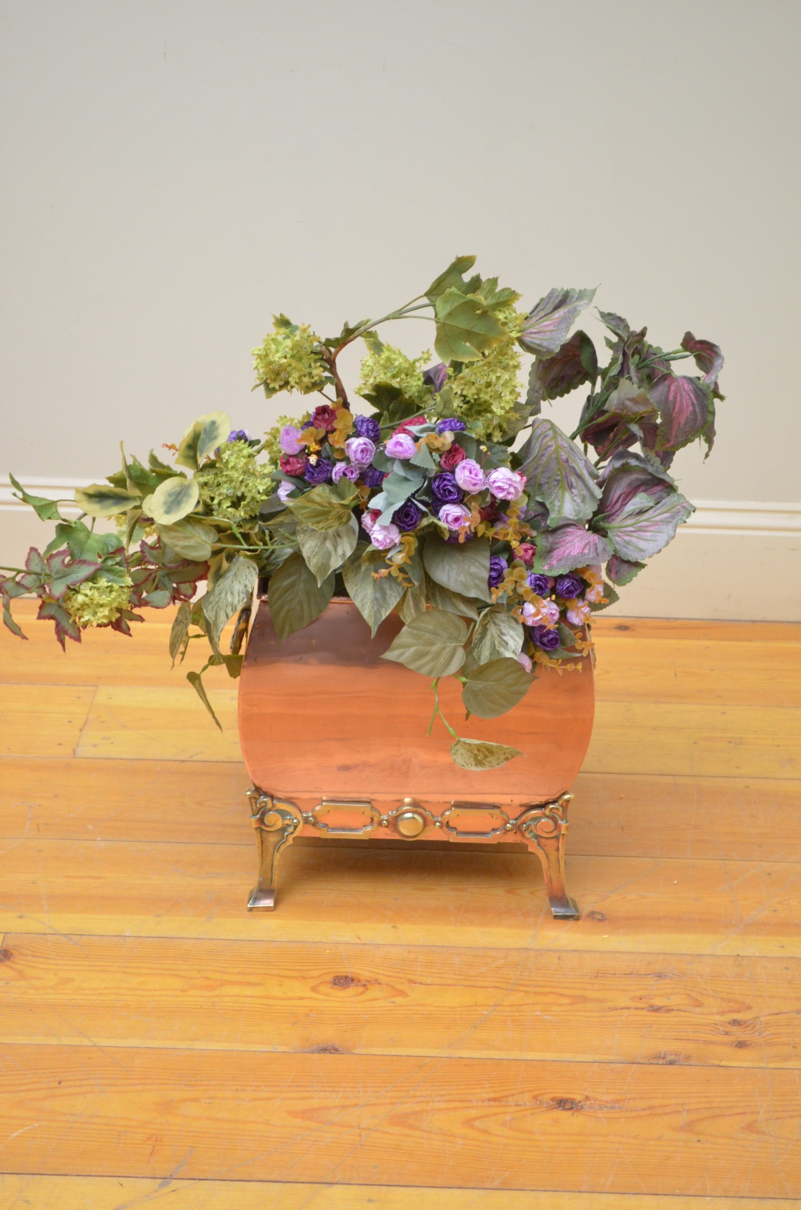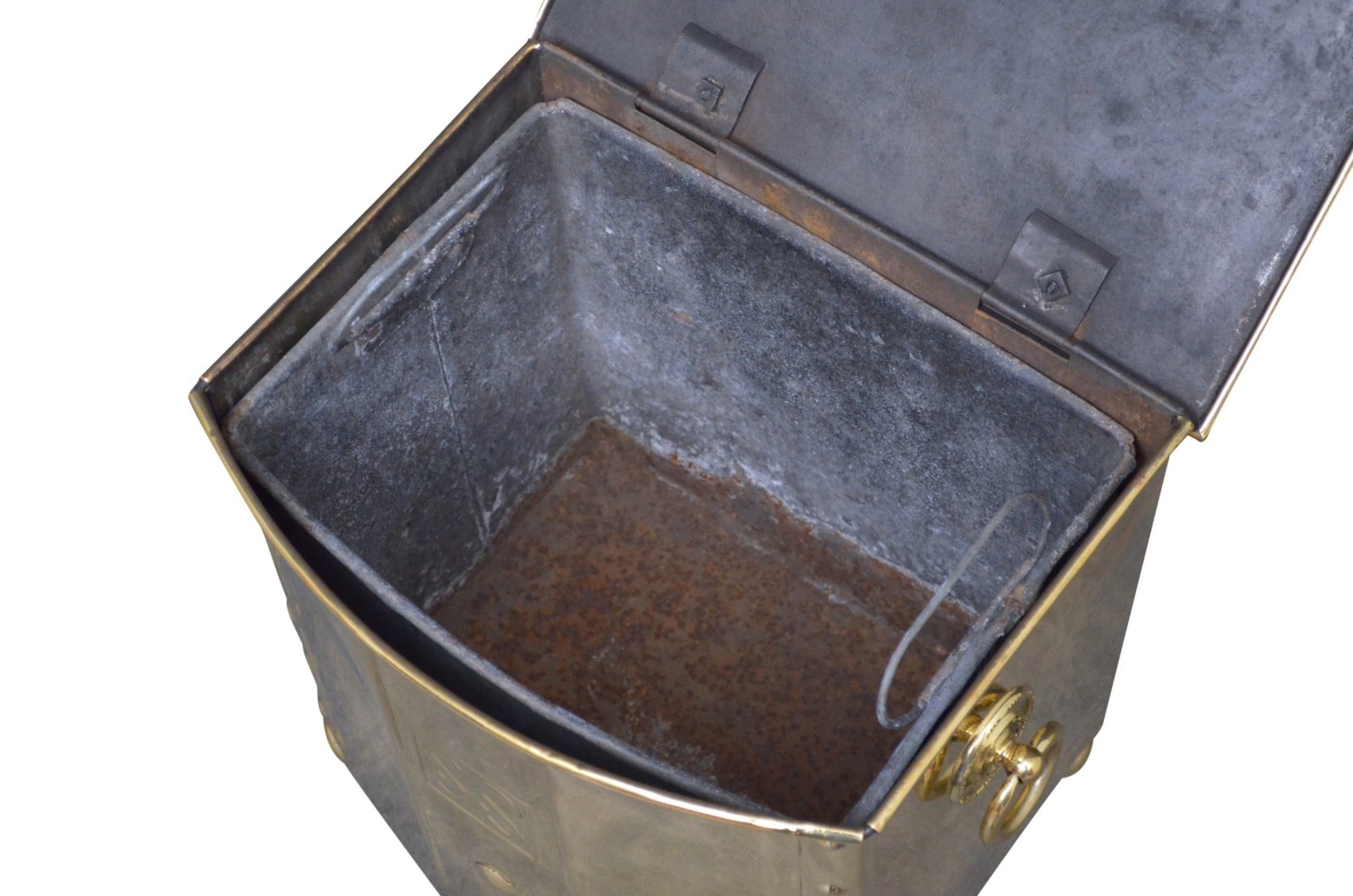 P030 Art Deco brass log or coal bin with original removable linker, carrying handles and bun feet. Cleaned, polished and ready to use at home. No breaks or repairs, original liner, feet and handles. c1930