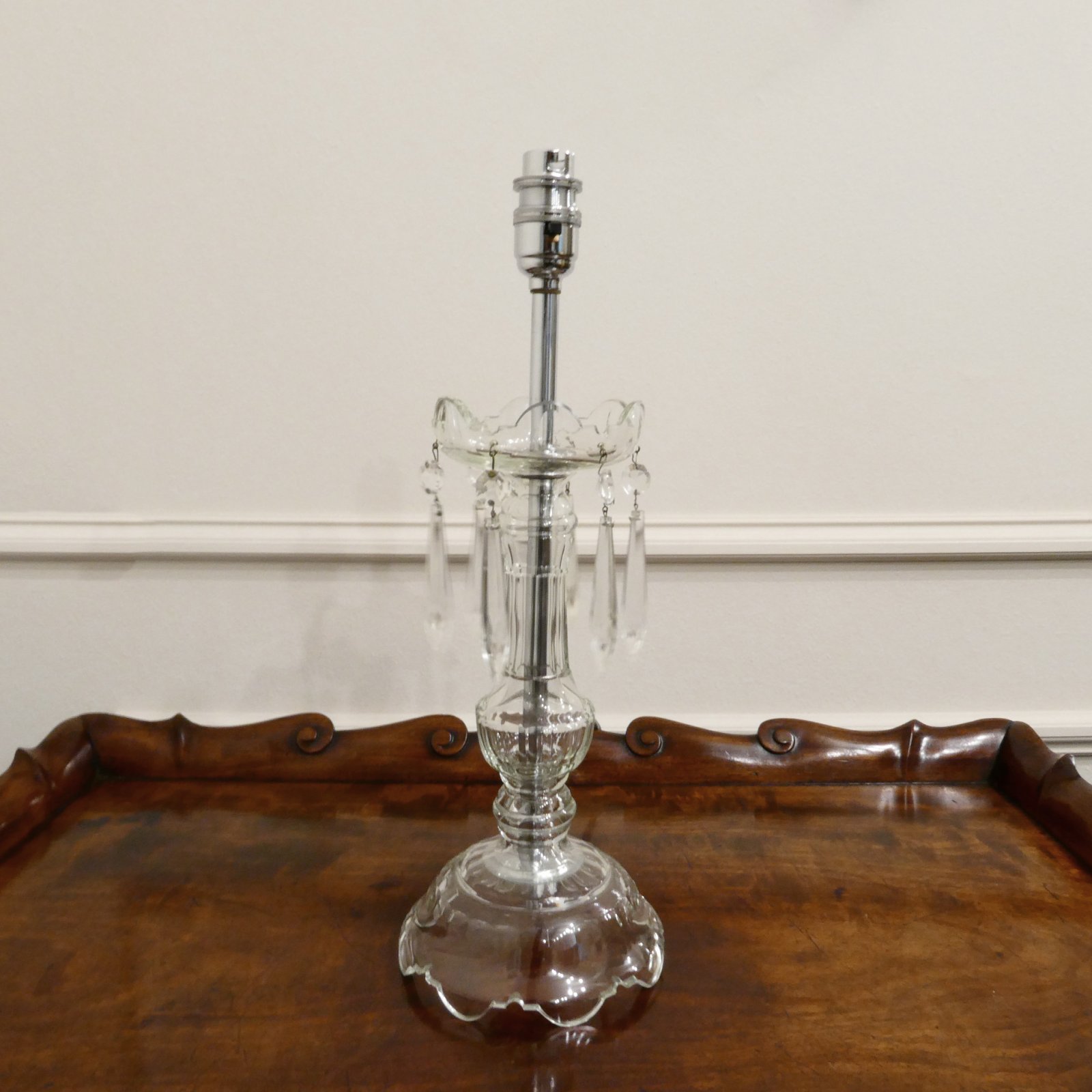 A stylish Italian Art Deco period cut crystal glass table lamp with shaped body and six faceted icicle droplets. The lamp has a single switched bulb holder and comes with the 30cm wide ivory coloured lampshade.