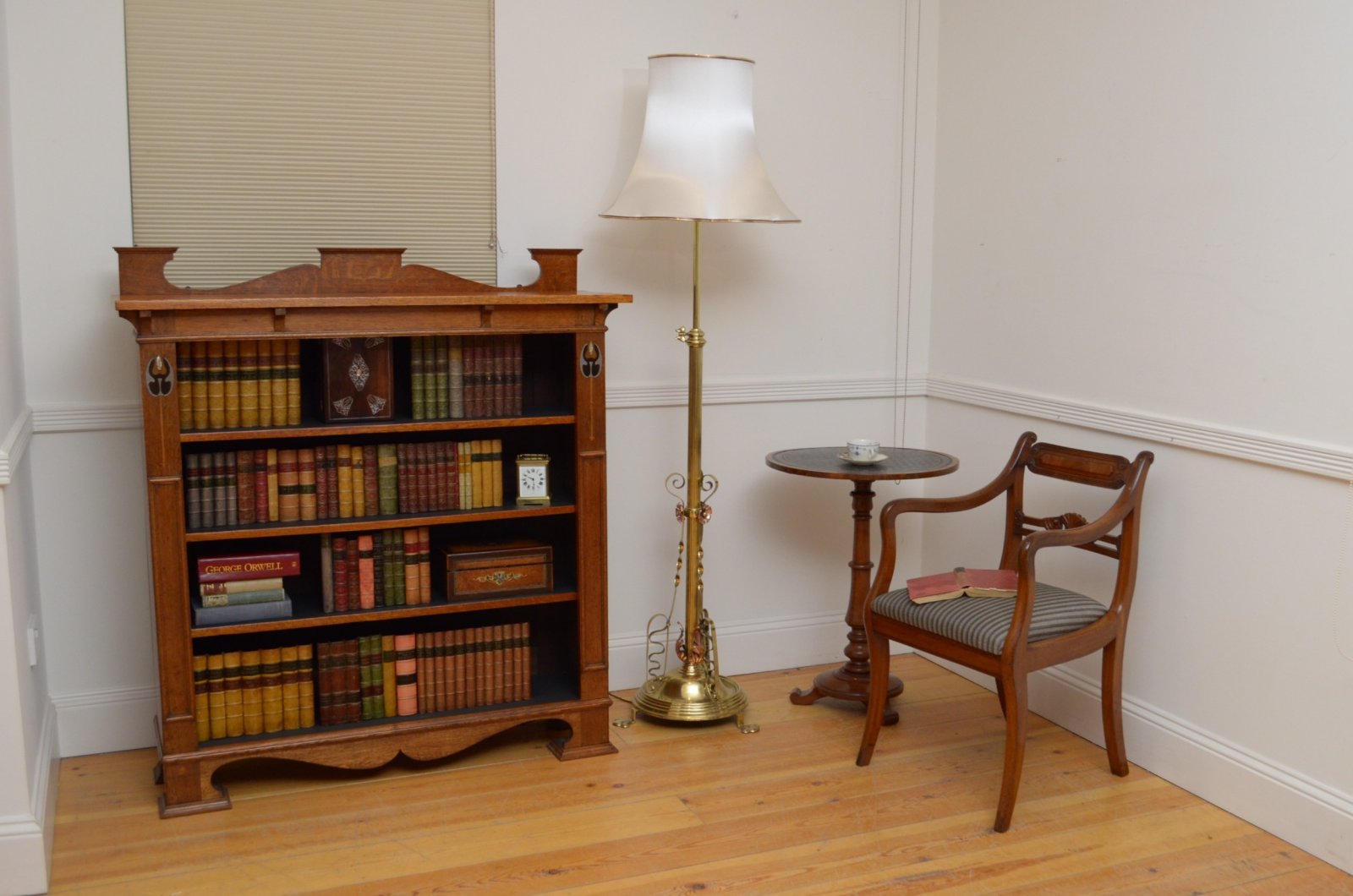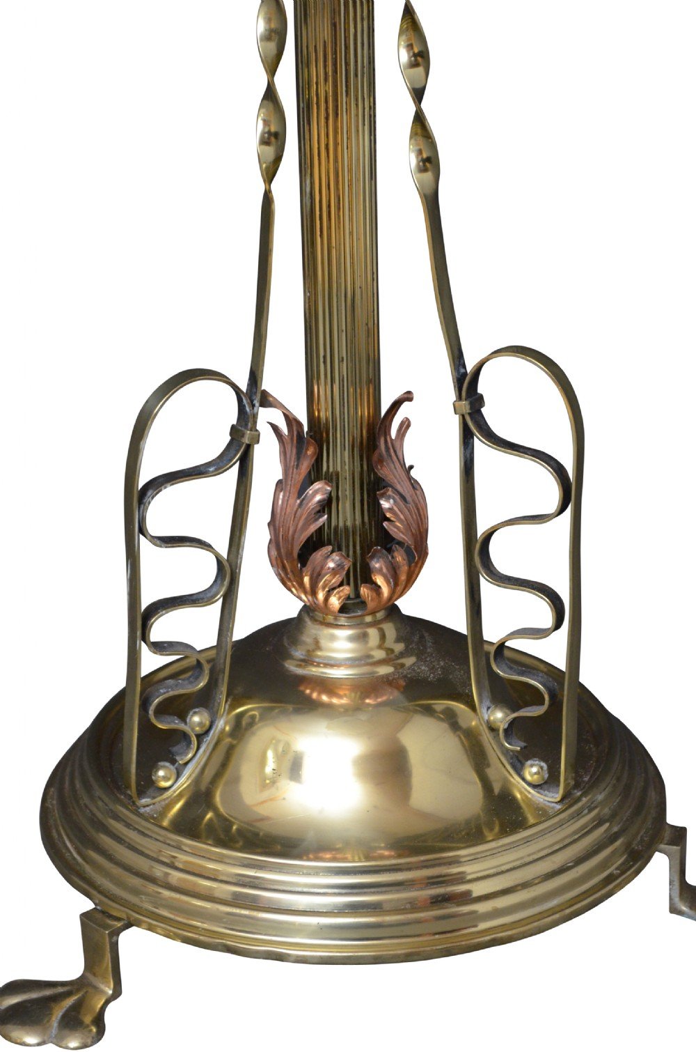 P072 Superb Late Victorian / Art Nouveau brass and copper height adjustable standard lamp, having reeded column with twisted supports, copper acanthus leaf decoration and reeded circular base terminating in 3 pad feet. This antique lamp has been cleaned and polished in our workshop, it has been professionally rewired and PAT tested, all in home ready condition. Lampshade available on request. c1890