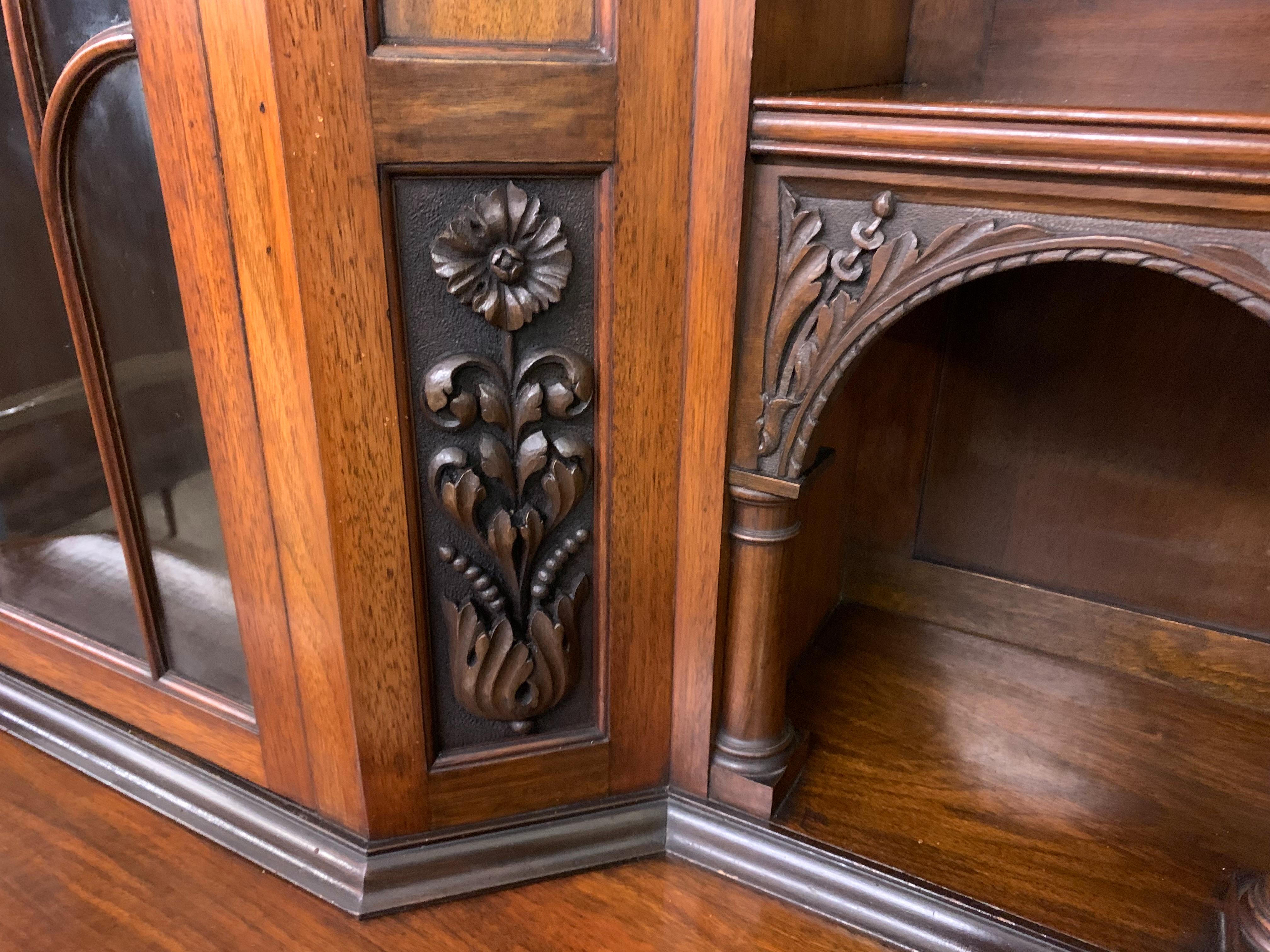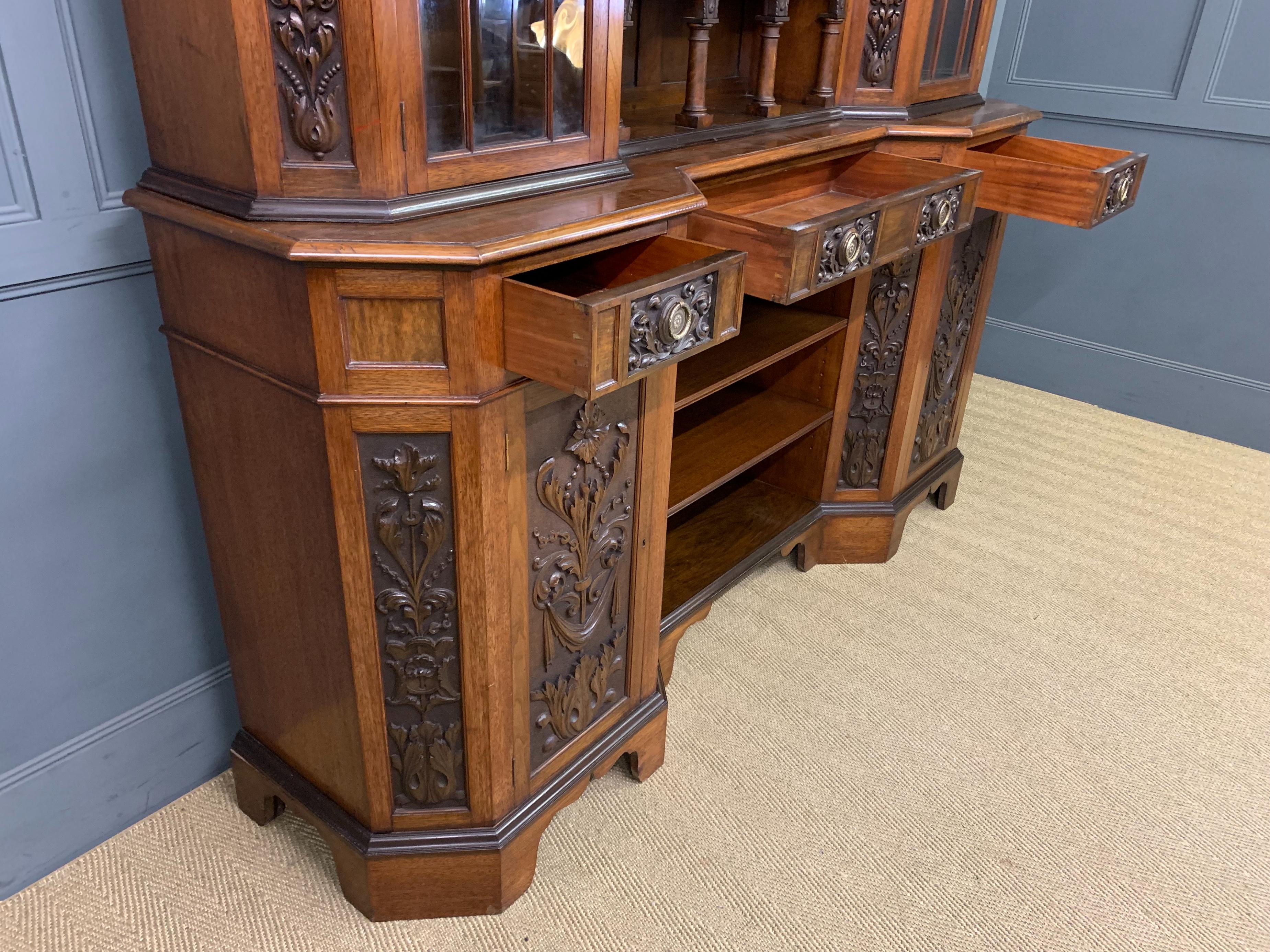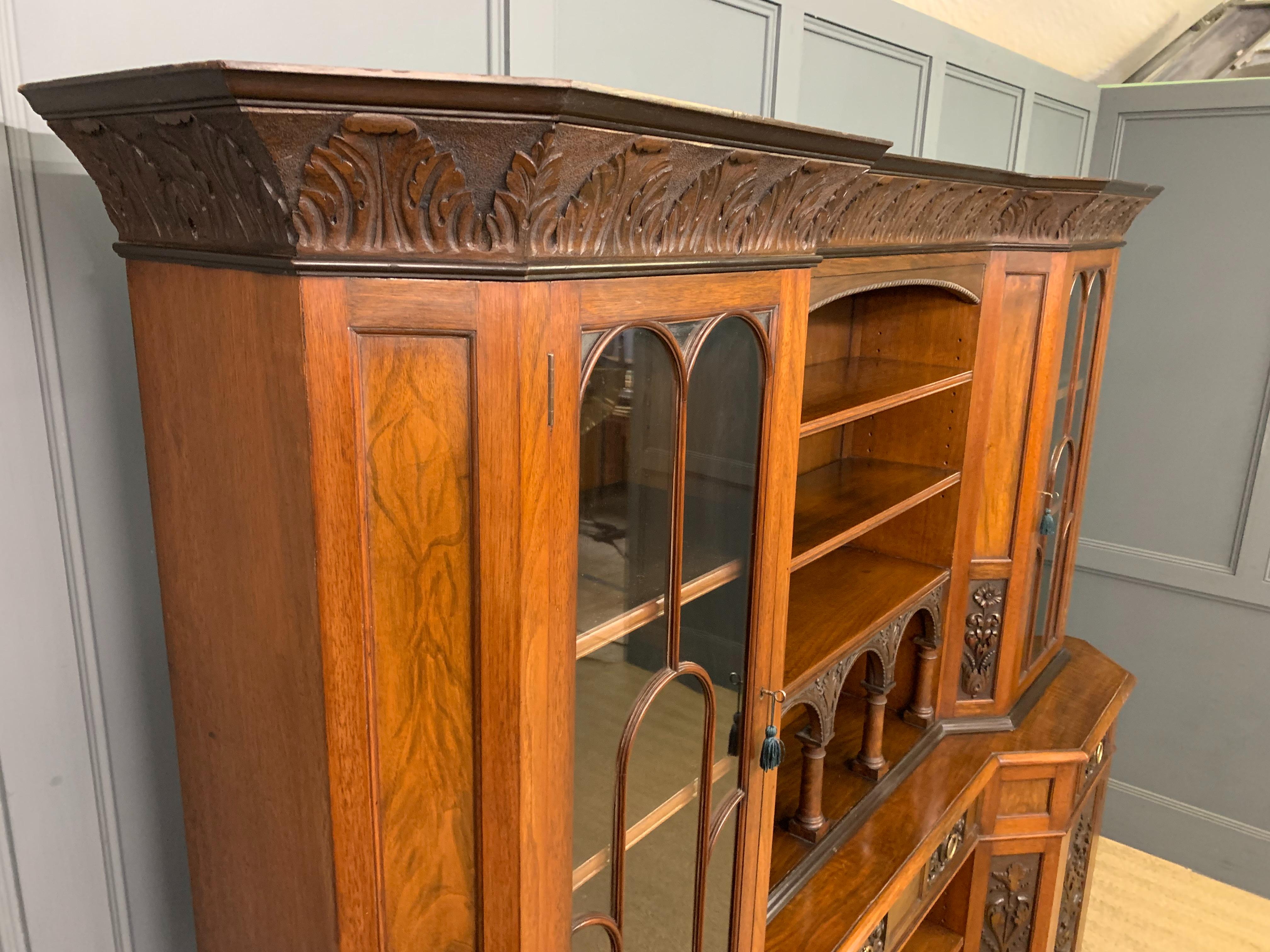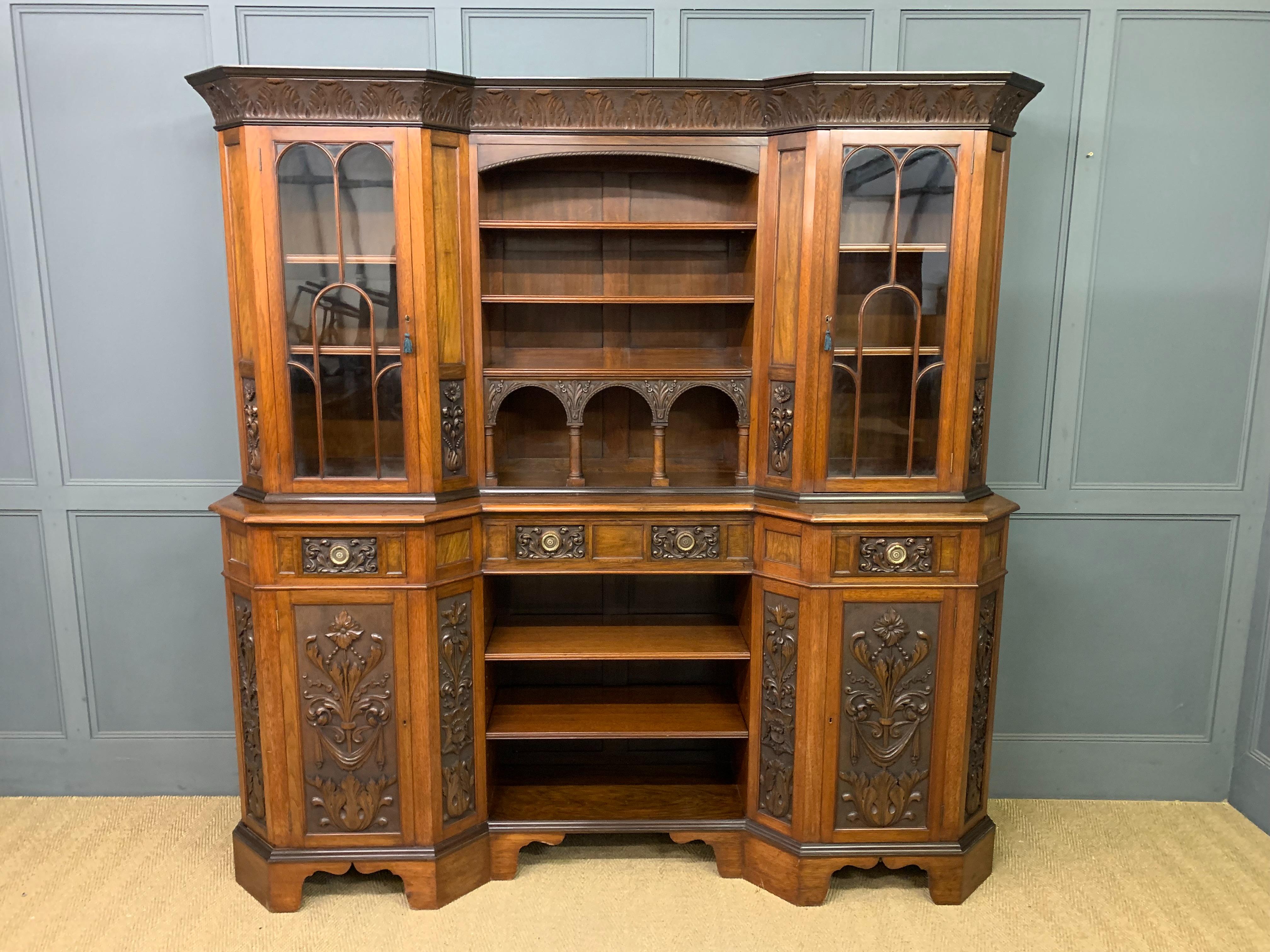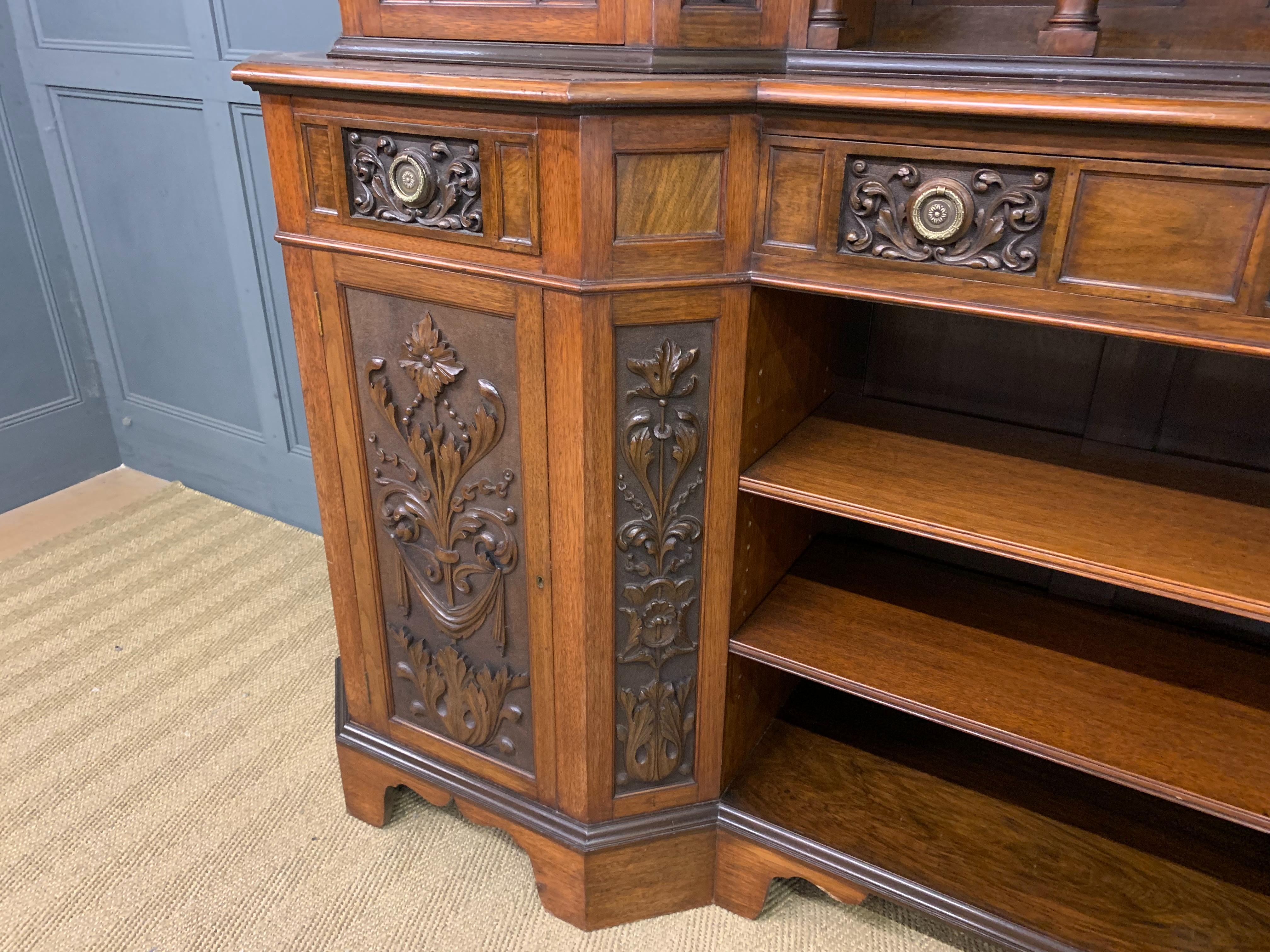 A superb Arts and Crafts period sideboard, of chiffonier. Very well constructed in solid walnut and of generous proportions. The upper section with central shelving flanked by a pair of glazed cabinets. The base section with a series of 3 drawers over central shelving flanked by a pair of cupboards. All shelving is adjustable and all doors are lockable (keys supplied). Decorated with crisply carved panels throughout and surmounted with an over-sailing cornice. Sympathetically repolished in our workshops and now offered for sale in excellent condition, with a good colour and patina. Splits into 3 sections for ease of installation.
