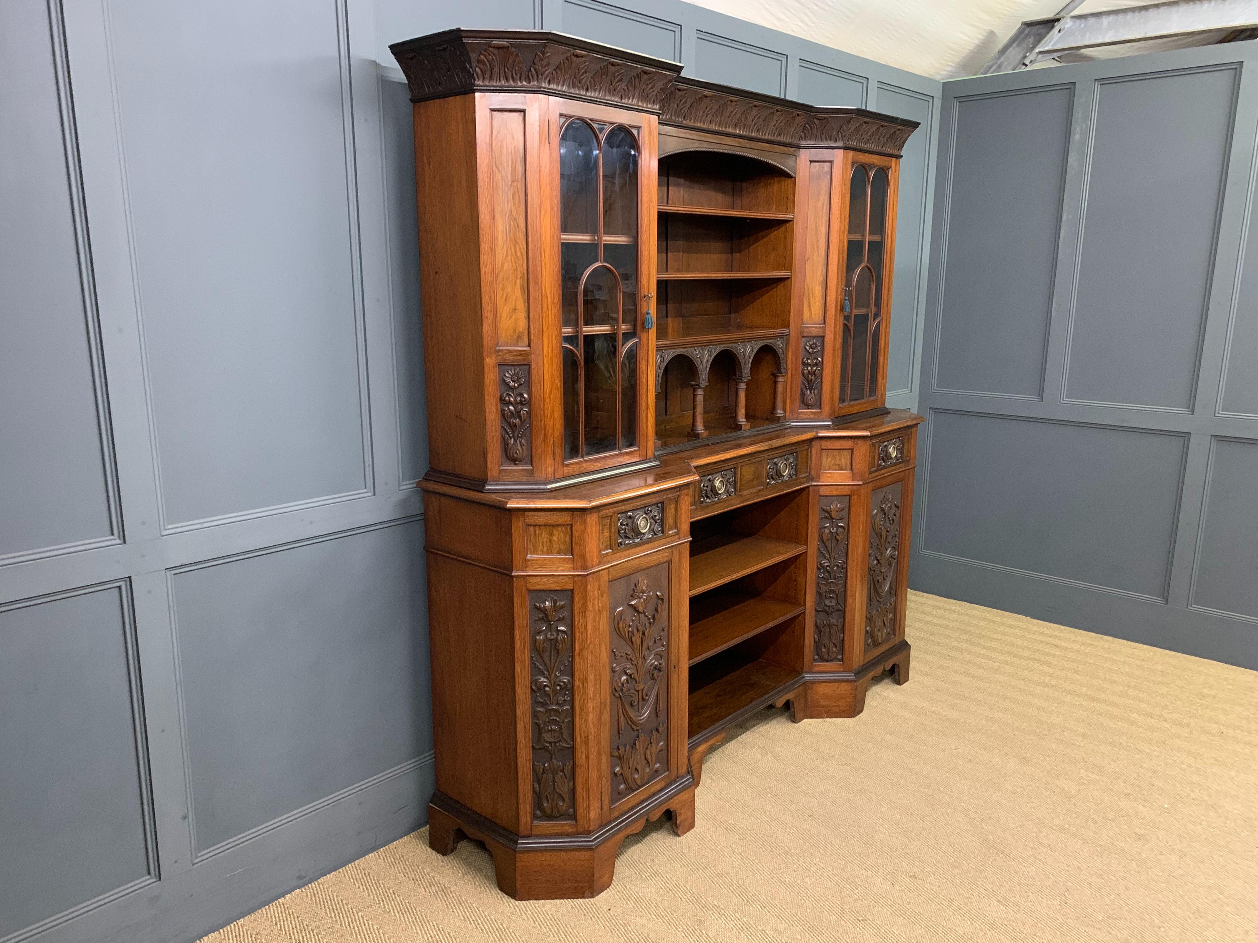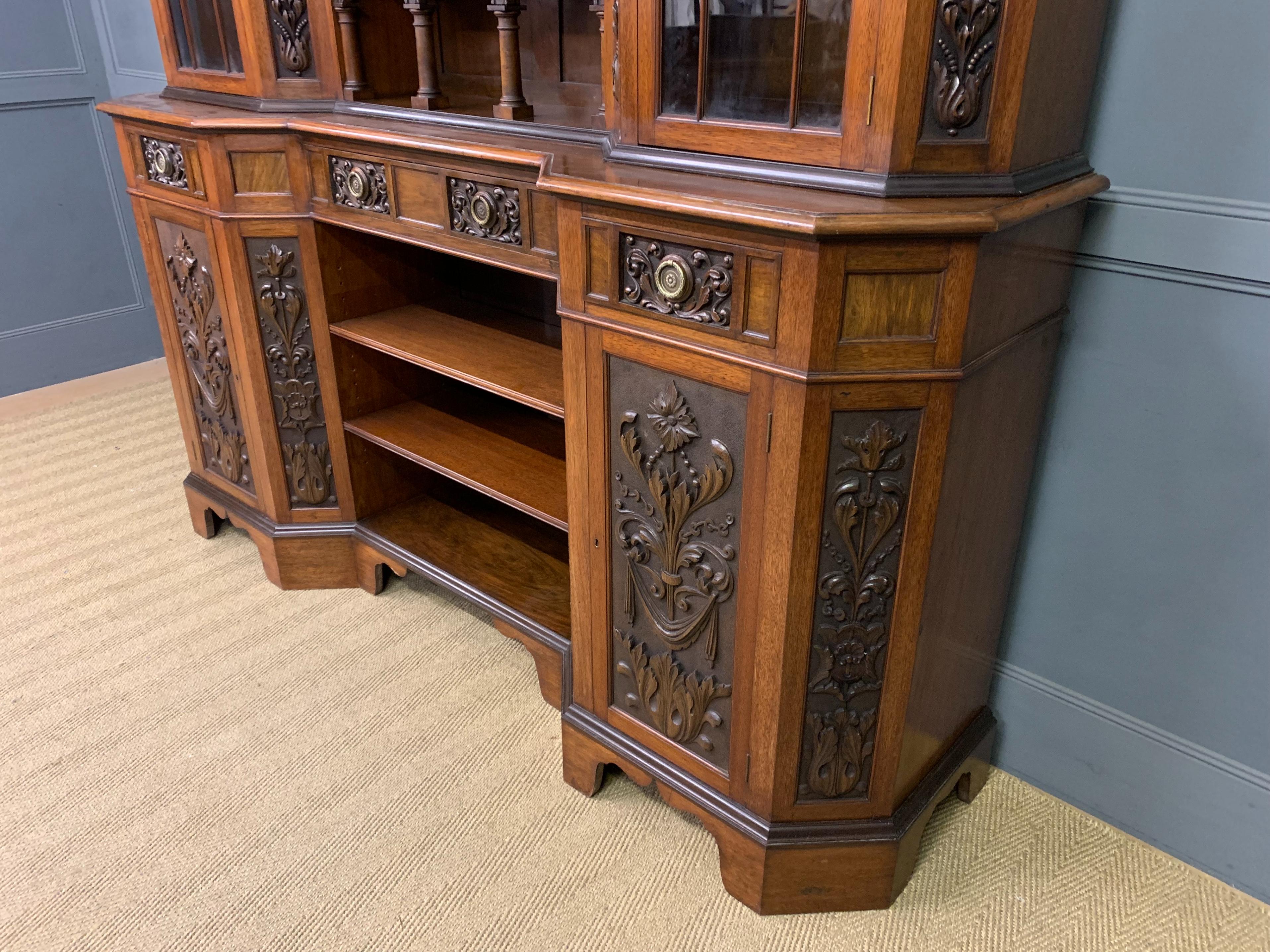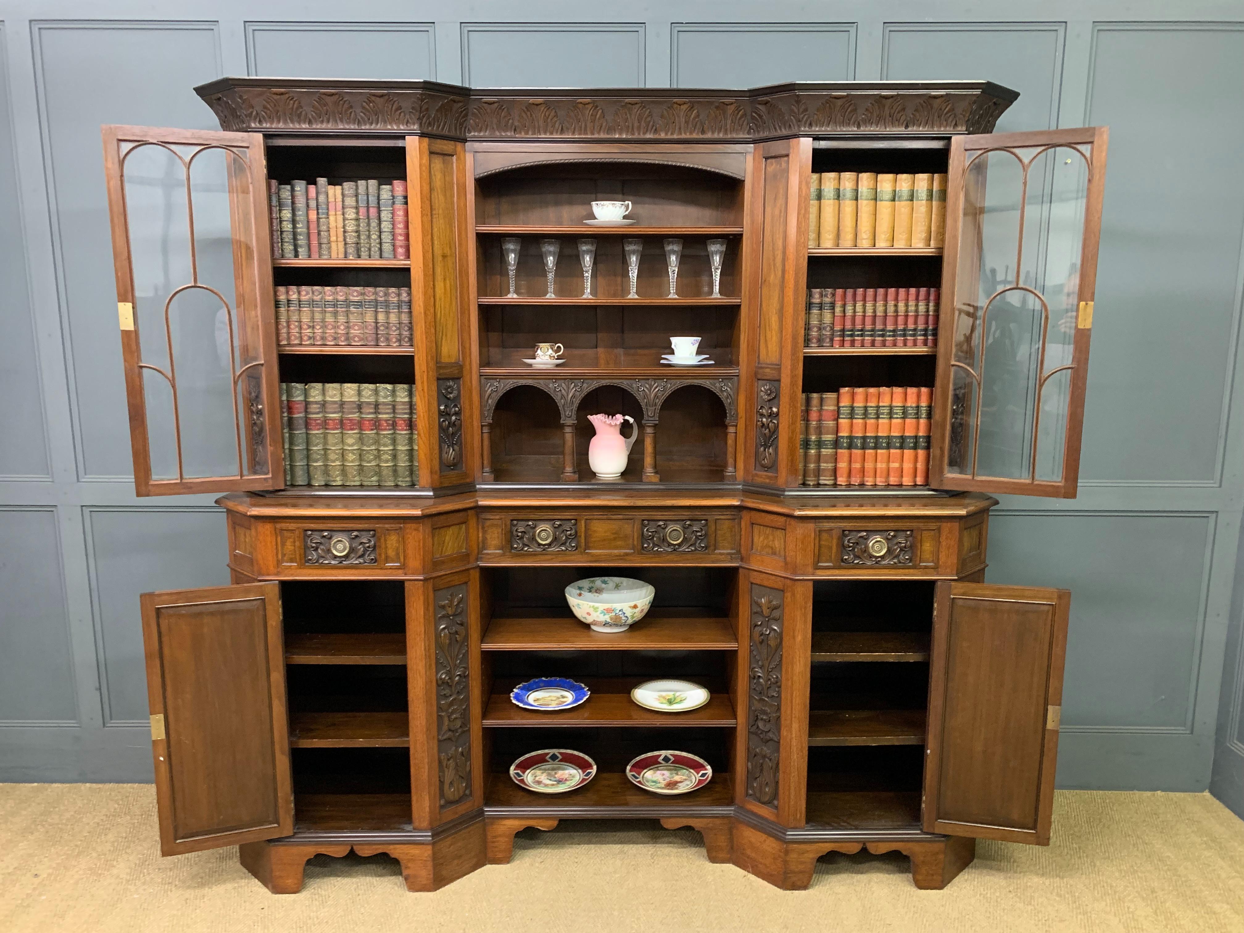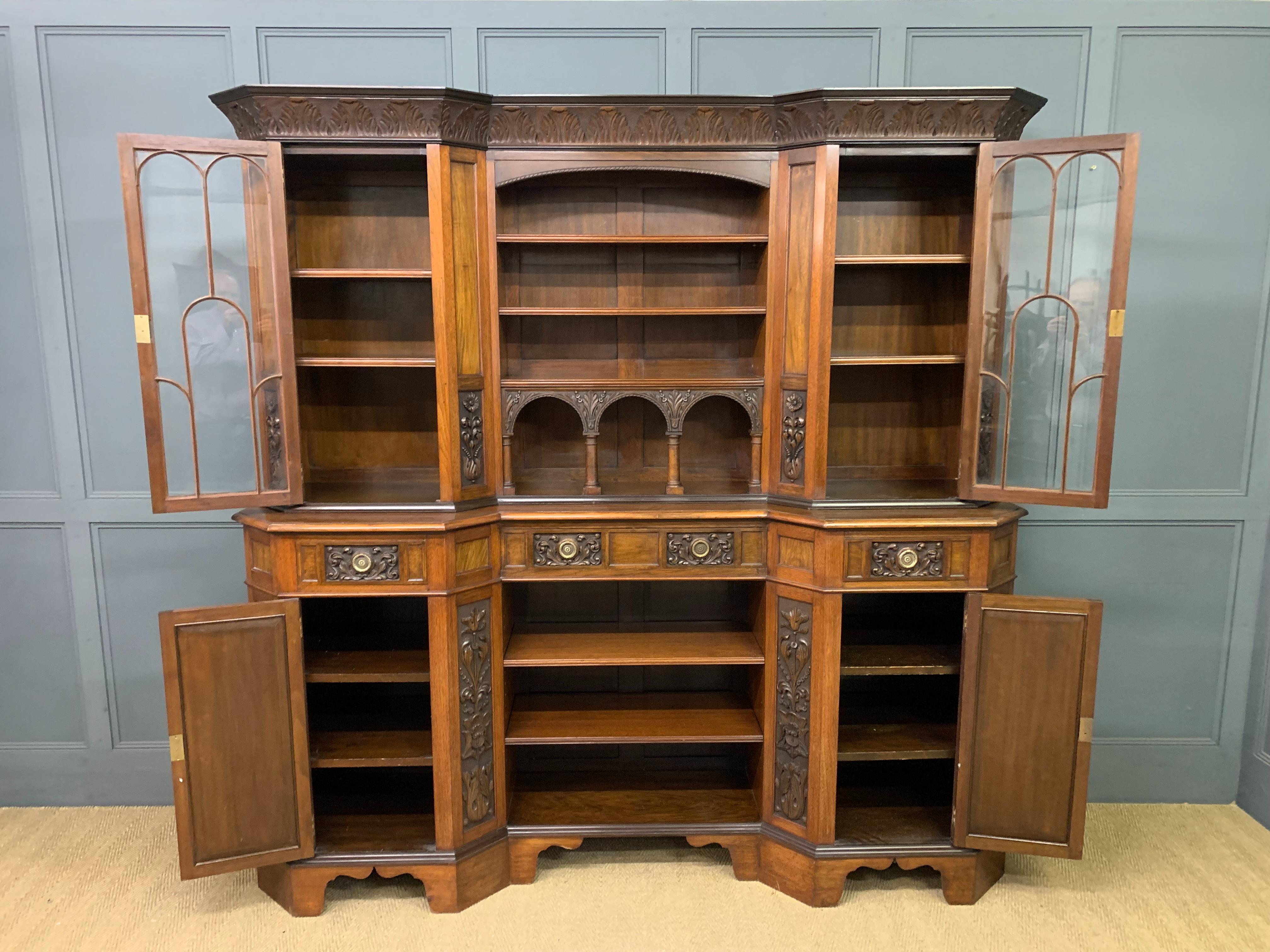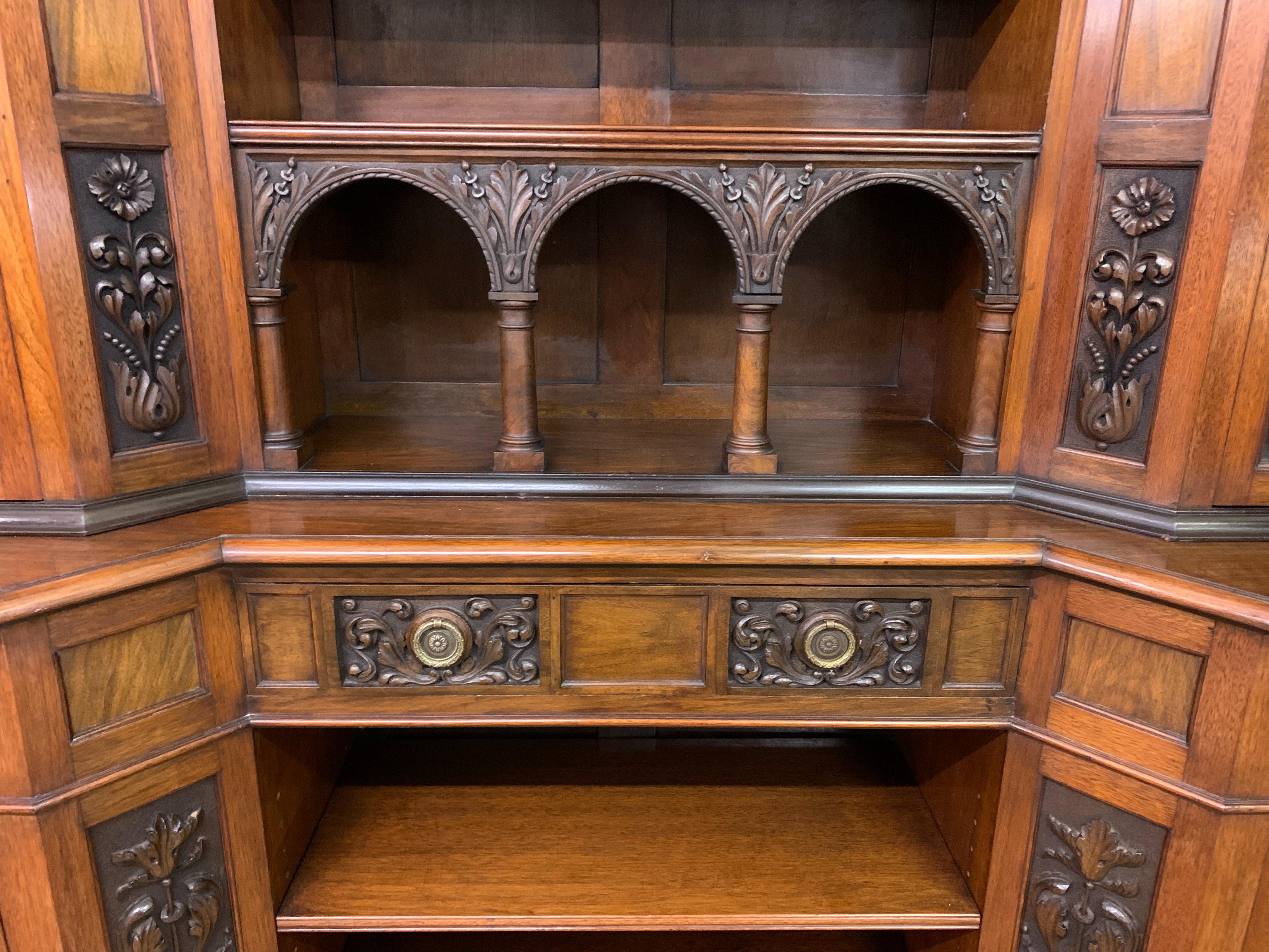 A superb Arts and Crafts period sideboard, of chiffonier. Very well constructed in solid walnut and of generous proportions. The upper section with central shelving flanked by a pair of glazed cabinets. The base section with a series of 3 drawers over central shelving flanked by a pair of cupboards. All shelving is adjustable and all doors are lockable (keys supplied). Decorated with crisply carved panels throughout and surmounted with an over-sailing cornice. Sympathetically repolished in our workshops and now offered for sale in excellent condition, with a good colour and patina. Splits into 3 sections for ease of installation.