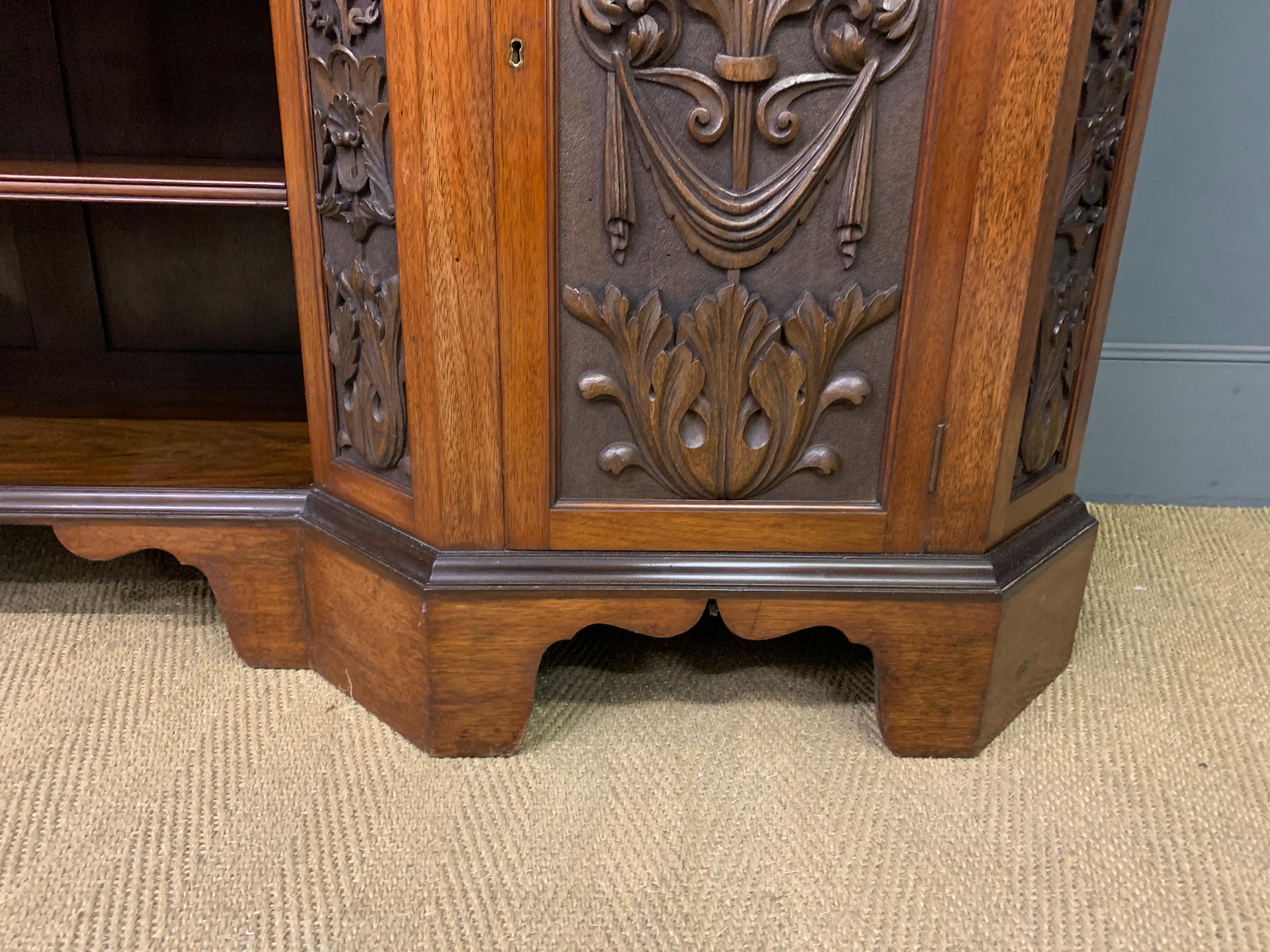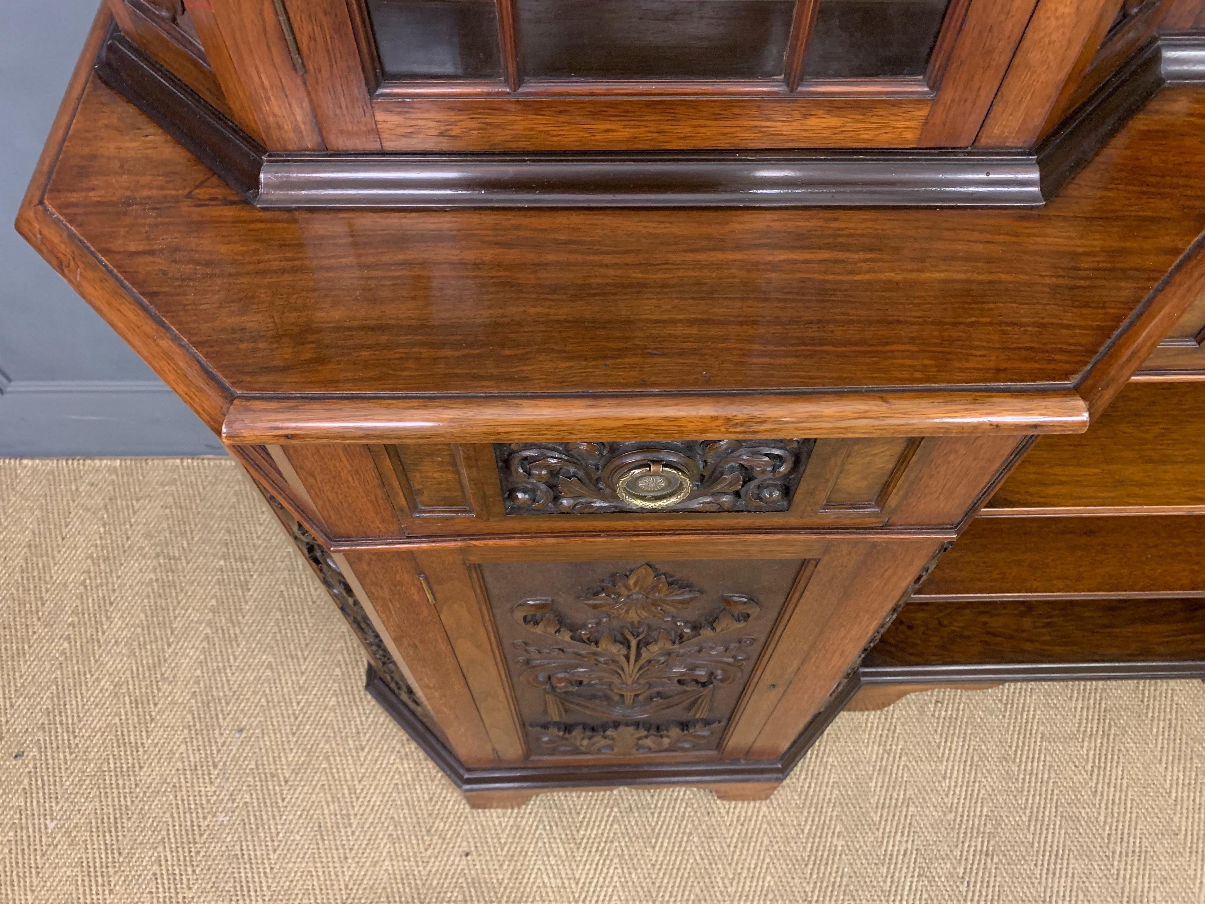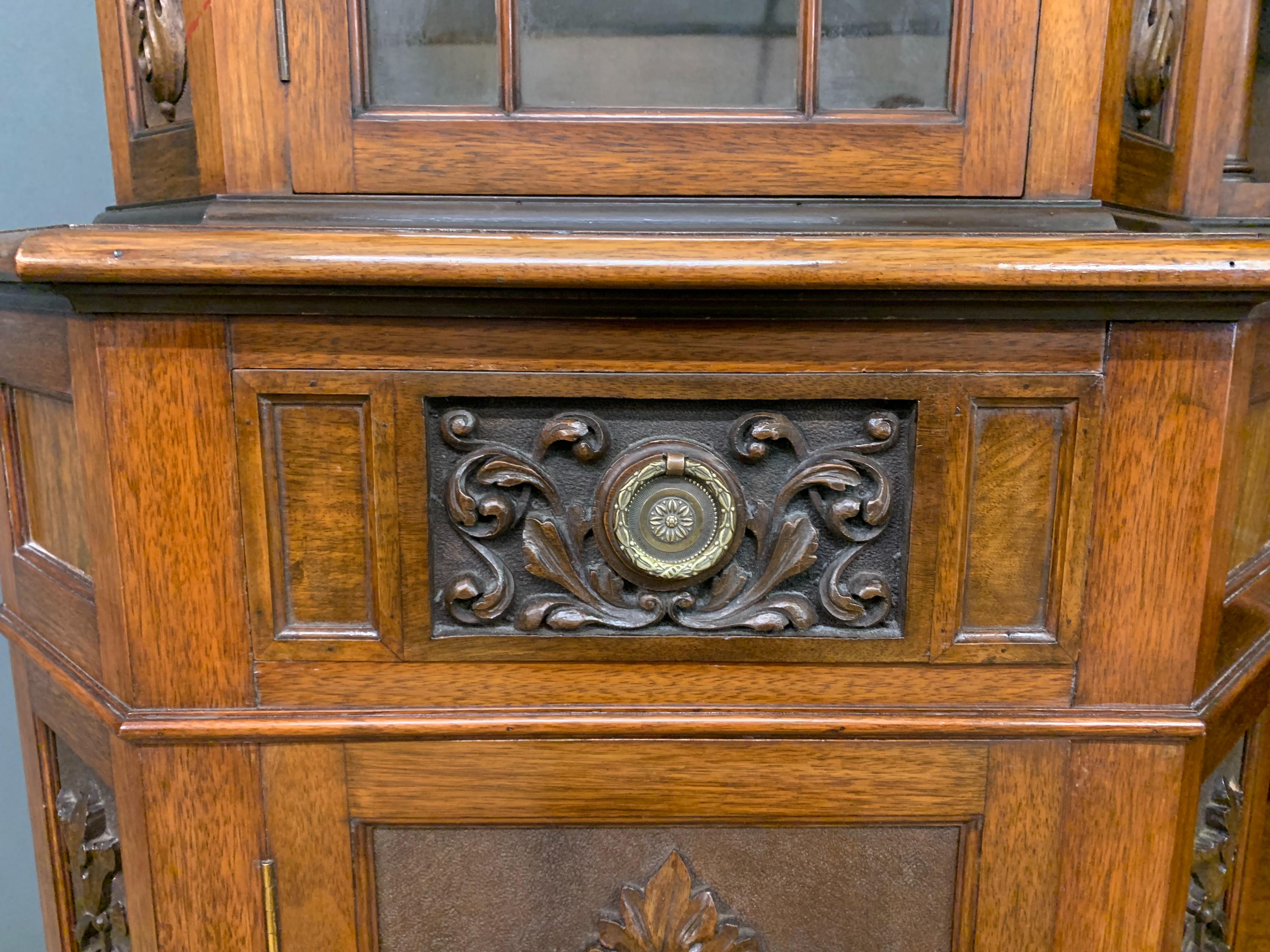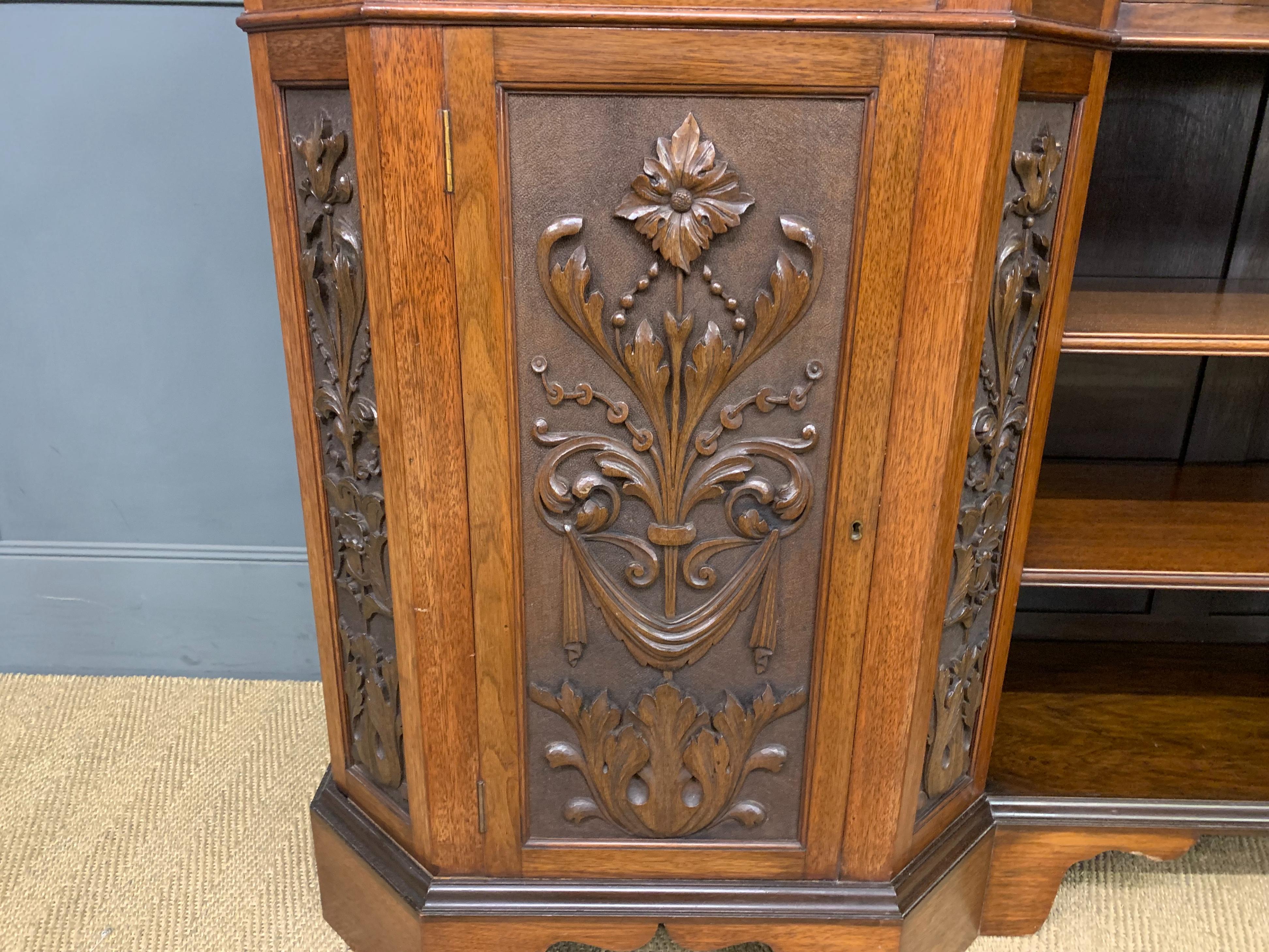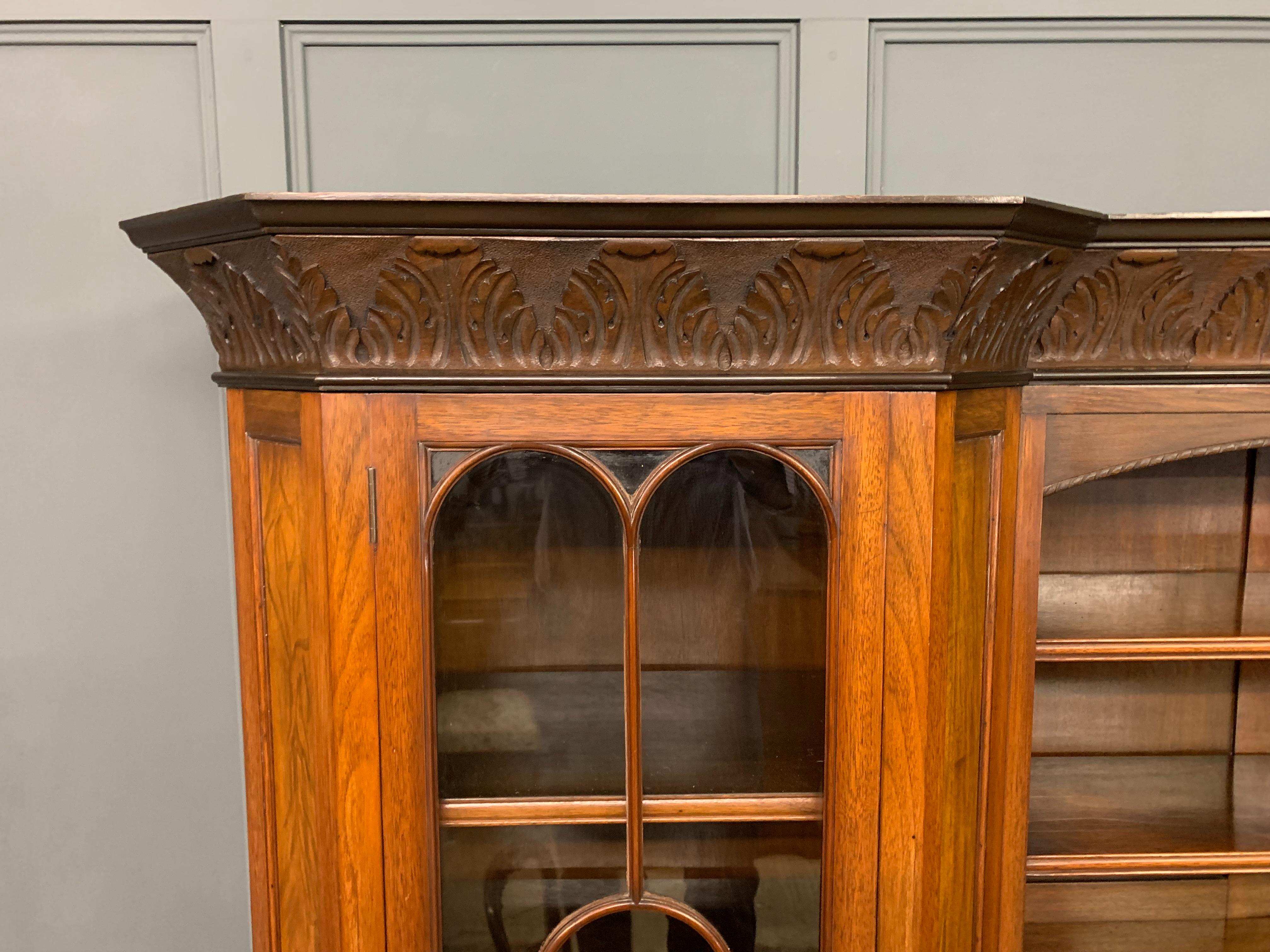 A superb Arts and Crafts period sideboard, of chiffonier. Very well constructed in solid walnut and of generous proportions. The upper section with central shelving flanked by a pair of glazed cabinets. The base section with a series of 3 drawers over central shelving flanked by a pair of cupboards. All shelving is adjustable and all doors are lockable (keys supplied). Decorated with crisply carved panels throughout and surmounted with an over-sailing cornice. Sympathetically repolished in our workshops and now offered for sale in excellent condition, with a good colour and patina. Splits into 3 sections for ease of installation.