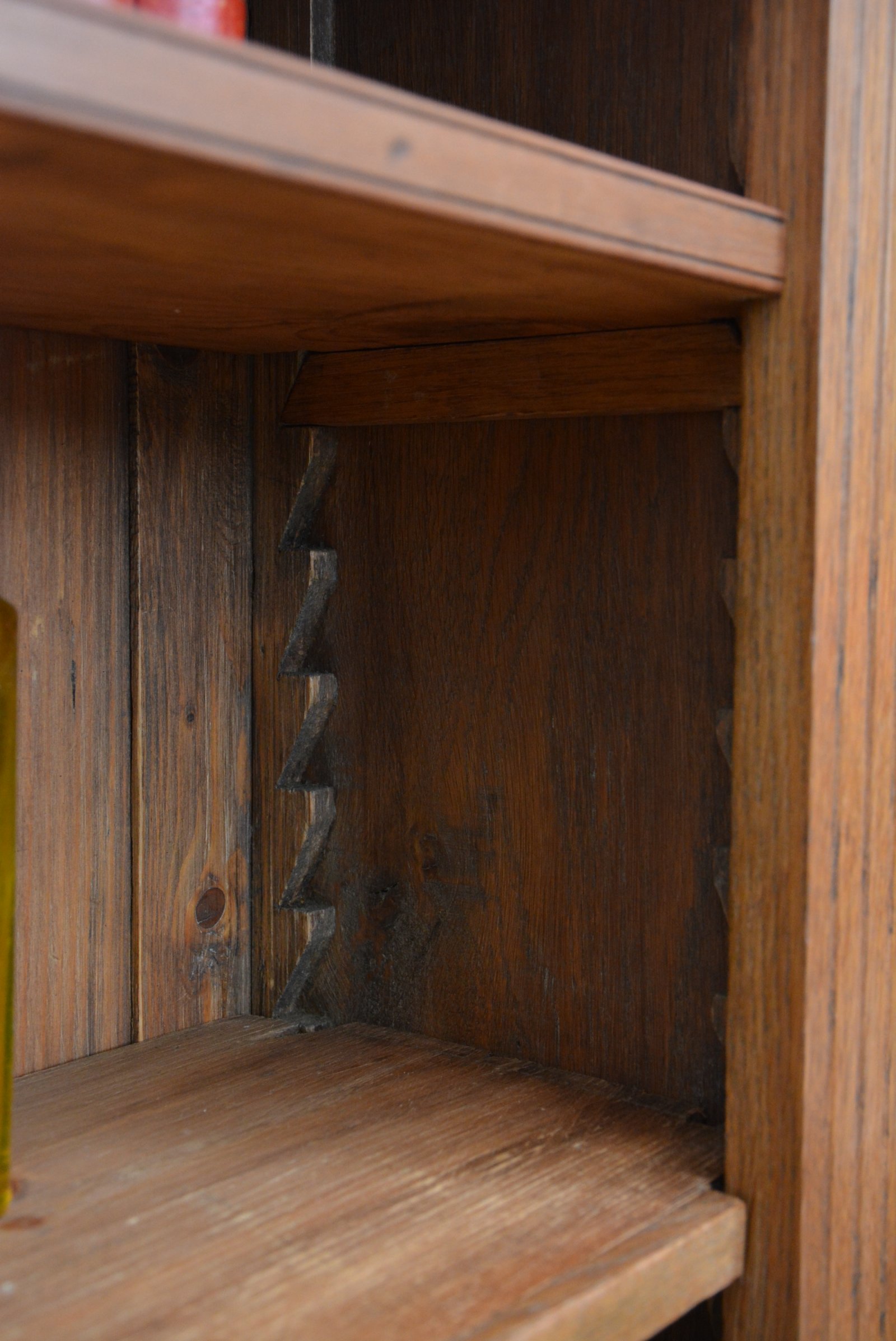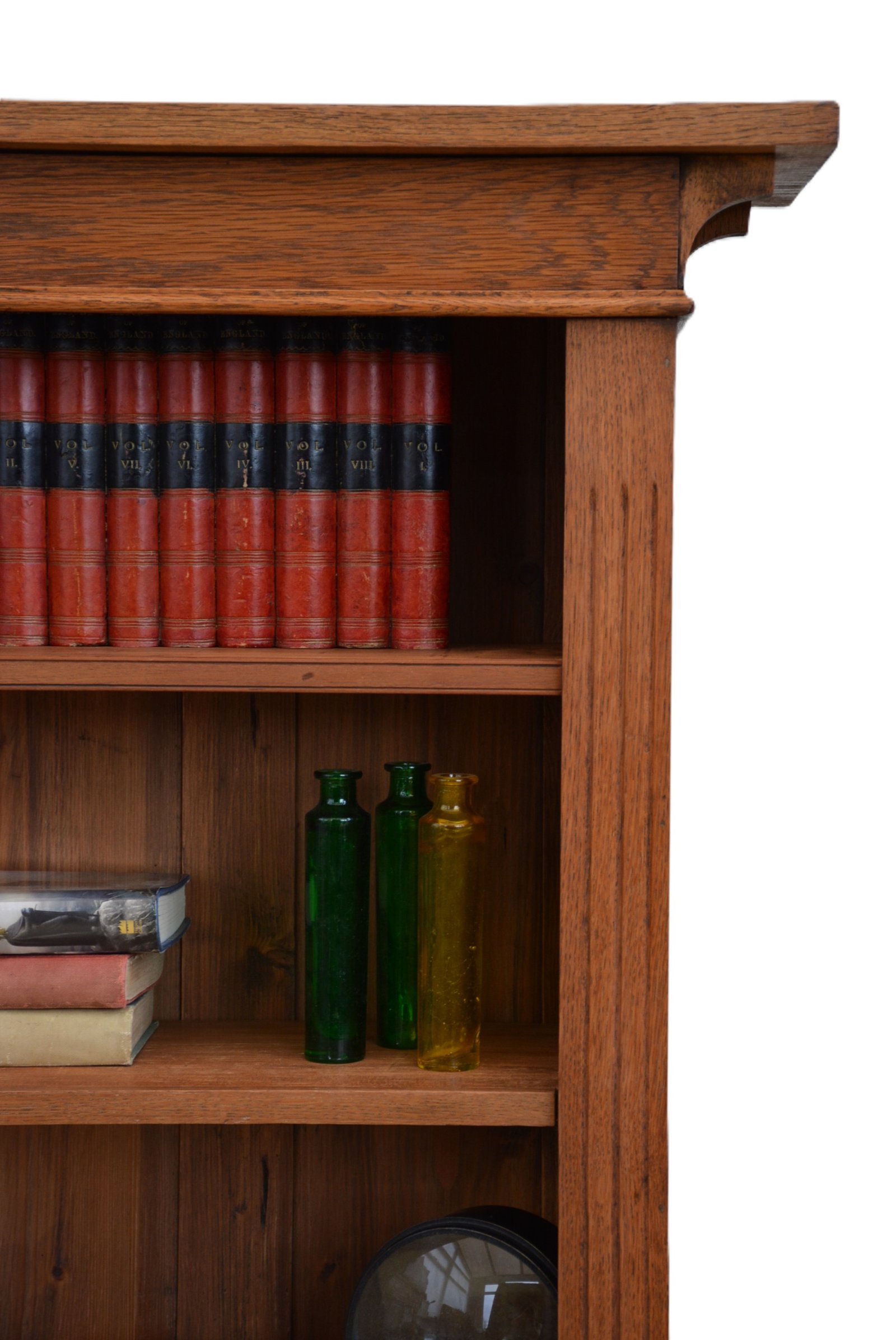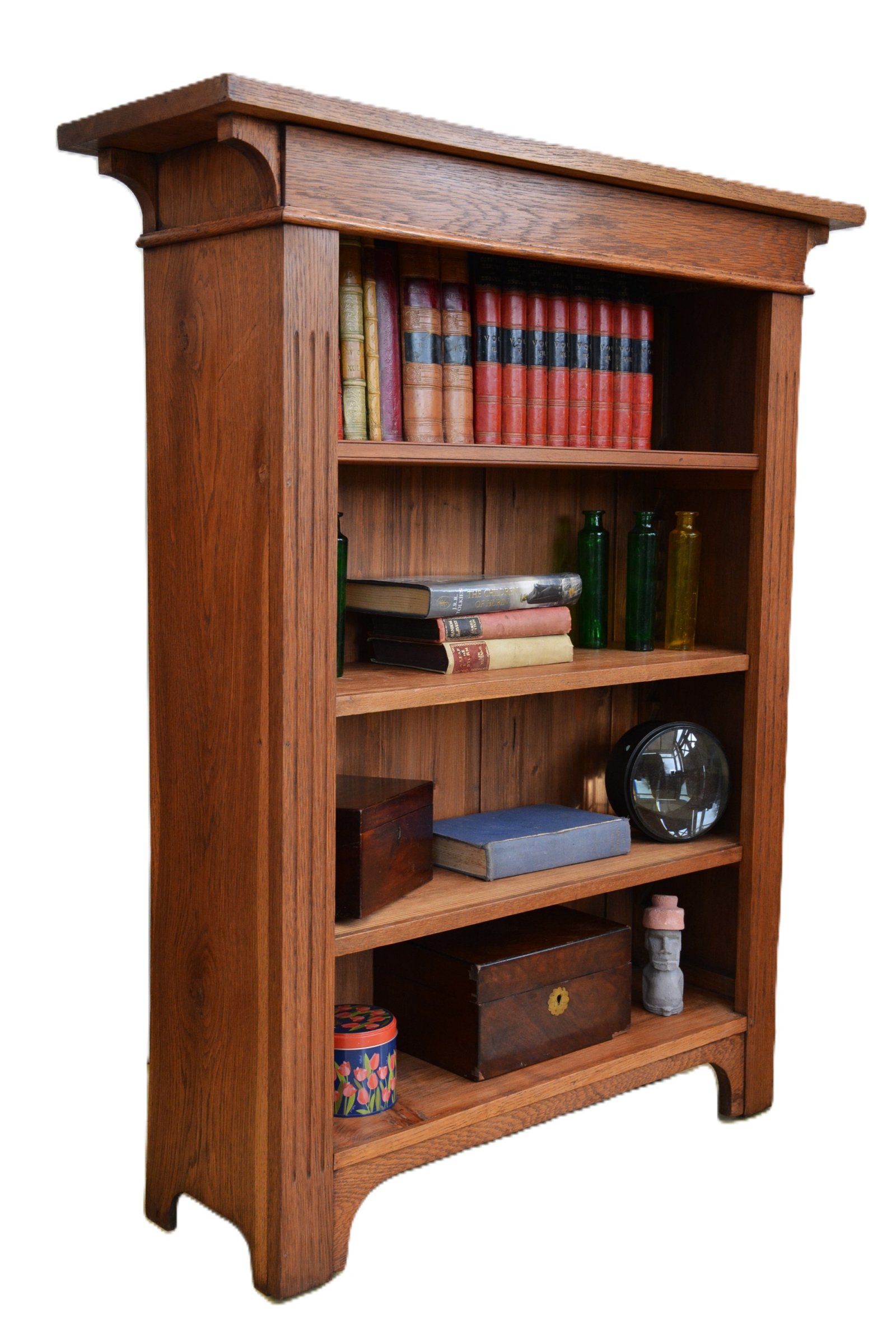 P0327 English antique Arts and Crafts solid oak bookcase of narrow proportions, having single piece of timber, oversialing top above a shallow frieze with stylish Arts and Crafts decorative brackets and three height adjustable shelves, one addtional, unoriginal and with a slightly diffrent front egde which doesn't effect its funtionality. The bookcase having single plank sides also in solid oak, terminating in shaped feet united by an apron. This antique bookcase has been cleaned and it retains its wax finish. No cracks, no splits, no woodworm. The bookcase has been very well looked after over the years and is in home ready condtion. c1900