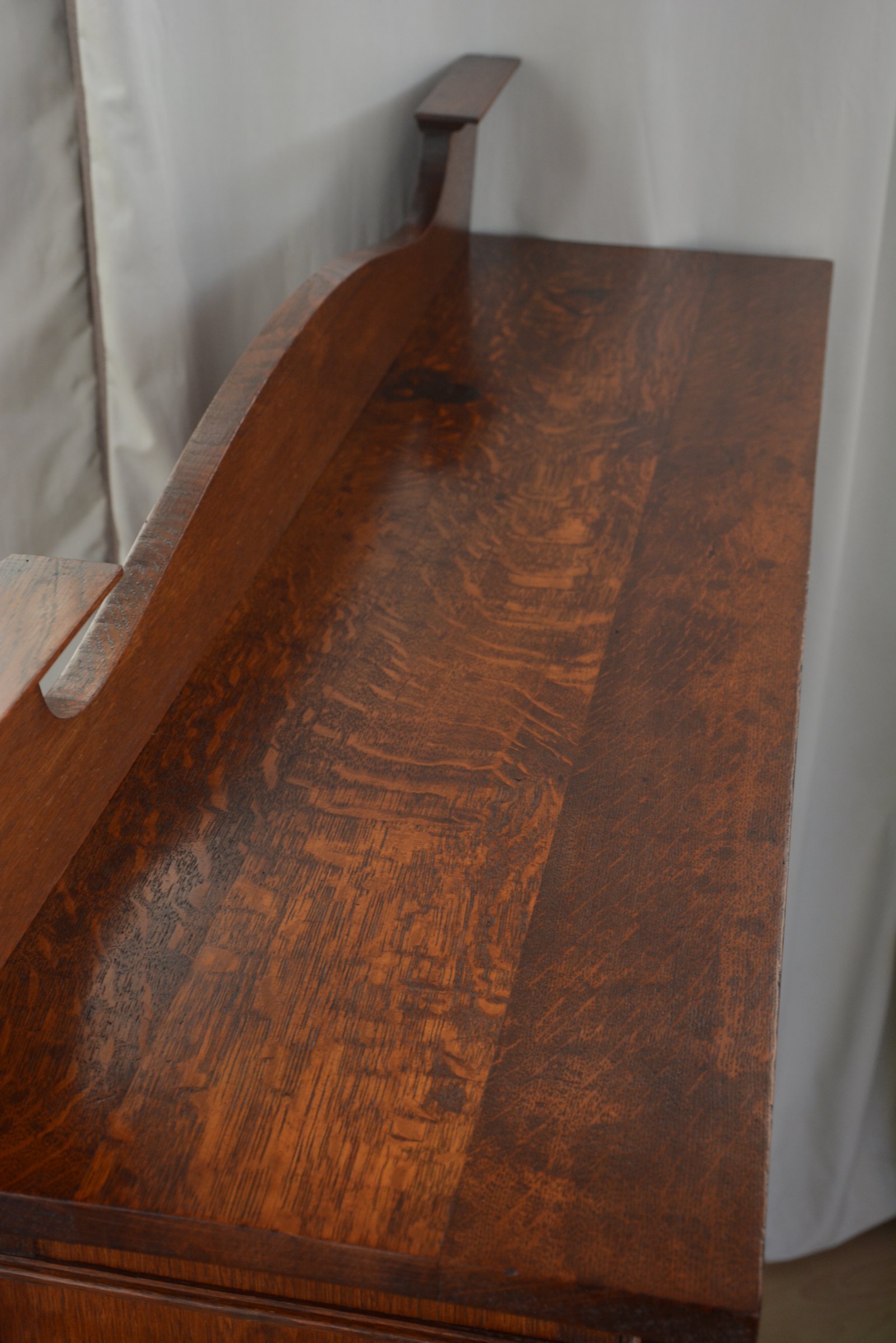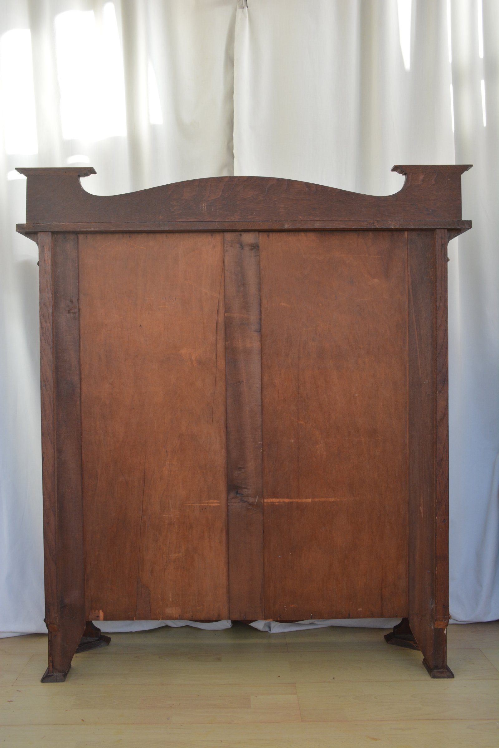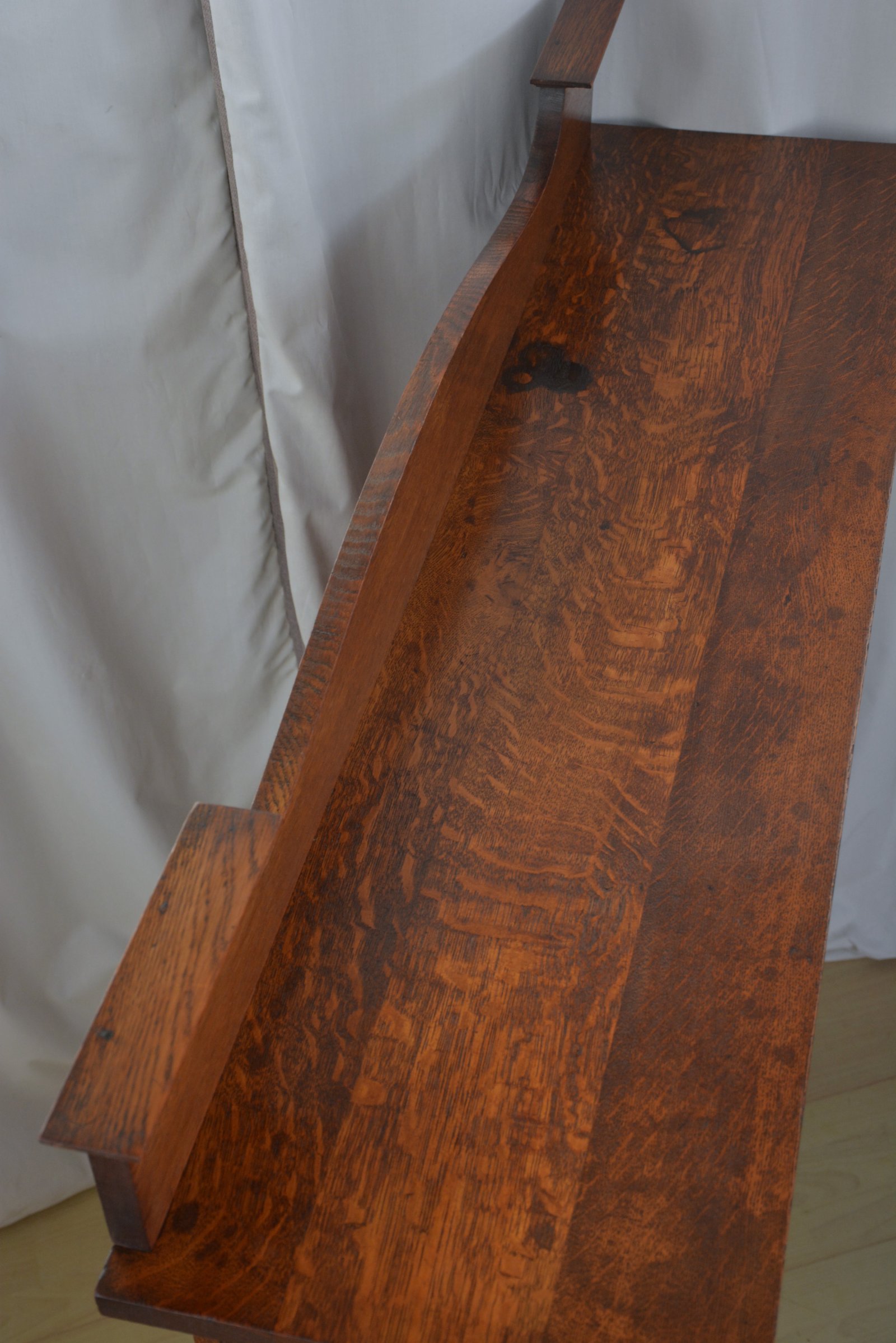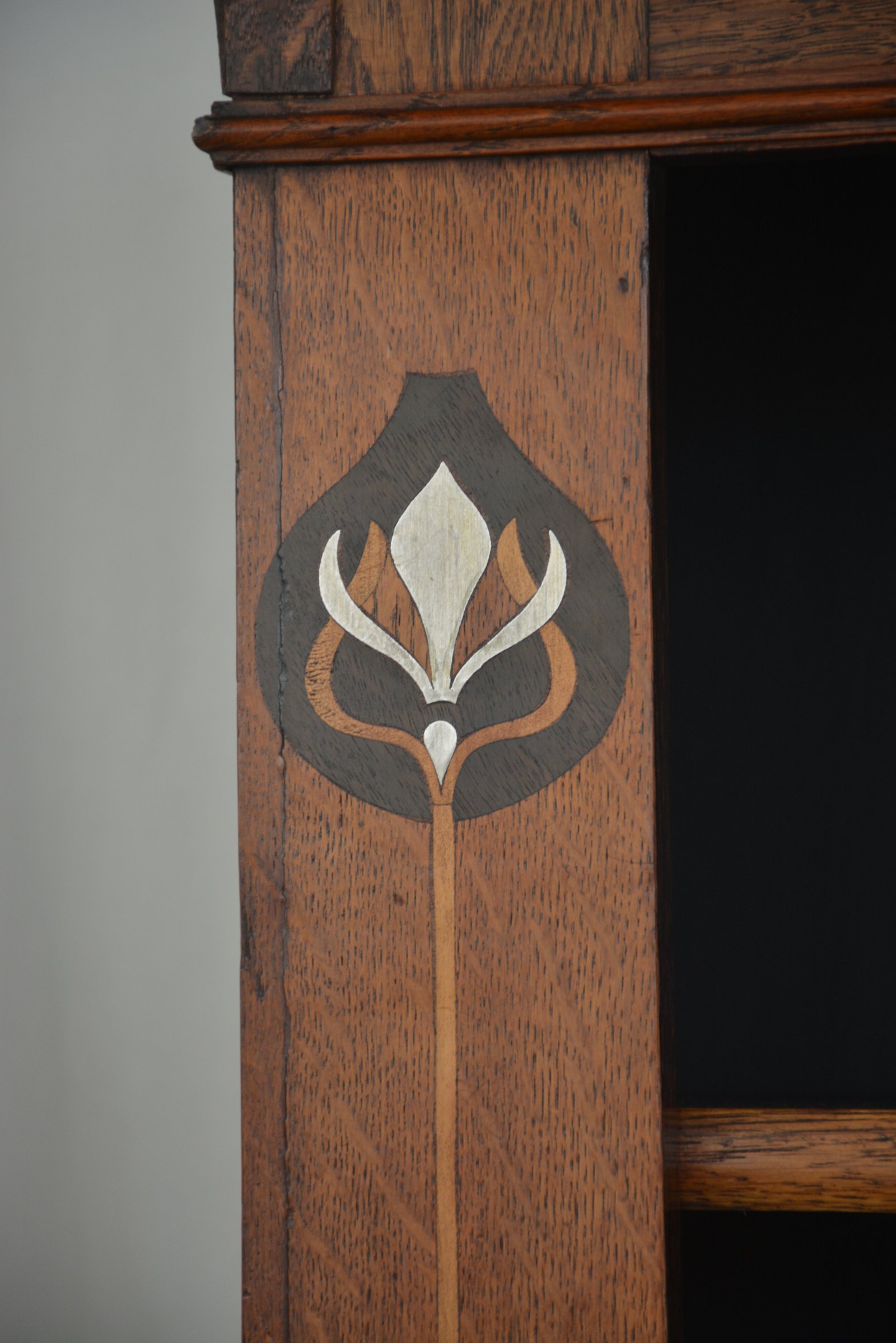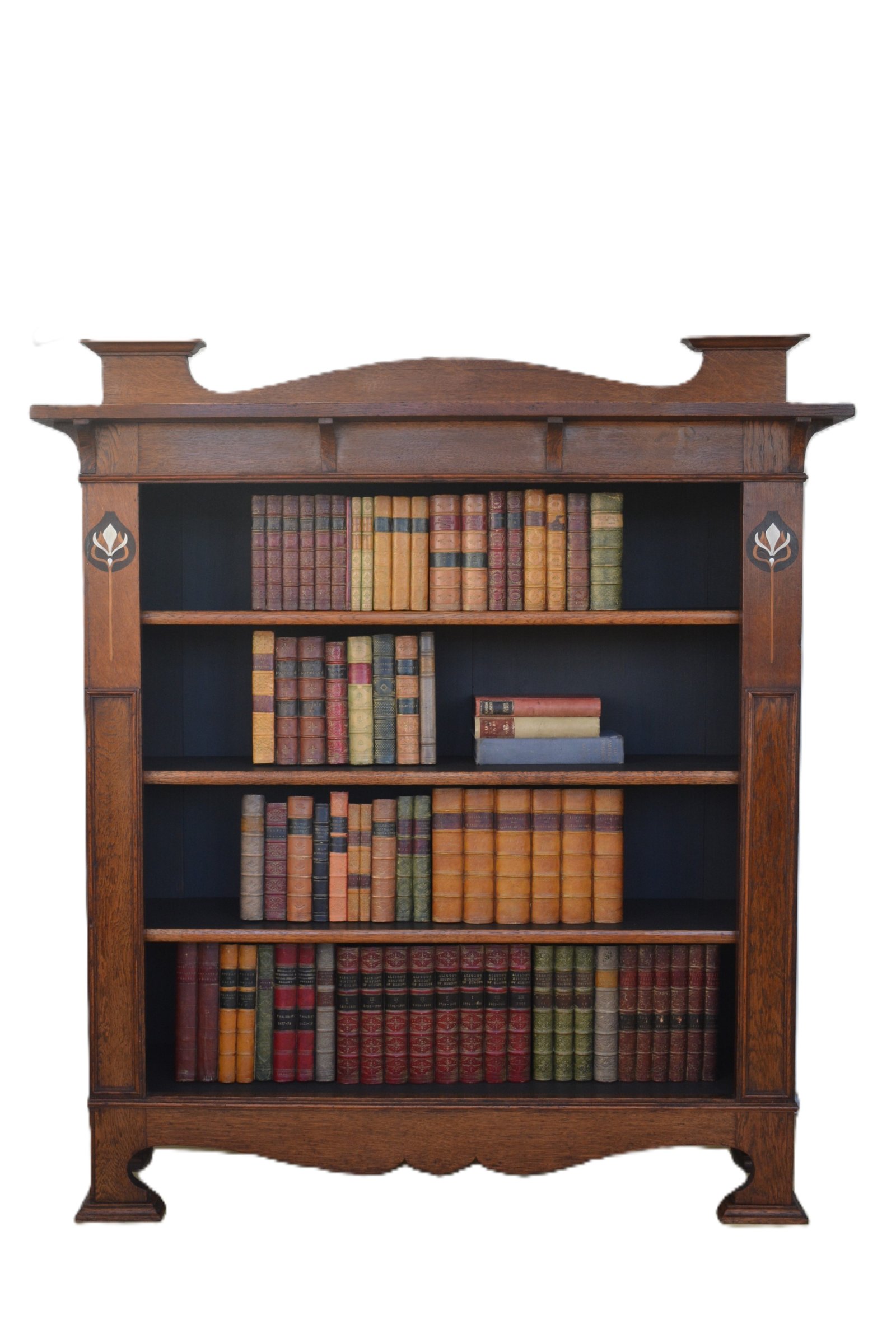 K0638 Stylish Arts and Crafts open bookcase in solid oak, having shaped and moulded upstand to the back (can be removed for transportation), solid oak oversailing top, shallow frieze with shaped supports and three height adjustable shelves, all flanked with finely inlaid uprights with moulded panels, all raised on shaped bracket legs with pad feet, united by shaped apron. This antique bookcase retains its original finish which has been revived and waxed, original soft patina and mellow colour, all in home ready condition. c1900