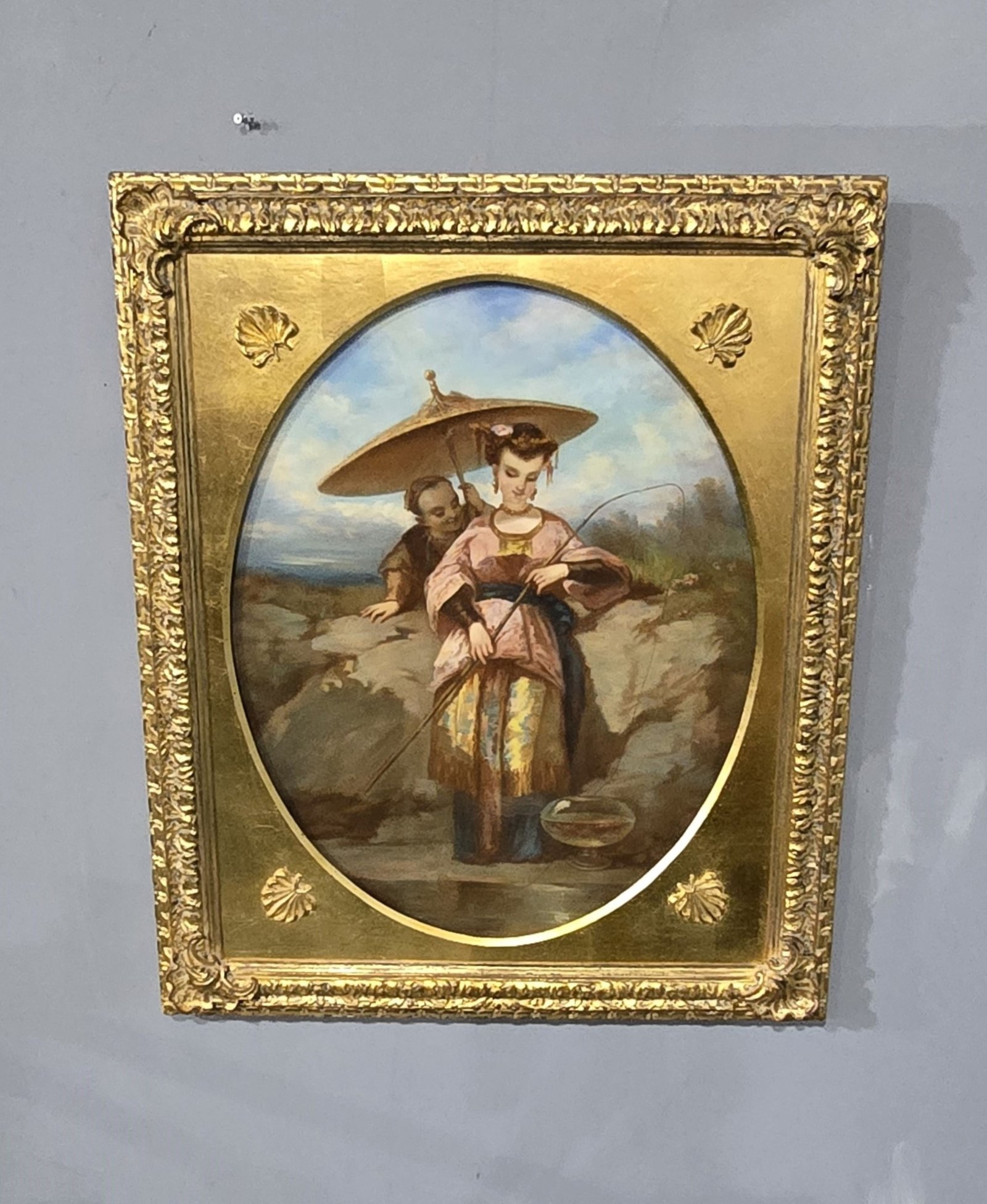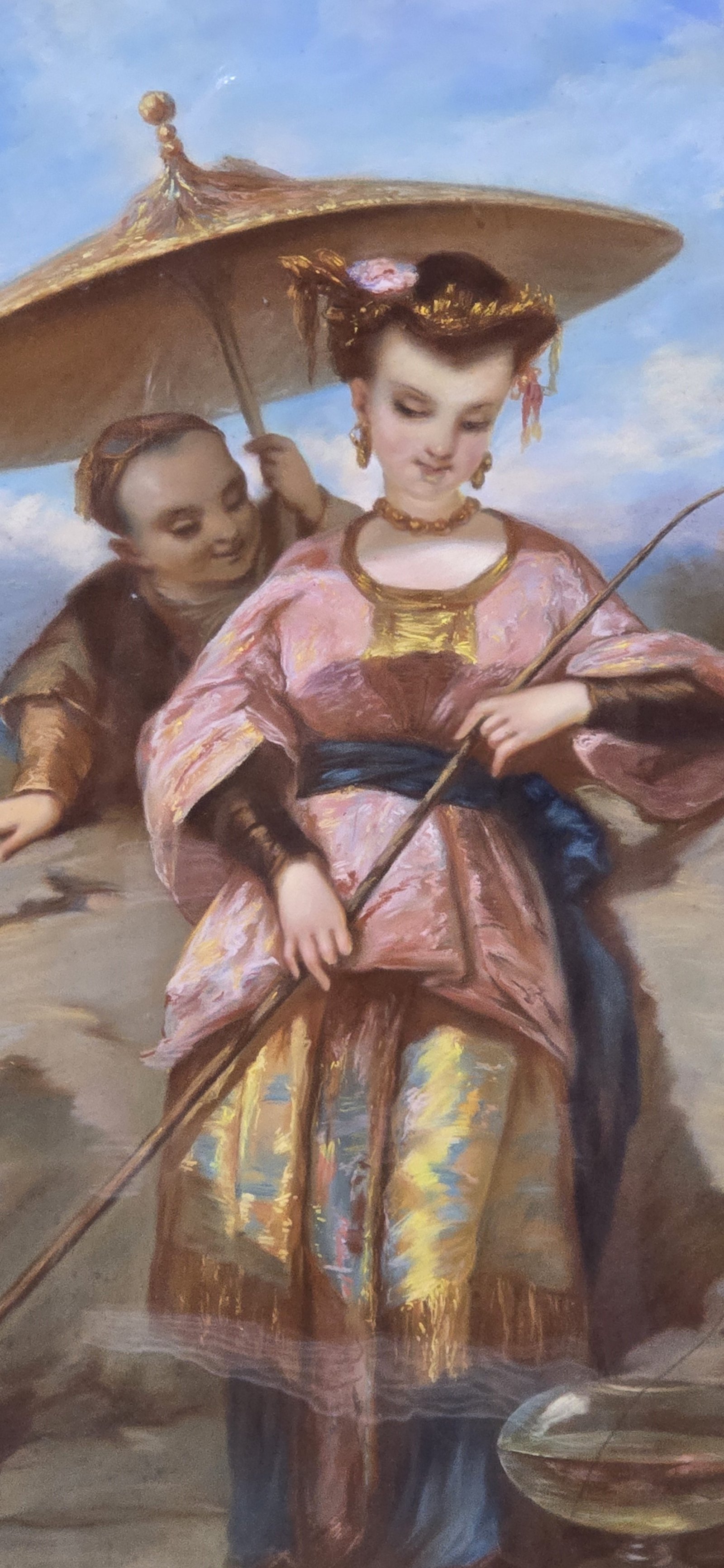 19th century school, a Chinese lady fishing a rock pool, an attendant with a parasol behind her, oval pastel on canvas, in gilt frame with glass front, in very nice overall condition.