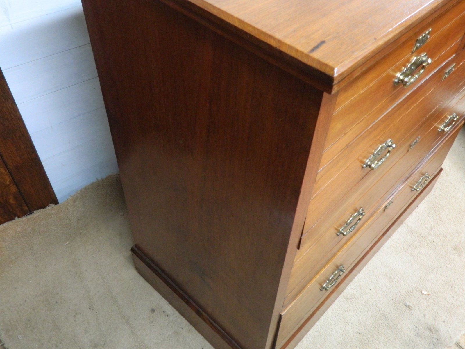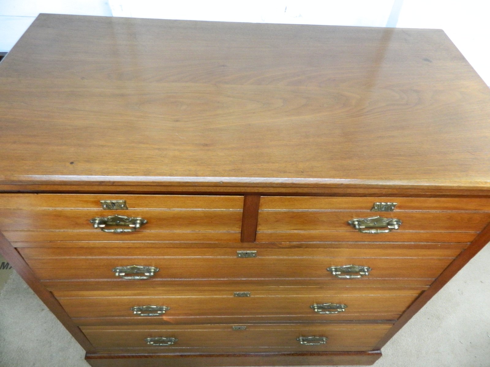 This stunning walnut chest of drawers is from the 1800's with 2 short over 3 long graduating drawers, the drawer bases are mahogany just adding more quality to this chest of drawers, the drawers slide freely, with all locks in place no keys. The original brass handles and brass estcheons. The original makers badge is still in place Blyth and Sons,. This just adds more provenance to this chest of drawers, there is plenty of information about them on the internet, There is a small burn on the top corner and 2 drawers have had repairs, this does not affect the strength of the bases, the chest stands on a plinth base. Age related marks , please see all pictures for condition