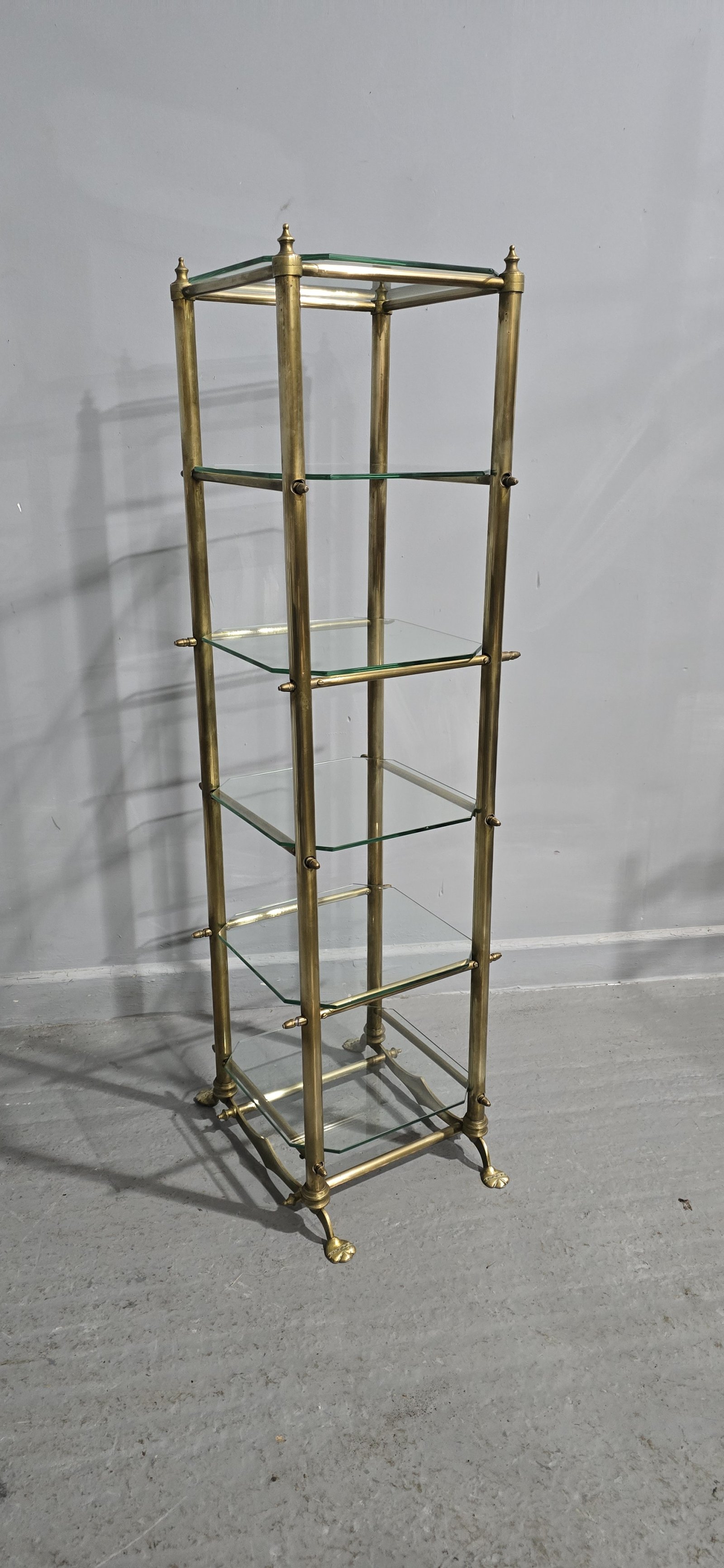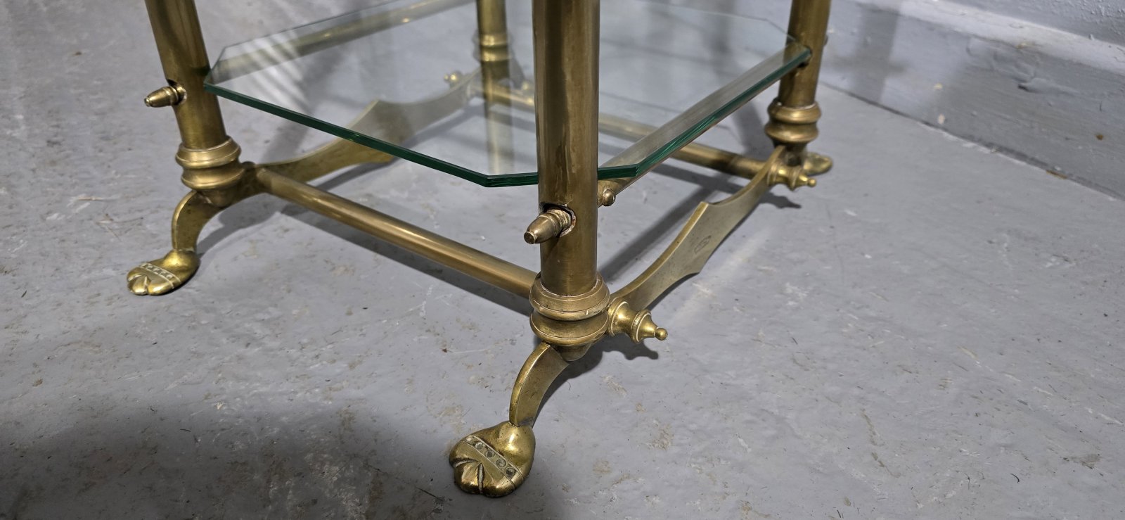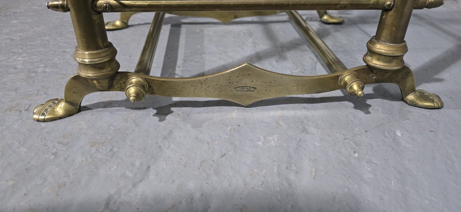 A wonderfull solid brass and glass shopp fitting stand, with turned brass finials and bar ends, standing on paw feet, made and stamped by Harris and Sheldon Ltd Birmingham, in wonderful original condition.