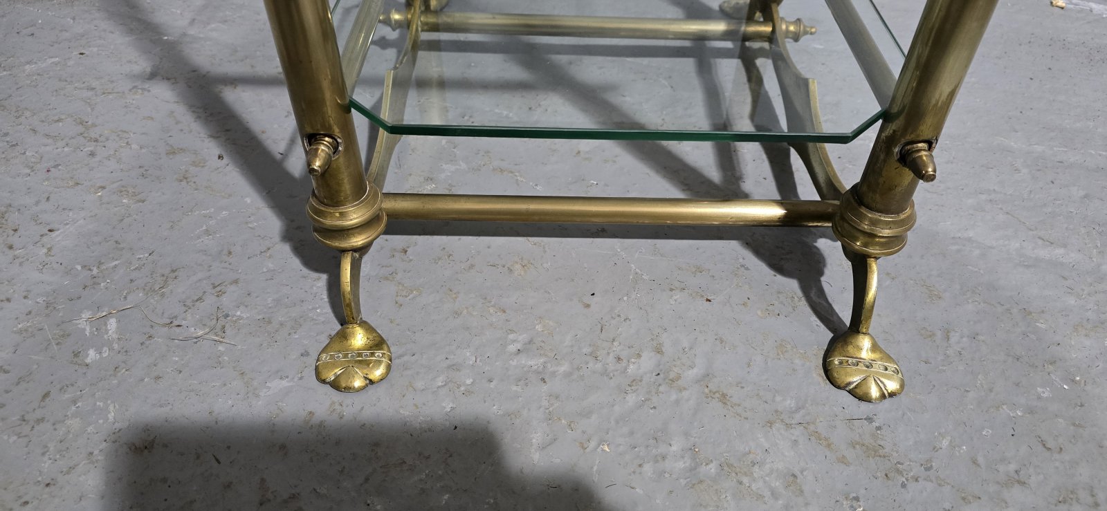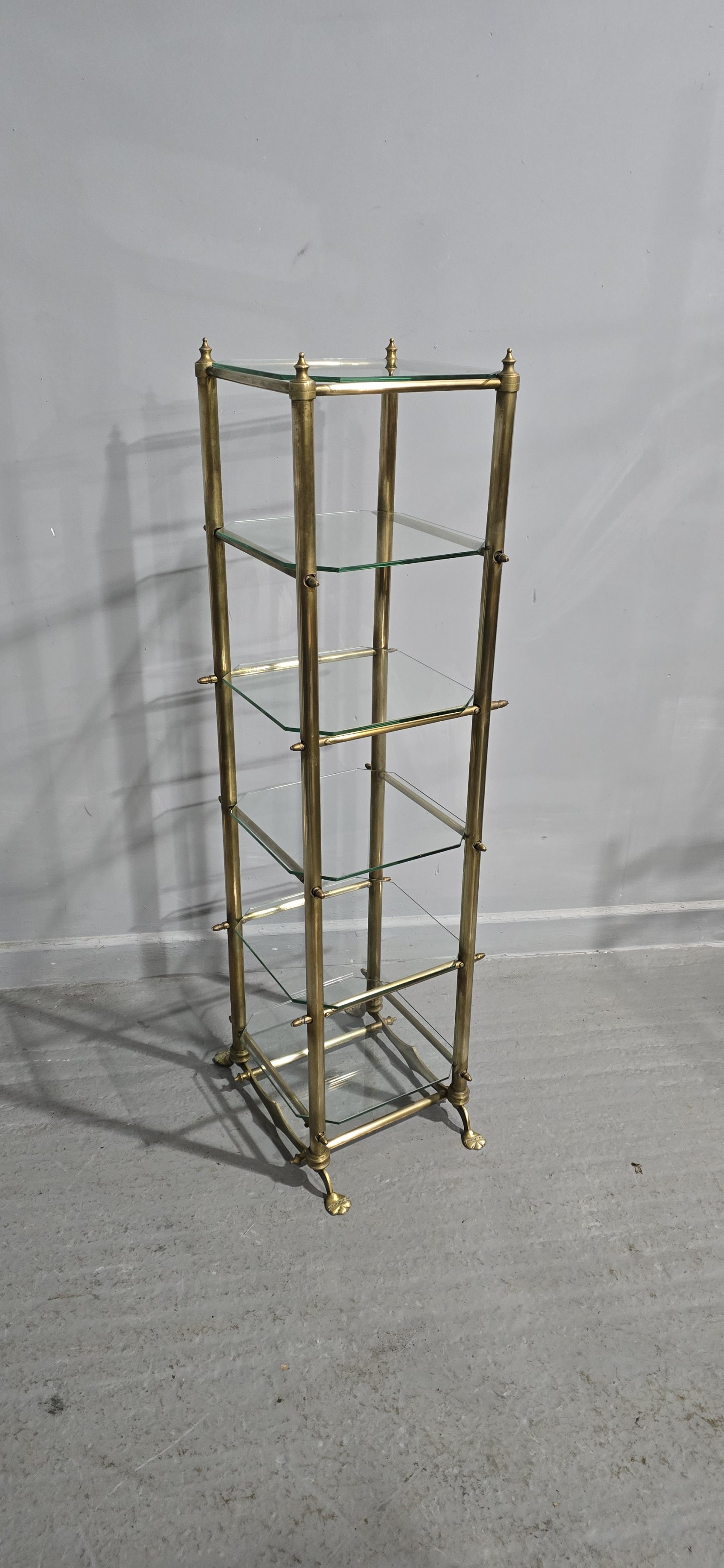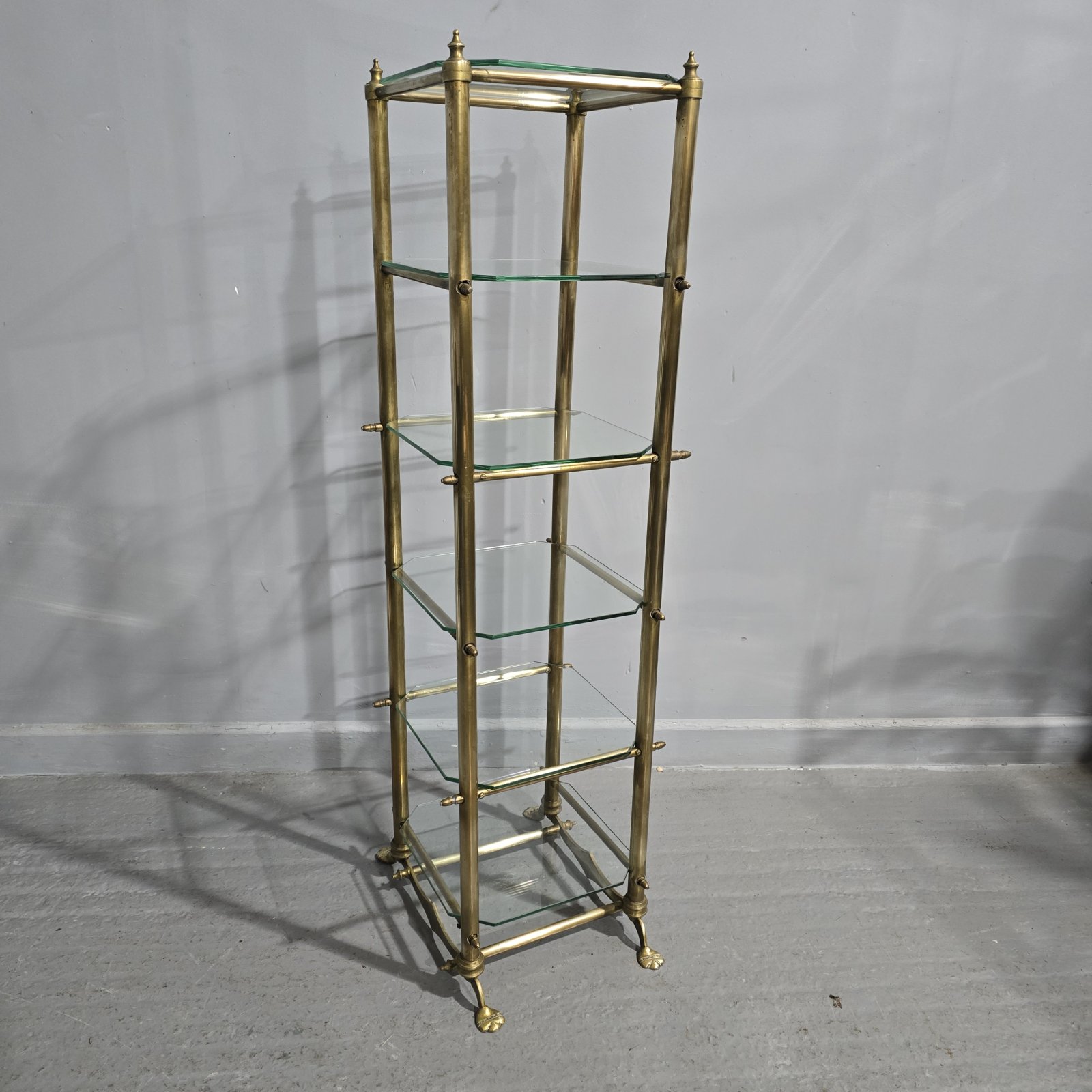 A wonderfull solid brass and glass shopp fitting stand, with turned brass finials and bar ends, standing on paw feet, made and stamped by Harris and Sheldon Ltd Birmingham, in wonderful original condition.