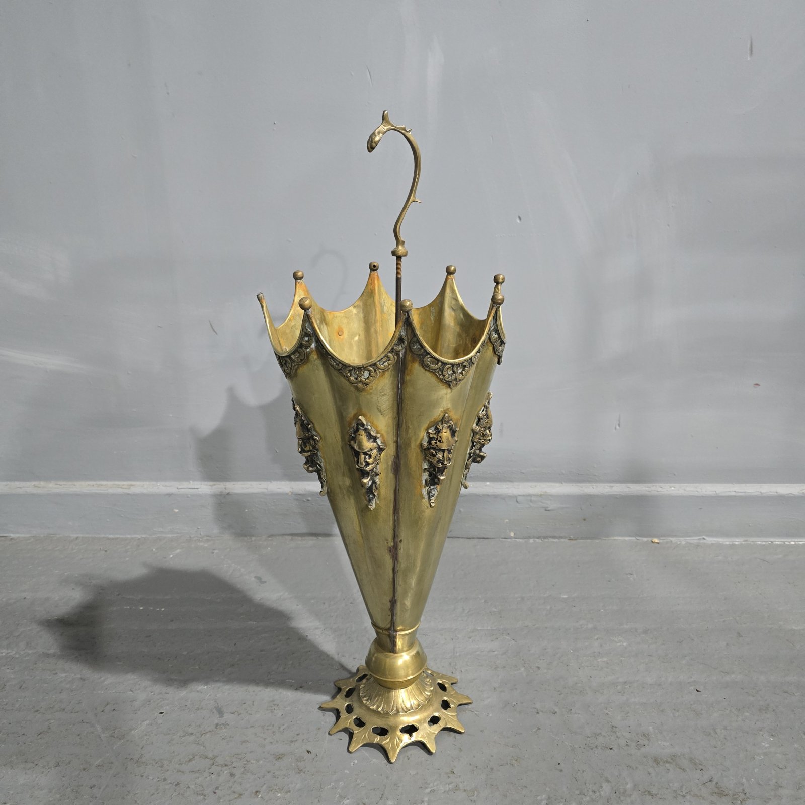 Brass umbrella stand with devil masks to the sides, overall great original condition.