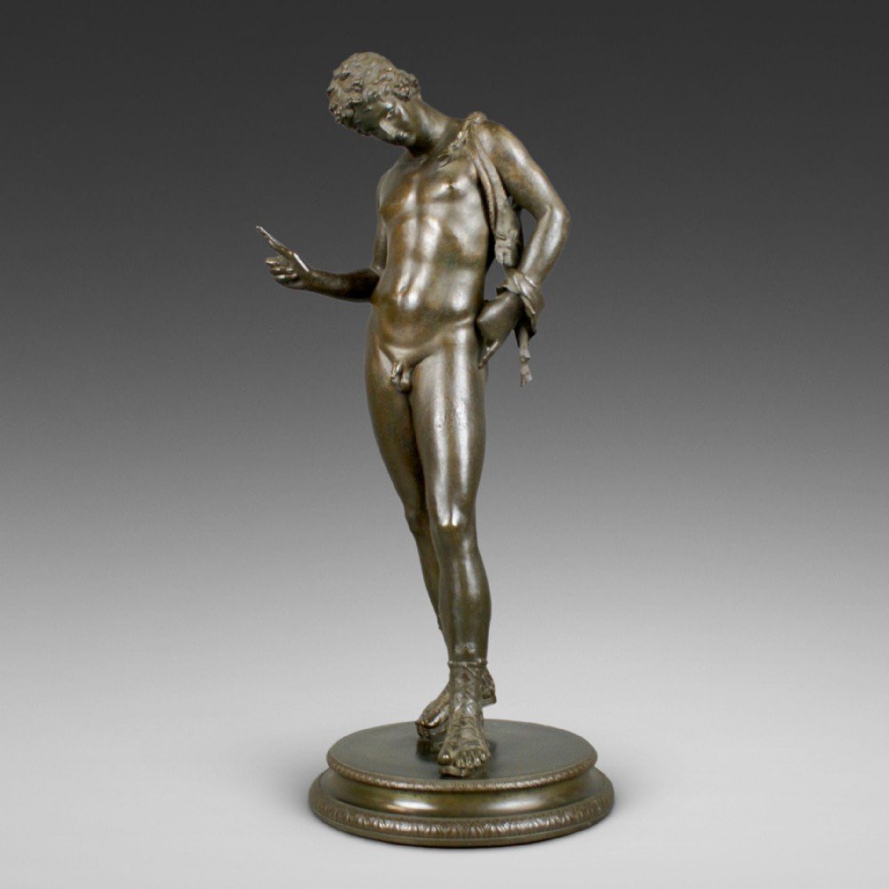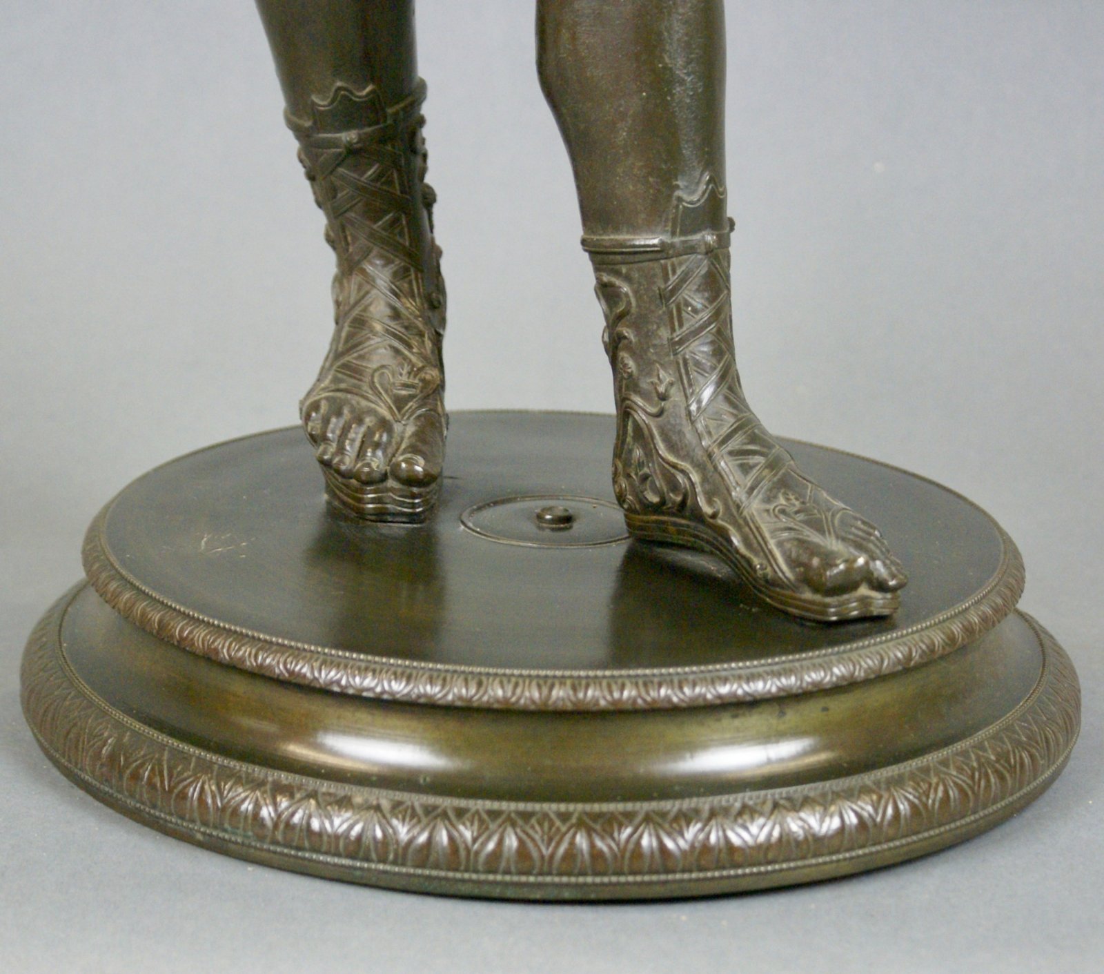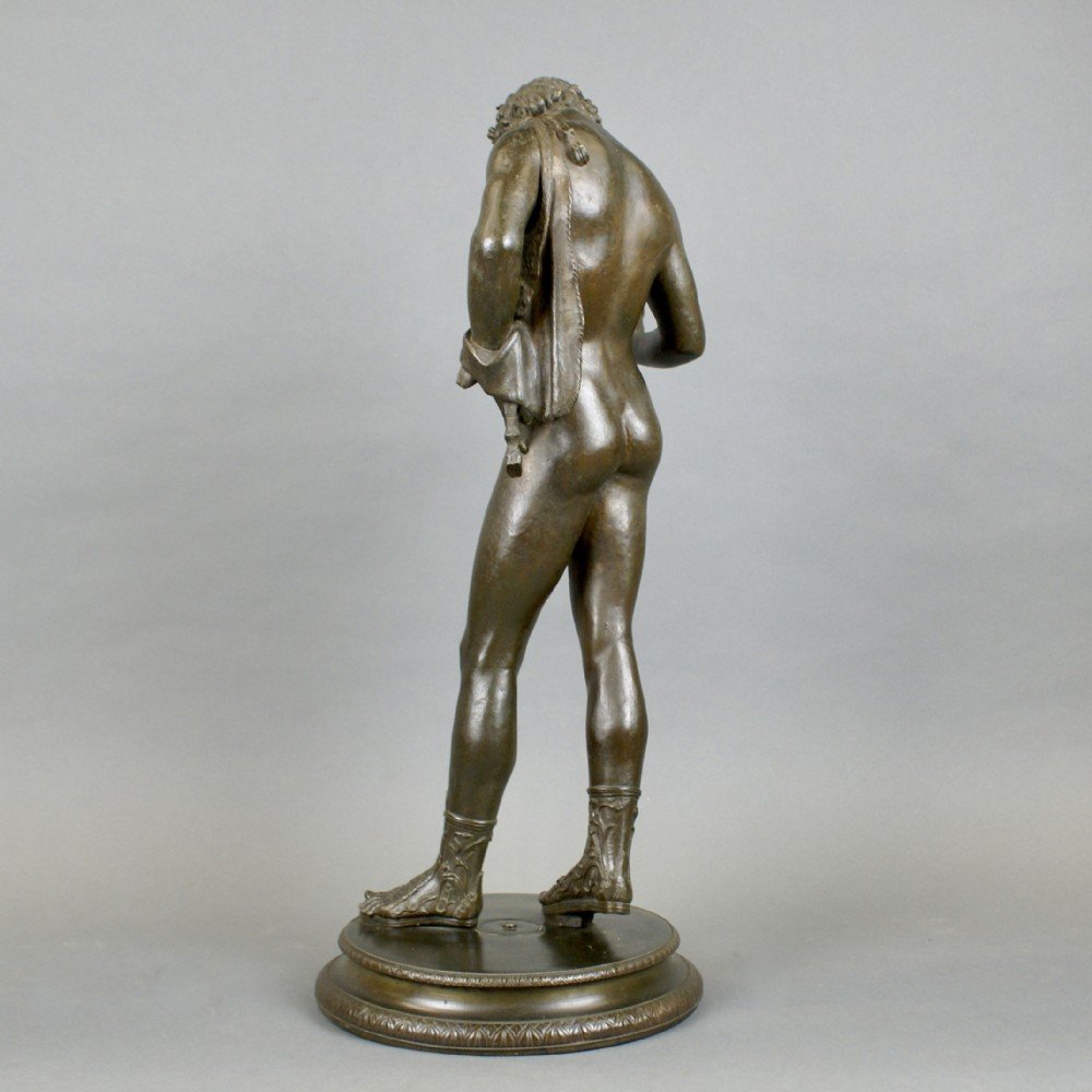 Bronze a figure of Bacchus; after a model by Vincenzo Gemito (1852-1929). A large reproduction of a bronze figure of Bacchus (Dionysus), the Roman god of wine, discovered in Pompeii in 1862, and today in the Museo Nazionale Archaeologico in Naples. Long thought to be a figure of the youth Narcissus, he stands looking downwards, left foot forward, naked except for sandals and a small animal skin around left arm, his right hand raised in admonition. The statuette is fixed to a circular separately cast base, decorated with palmette pattern. In very good condition and with a lovely patinated finish. 640mm high, 310mm wide and 260mm deep. Italian. Circa 1890.