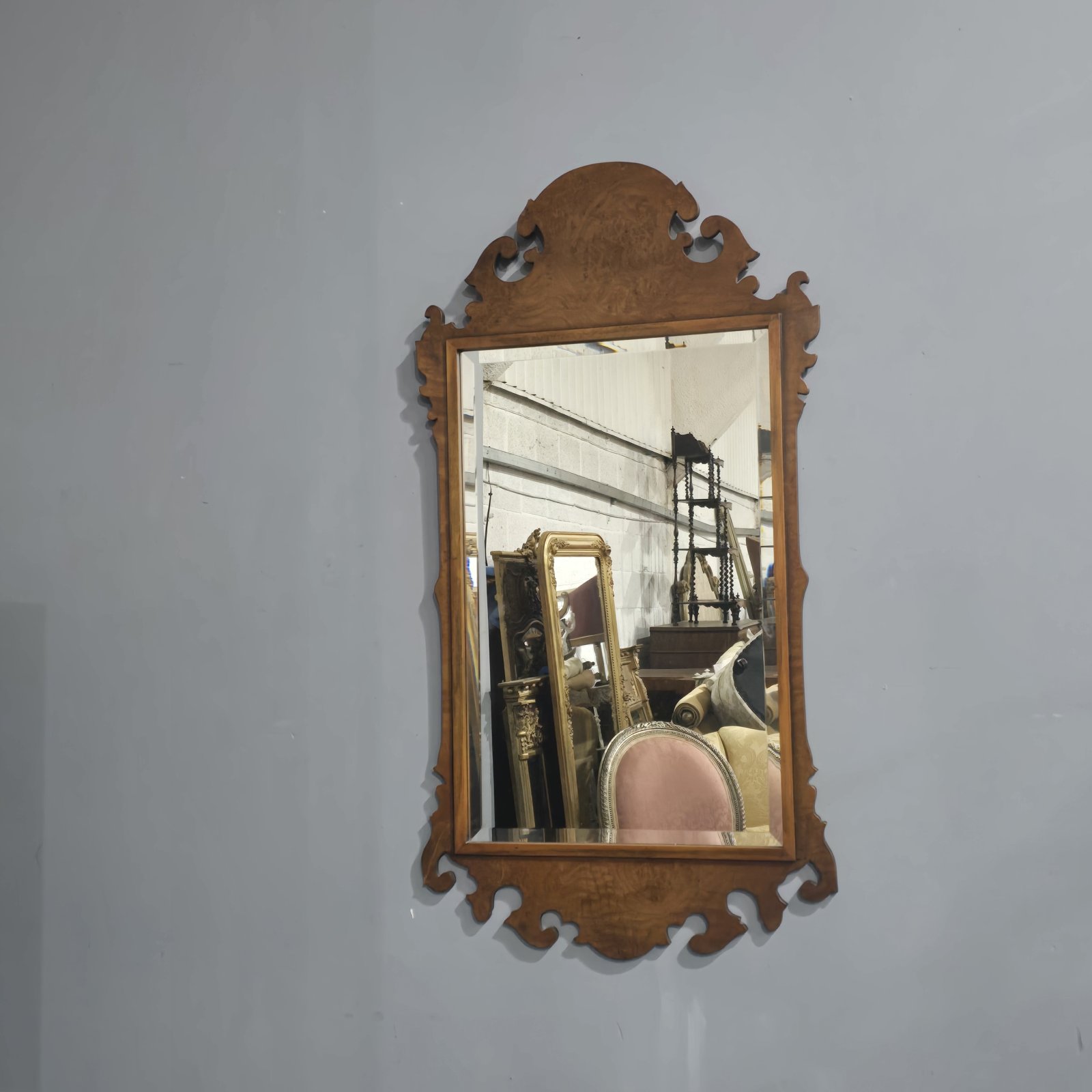 Very good Queen Anne style burr walnut wall mirror, with bevelled mirror plate, in overall very good condition.