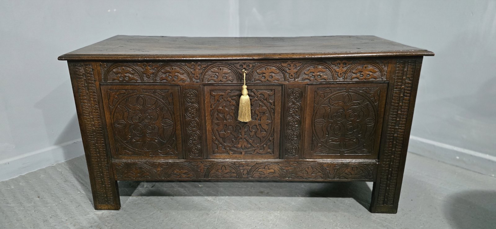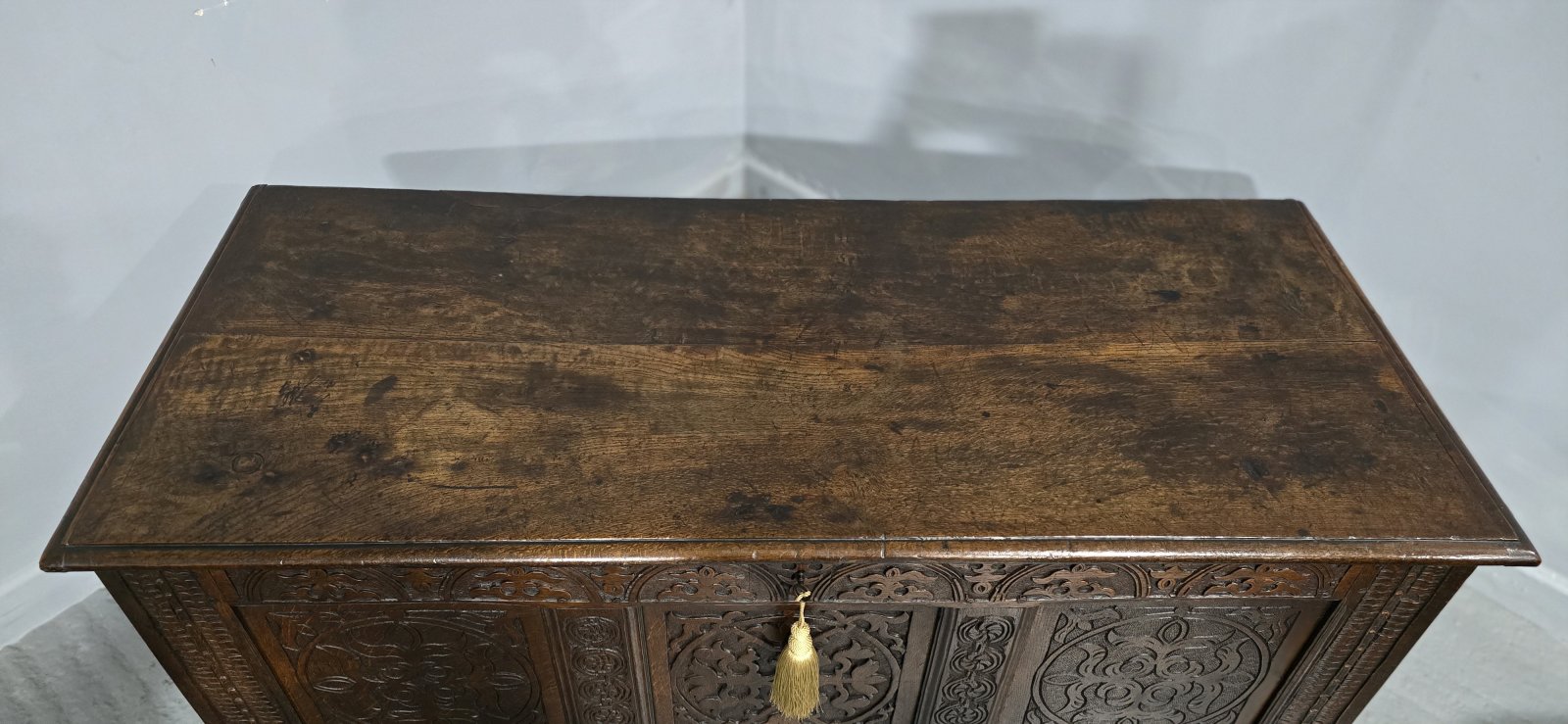 A superb C17th, Charles 1 oak three panel coffer, with two plank top, original paper lining, original condition with working lock, super colour and condition.