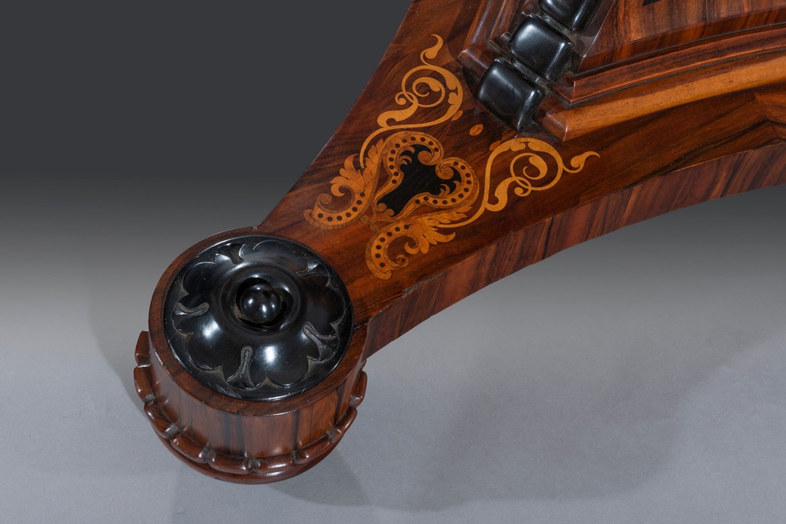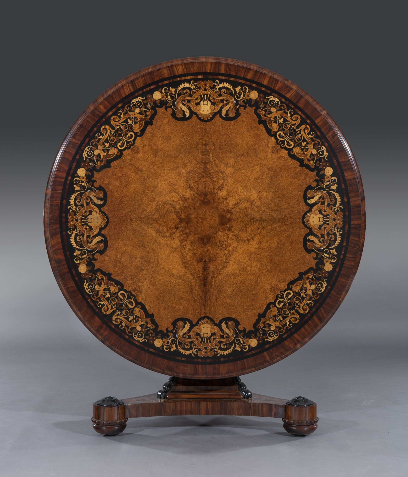 The circular top is quarter veneered with amboyna and profusely decorated around the perimeter. The ebony, walnut, boxwood, amboyna, satinwood and mother of pearl inlays that surround the edge are bordered and crossbanded in gonçalo alves and ebony. The Greek god Bacchus is depicted and flanked with mythical winged griffins and centred with a harp shaped motif. The figures are surrounded with bunches of flowers, scrolls and swags. The inlay is sharp and crisp and framed within an ebony border.