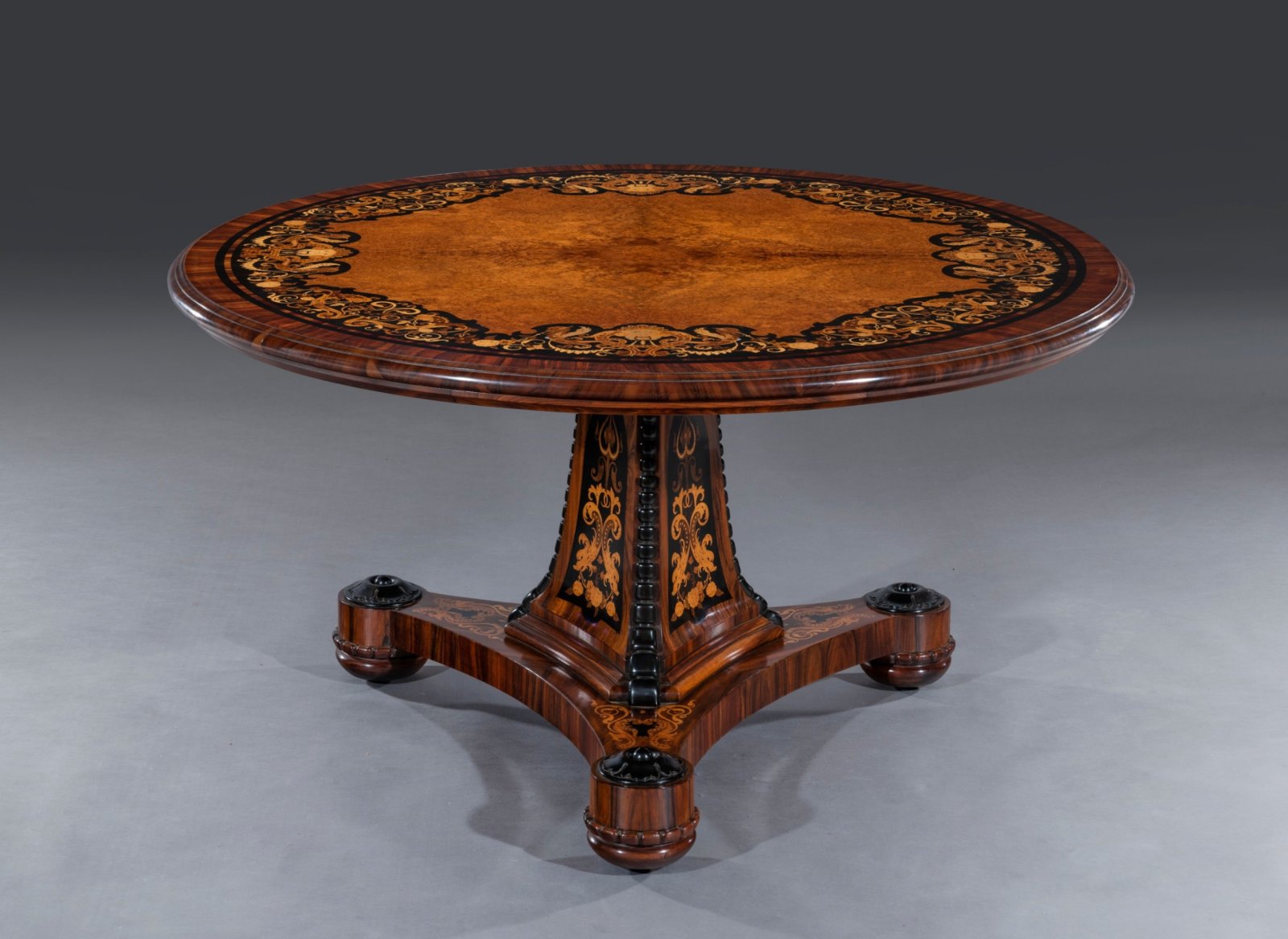 A superb mid 19th century gonçalo alves, amboyna inlaid centre table of exhibition quality.