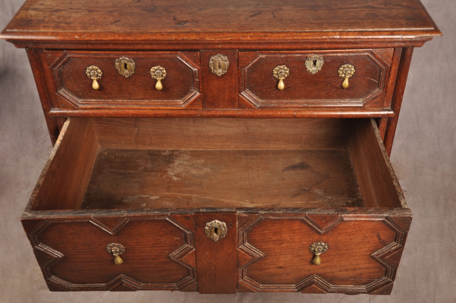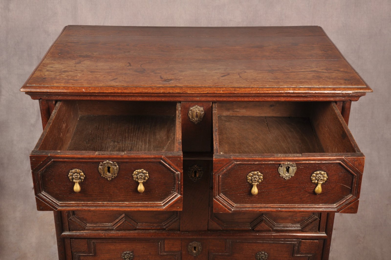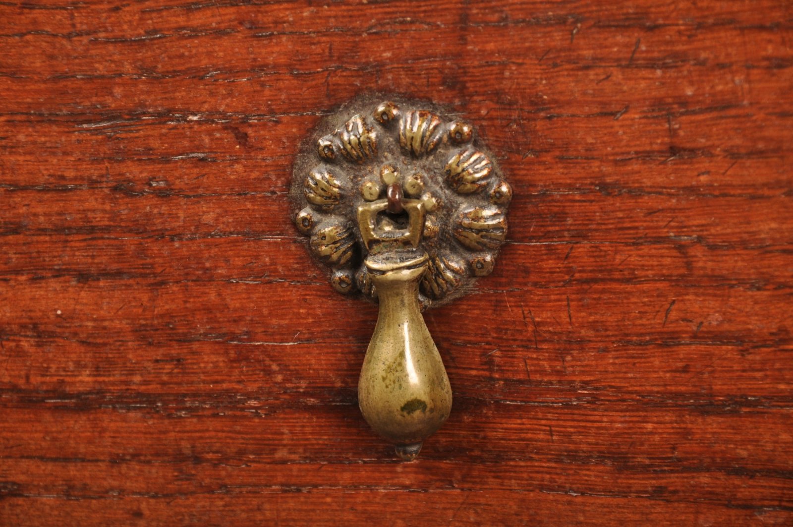 Remarkably retaining all original pear drop handles with decorated back plates, locks and all but one of the original escutcheons. The chest decorated with applied geometric mouldings which were fashionable at this early period, having double panelled ends with old replacement bun feet. The top is just a great colour and in lovely condition with thumb mould to the edge. The original drawer linings run really well and are in very good clean condition, made in Oak.