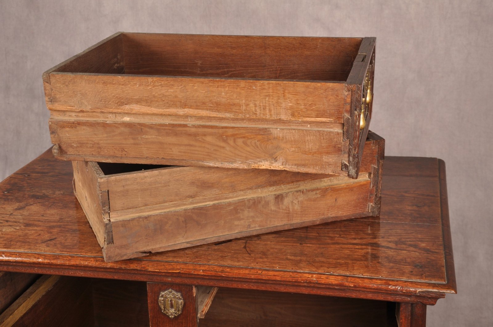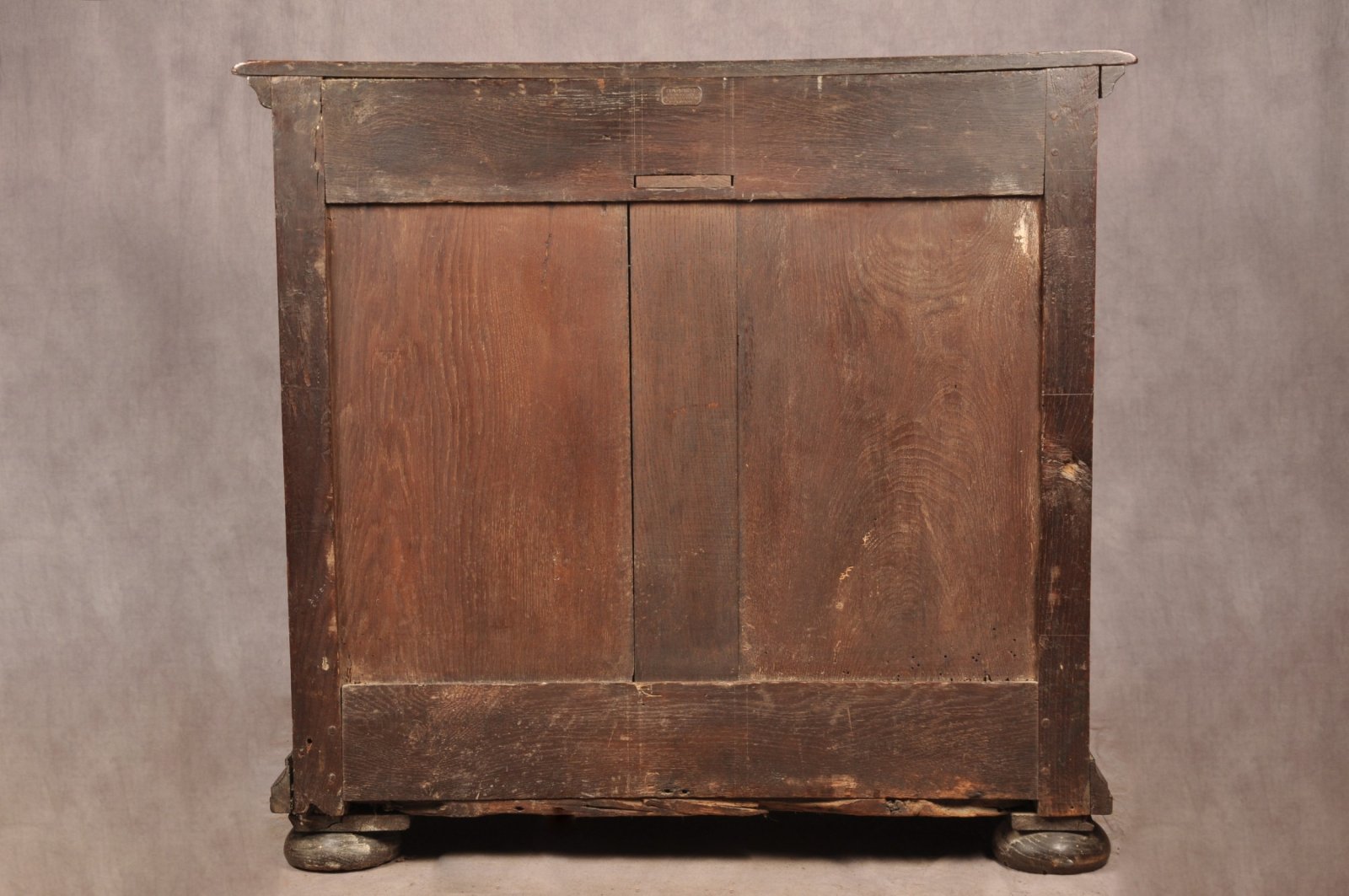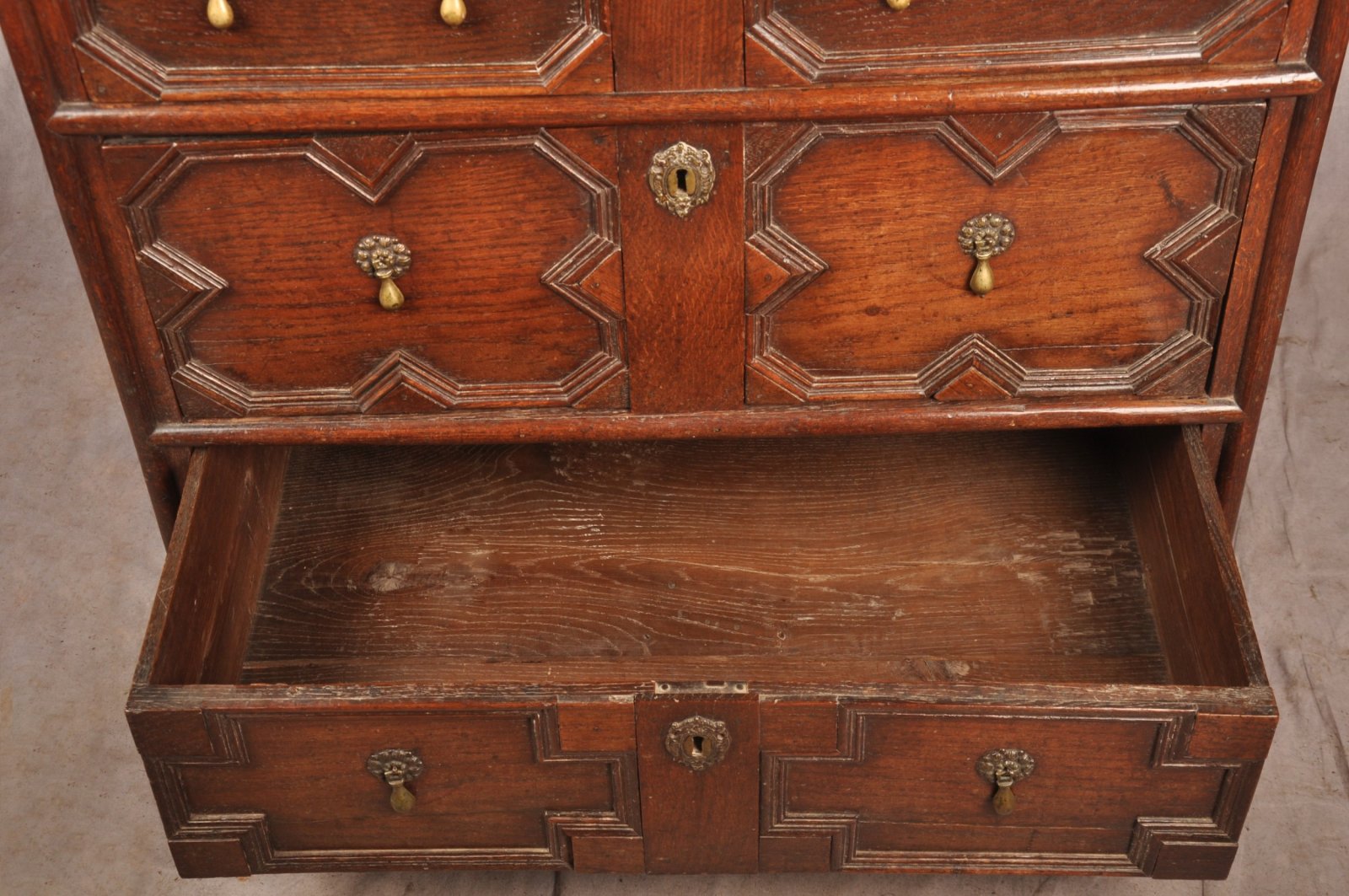 Remarkably retaining all original pear drop handles with decorated back plates, locks and all but one of the original escutcheons. The chest decorated with applied geometric mouldings which were fashionable at this early period, having double panelled ends with old replacement bun feet. The top is just a great colour and in lovely condition with thumb mould to the edge. The original drawer linings run really well and are in very good clean condition, made in Oak.