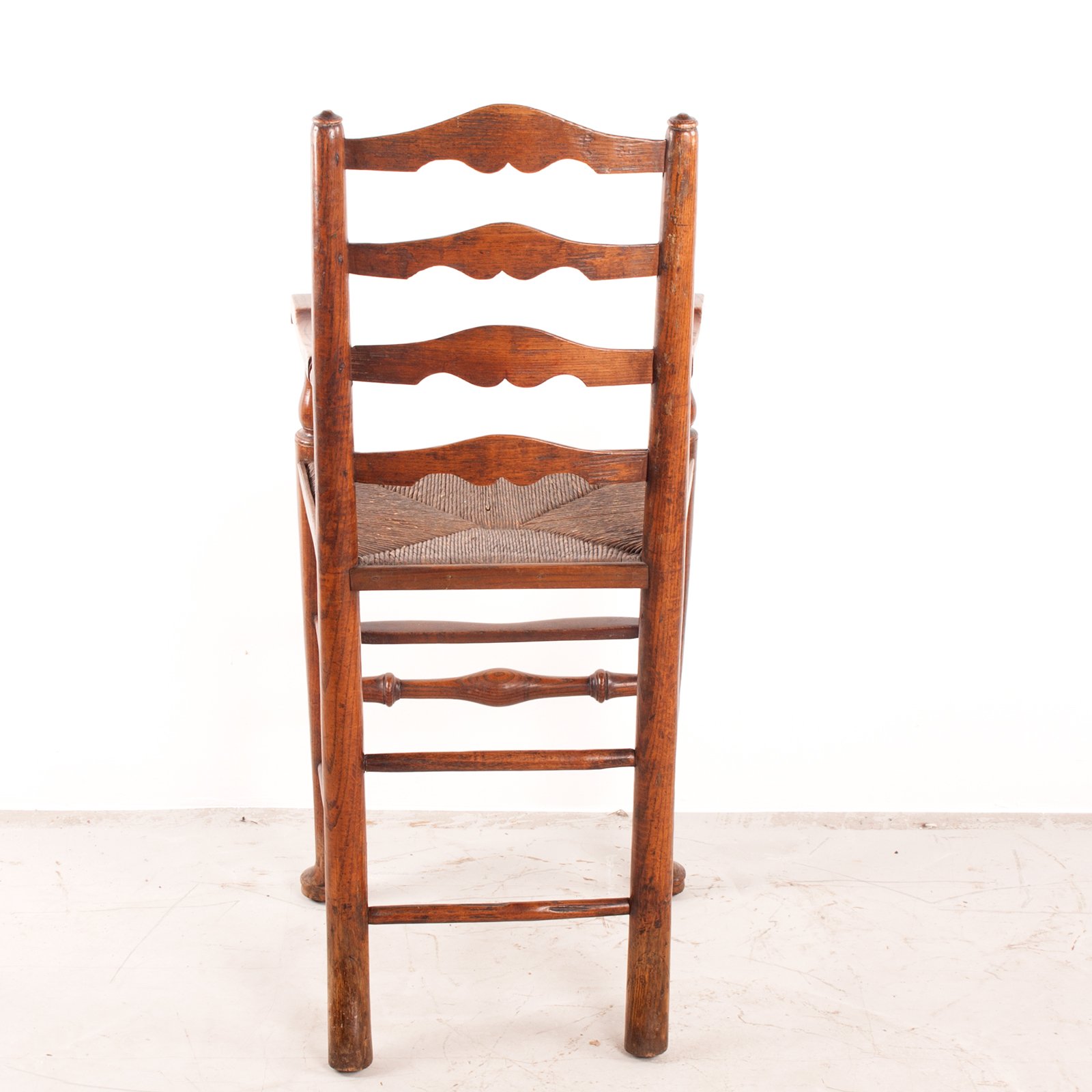 Made primarily from Ash which has a lovely warm tone to it along with strong figuring to the timber adds to the overall design. Two good sturdy arms help to add weight to the design, and the rush seat is done in the traditional manner.