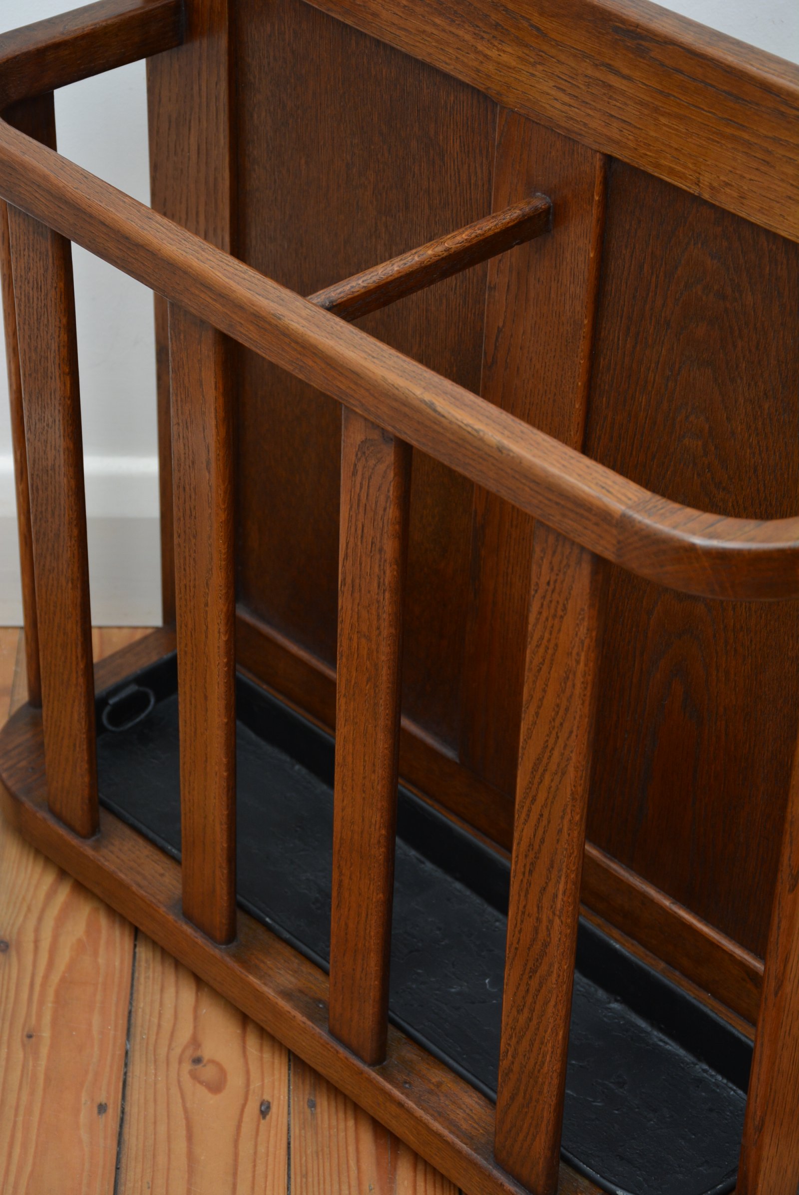 P0331 Very attractive antique Arts and Crafts country house umbrella stand on D shape outline, having panelled back, D shaped umbrella holder with two divisions raise on six uprights terminating in shaped base enclosing an original, removable drip tray. This antique umbrella stand has been cleaned and polished, it retains mellow colour, soft patina and antique character. No cracks, breaks, woodworm free. All in home ready condition. Can be fixed to the wall. c1900