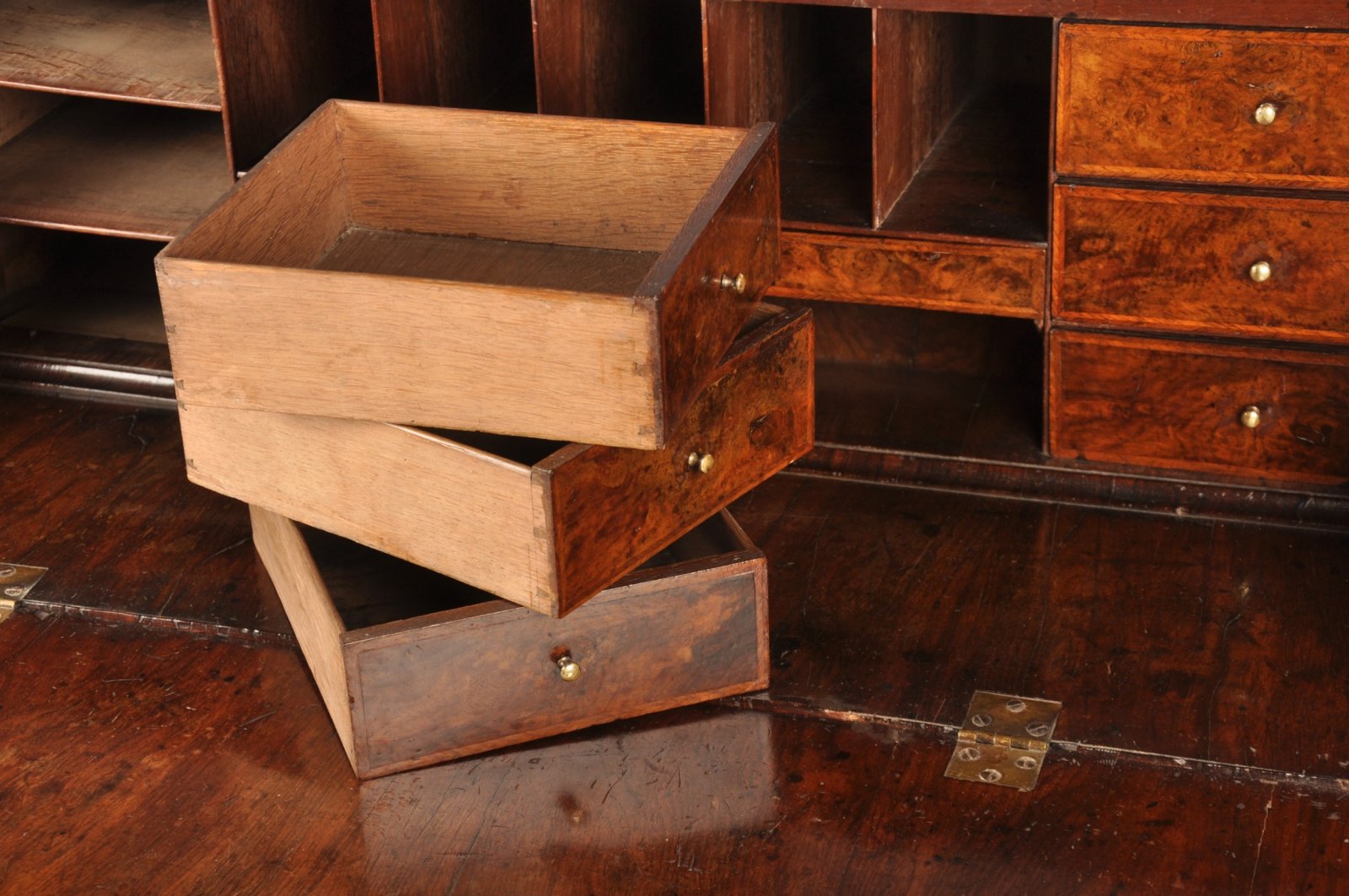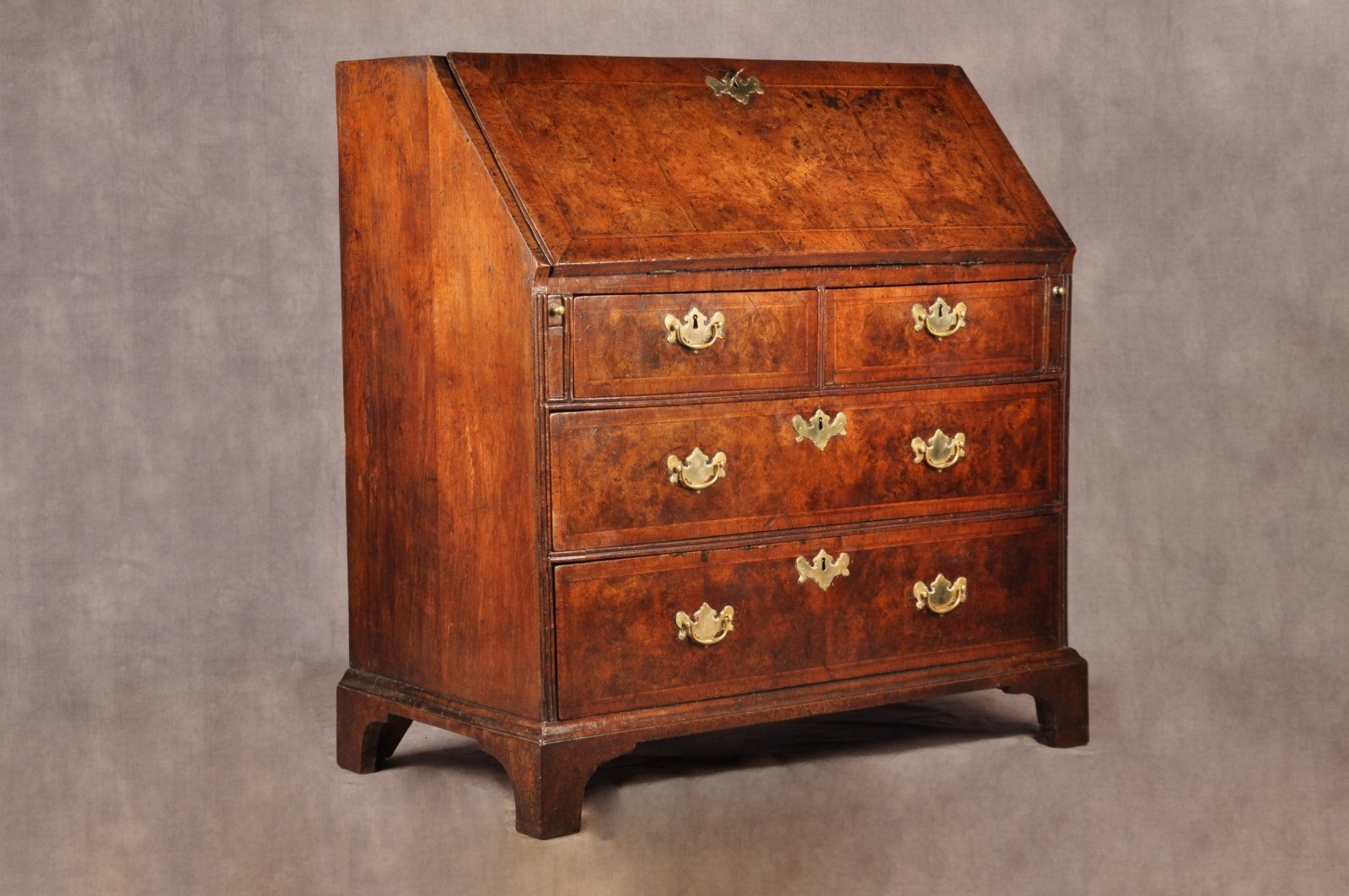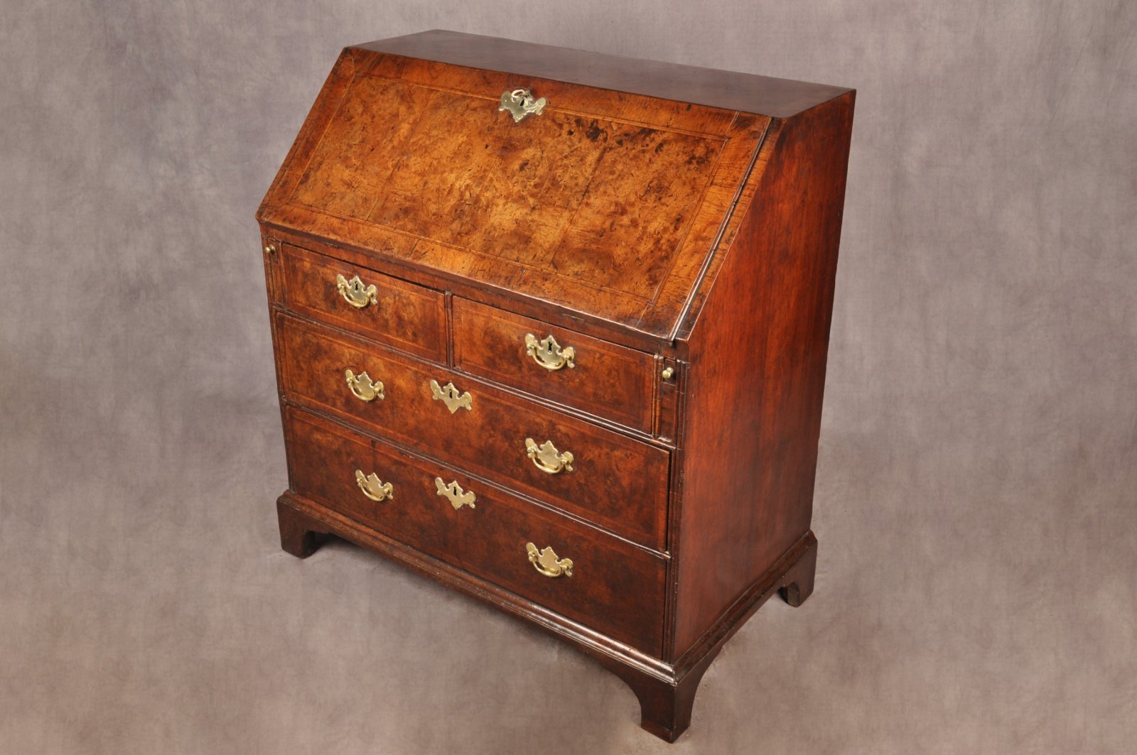 A fine Queen Anne Burr Walnut Bureau of absolutely glorious colour and patina with fitted interior also in Burr Walnut. In excellent original condition with matched veneers and feather banding throughout, having double bead decoration typical of this early period. The Oak drawer linings are in wonderful clean condition, the handles are replaced, remarkably for a piece of this age the front feet are original and have developed a wonderful skin.