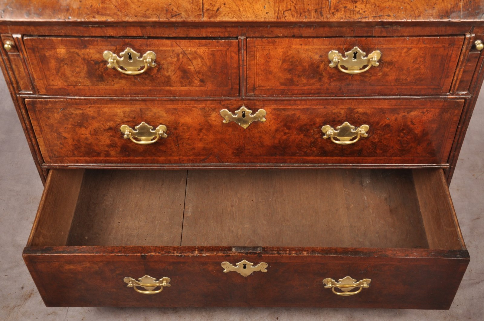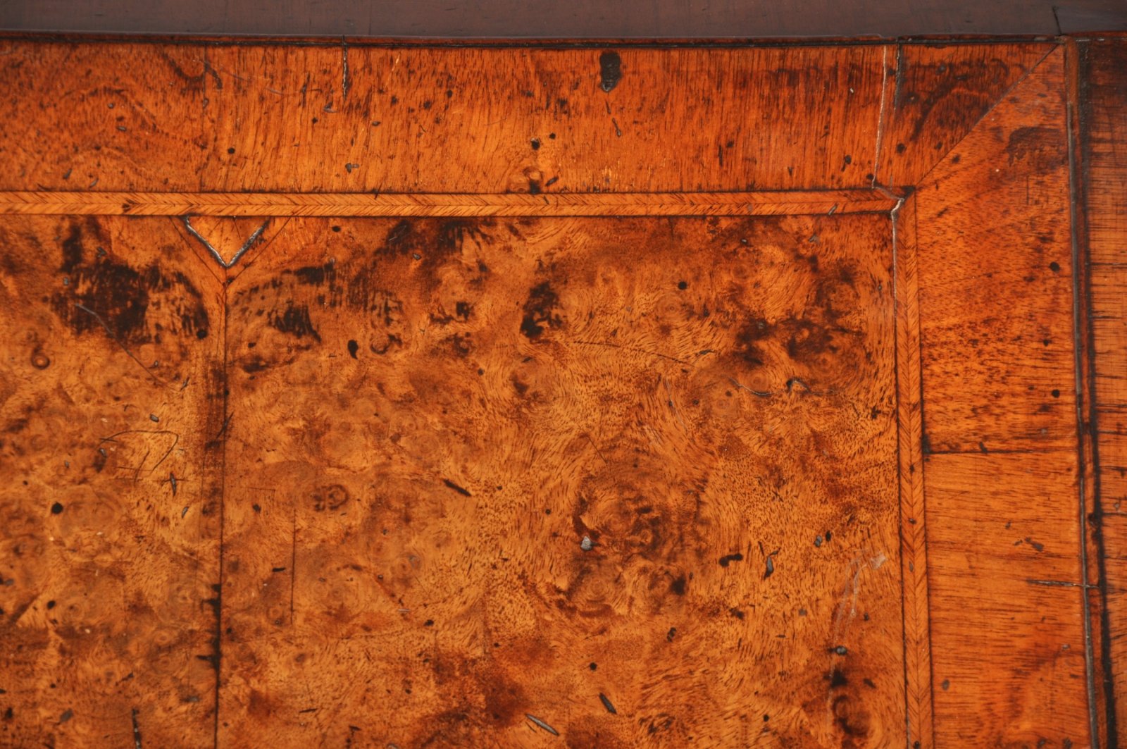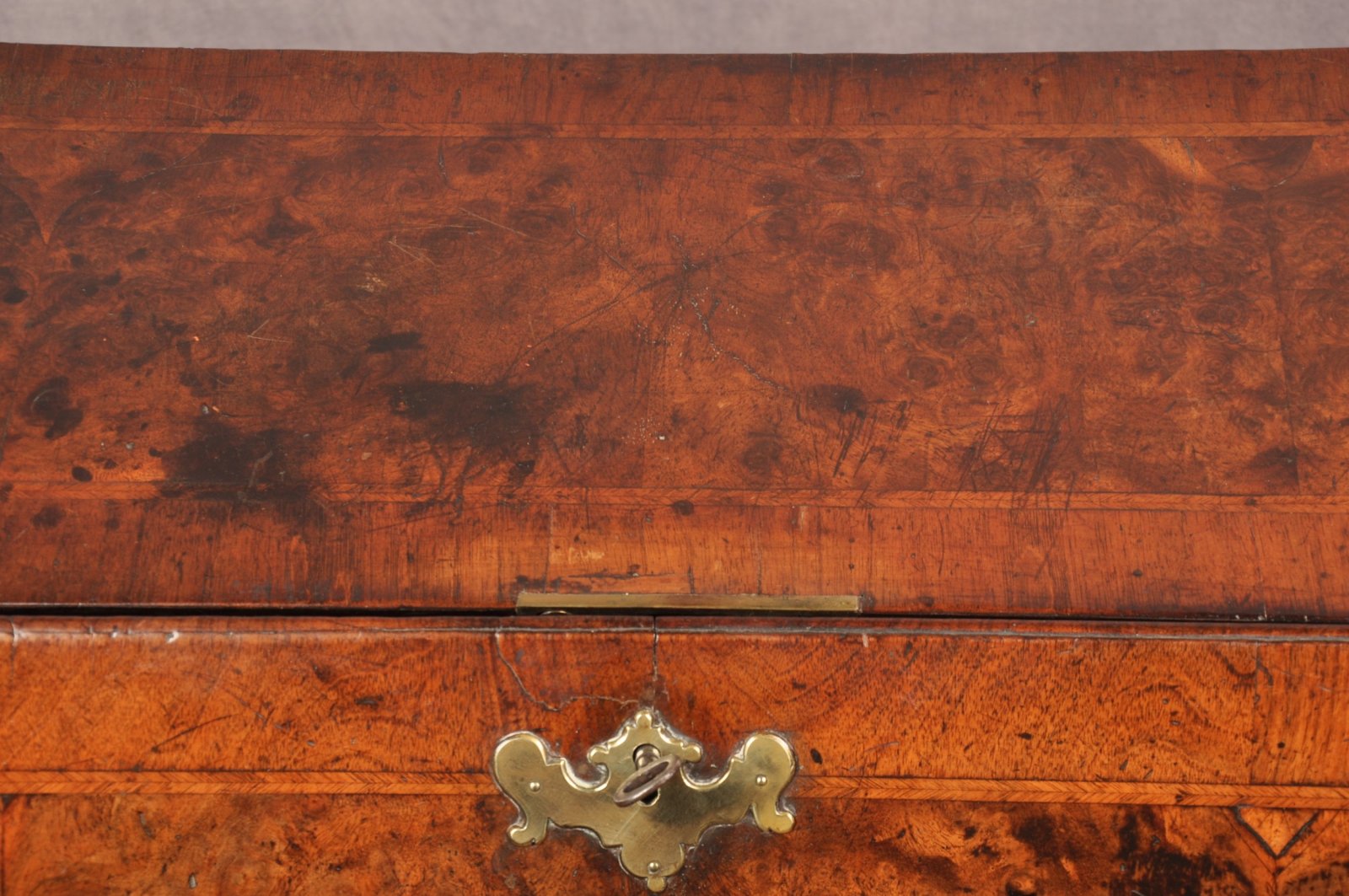 A fine Queen Anne Burr Walnut Bureau of absolutely glorious colour and patina with fitted interior also in Burr Walnut. In excellent original condition with matched veneers and feather banding throughout, having double bead decoration typical of this early period. The Oak drawer linings are in wonderful clean condition, the handles are replaced, remarkably for a piece of this age the front feet are original and have developed a wonderful skin.