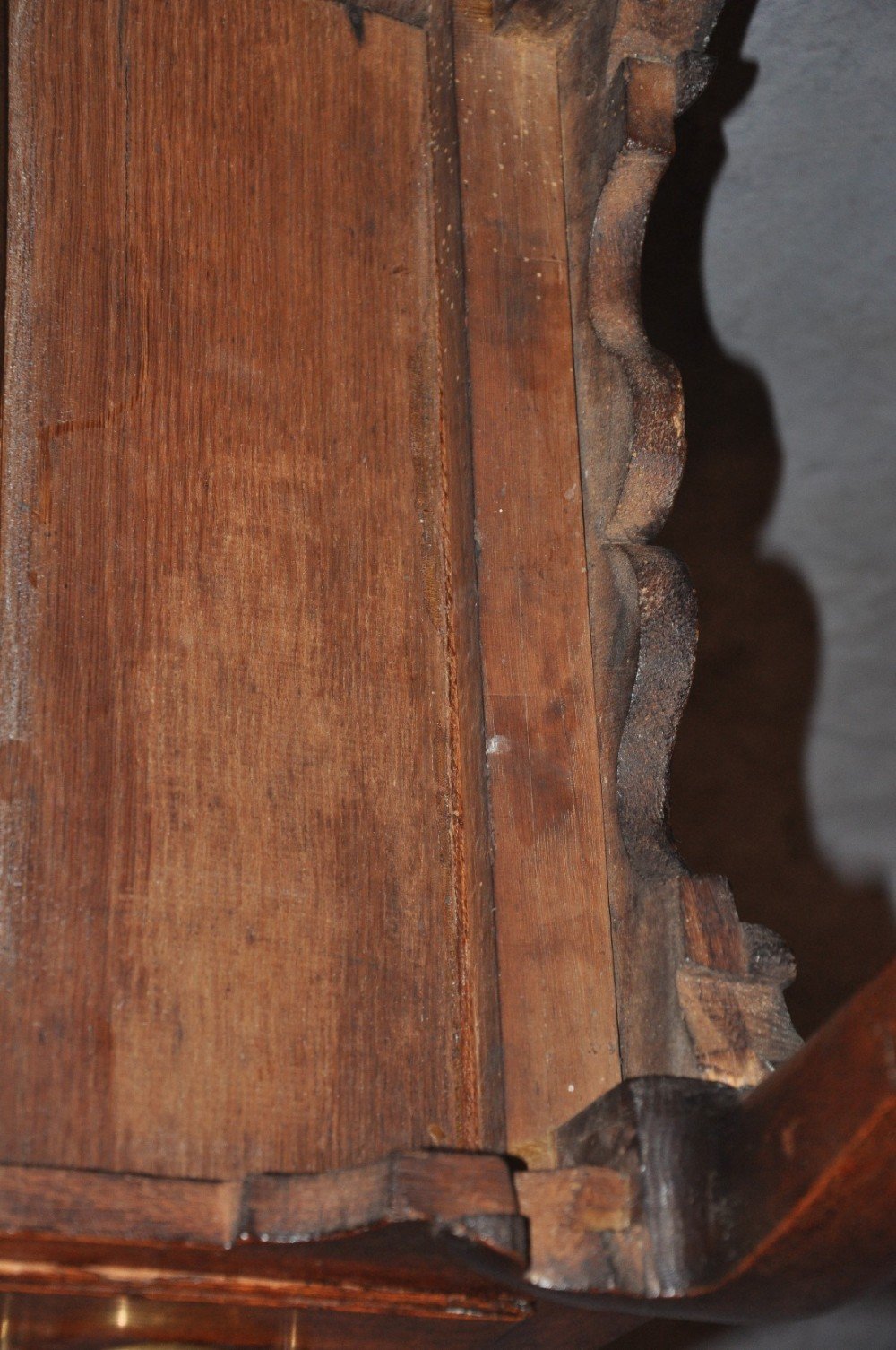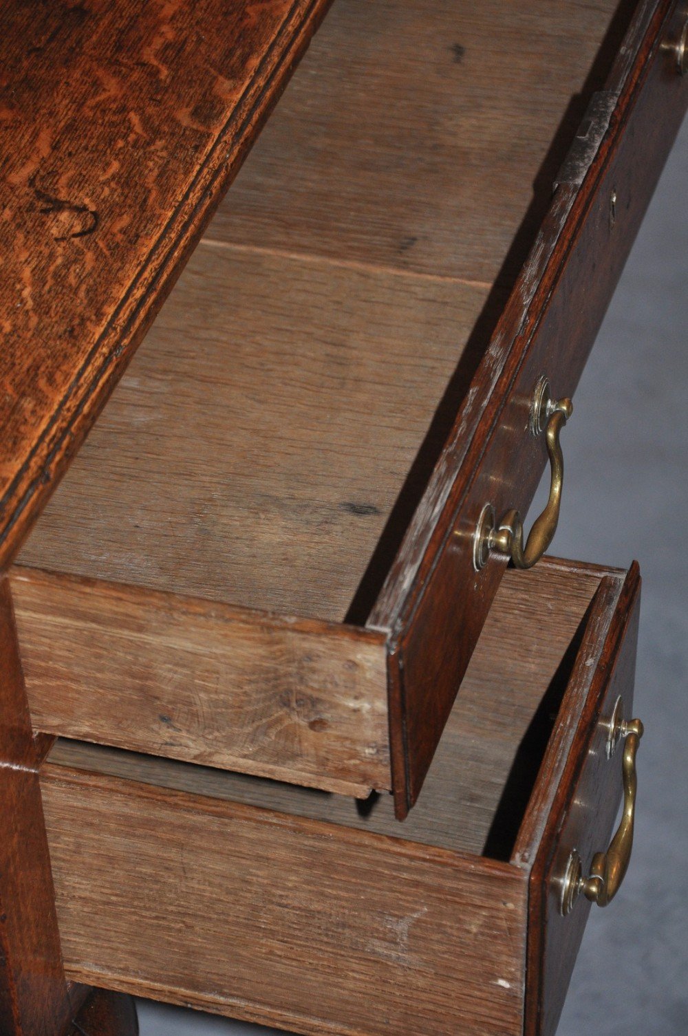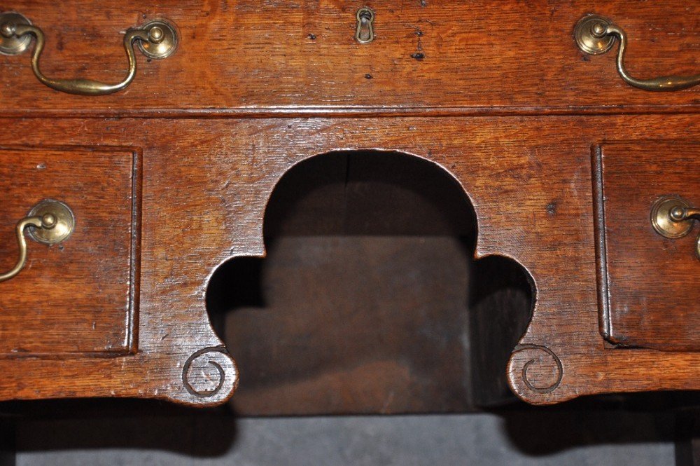A wonderful early 18th century Oak Lowboy in very good original condition. The shape of the leg is superb with nicely shaped ear piece and lovely beak foot, the freeze is particularly well shaped terminating in a neatly carved scroll at either side. The underneath surface is dry and untouched ,it is a light honey colour and the Oak is well figured. The handles have been replaced many years ago and date to the late 18th century.